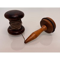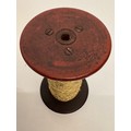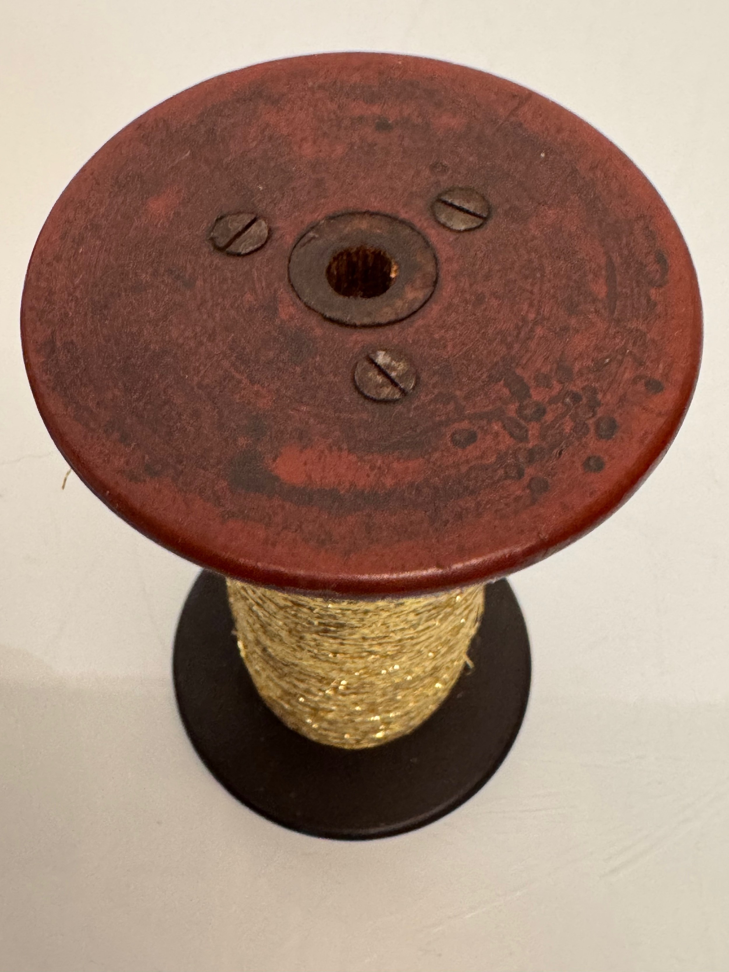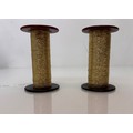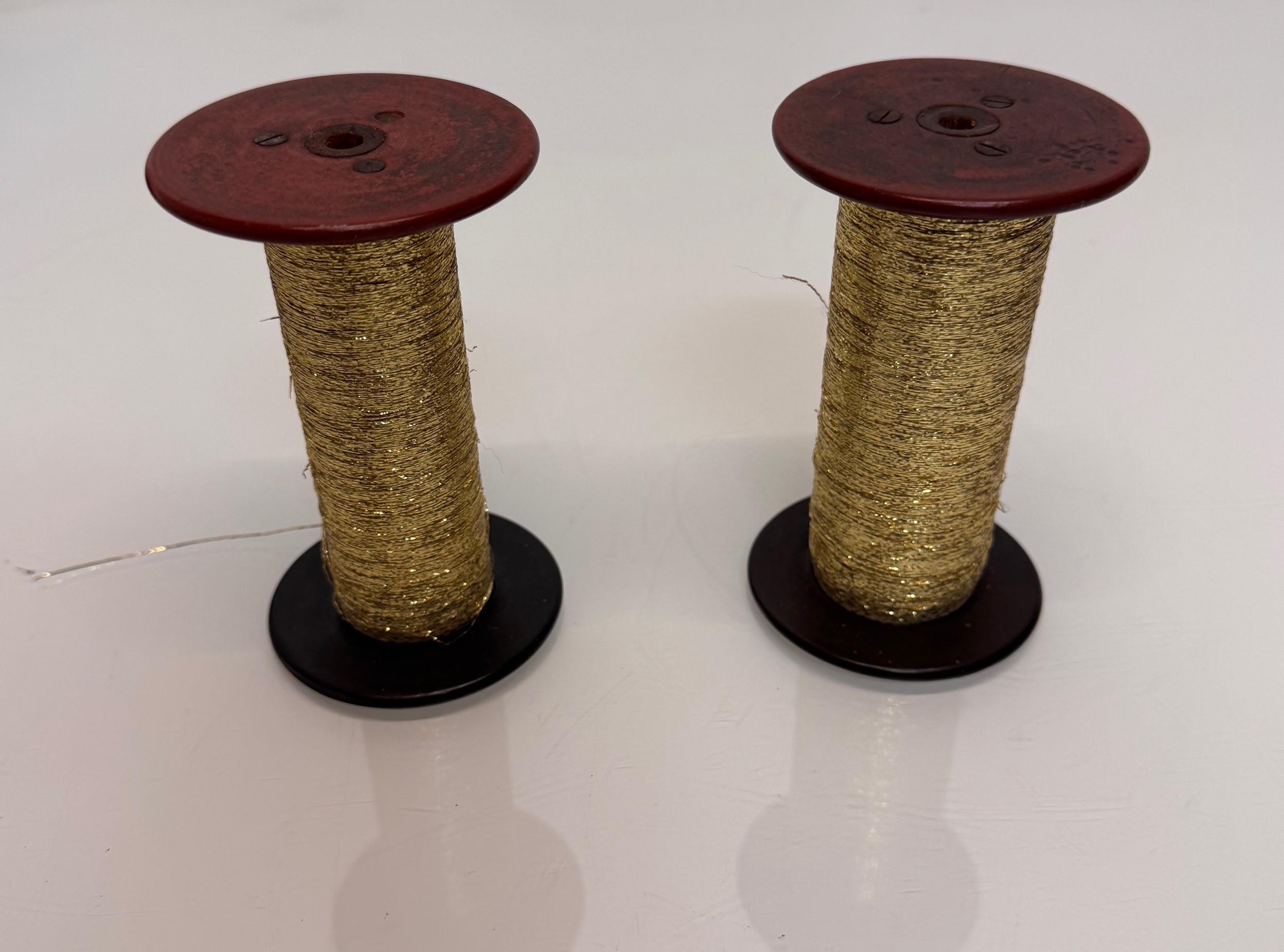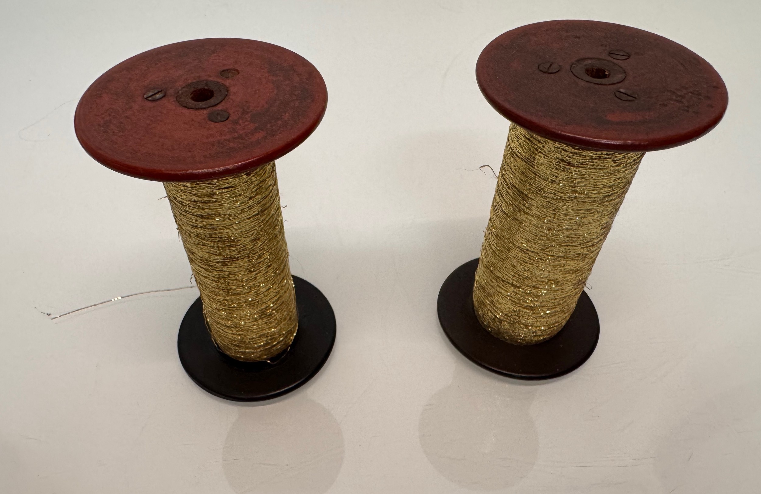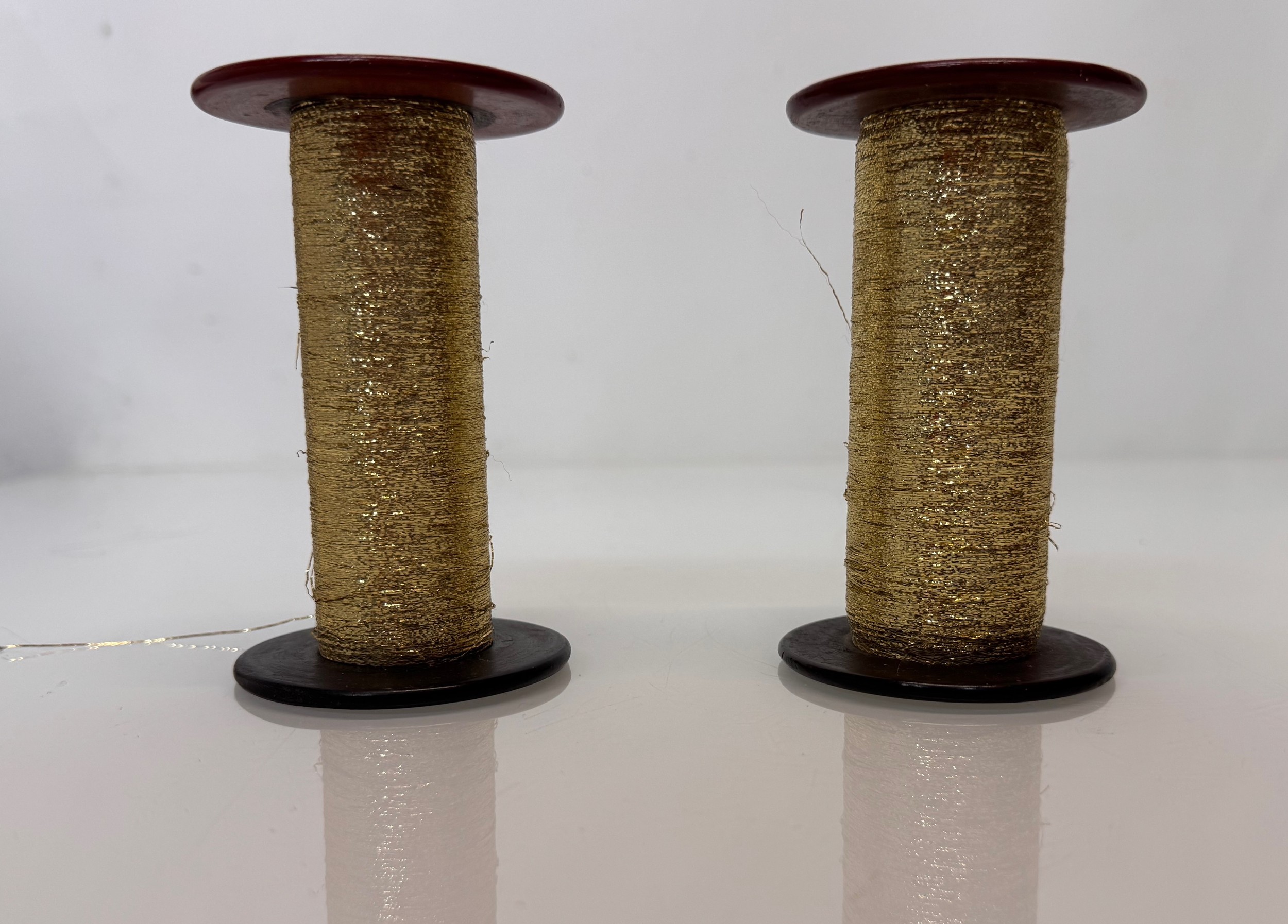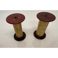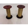 Two industrial wooden reels holding a fine gold coloured thread, both 11 cm high.