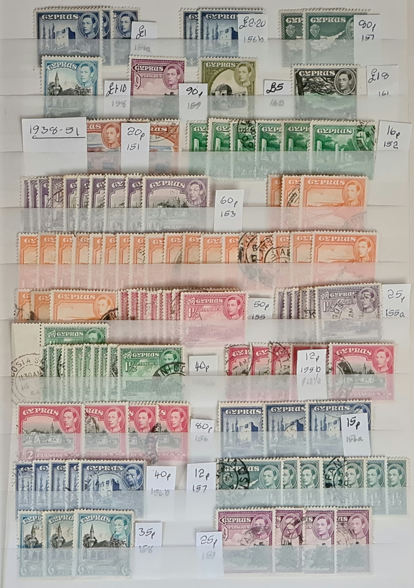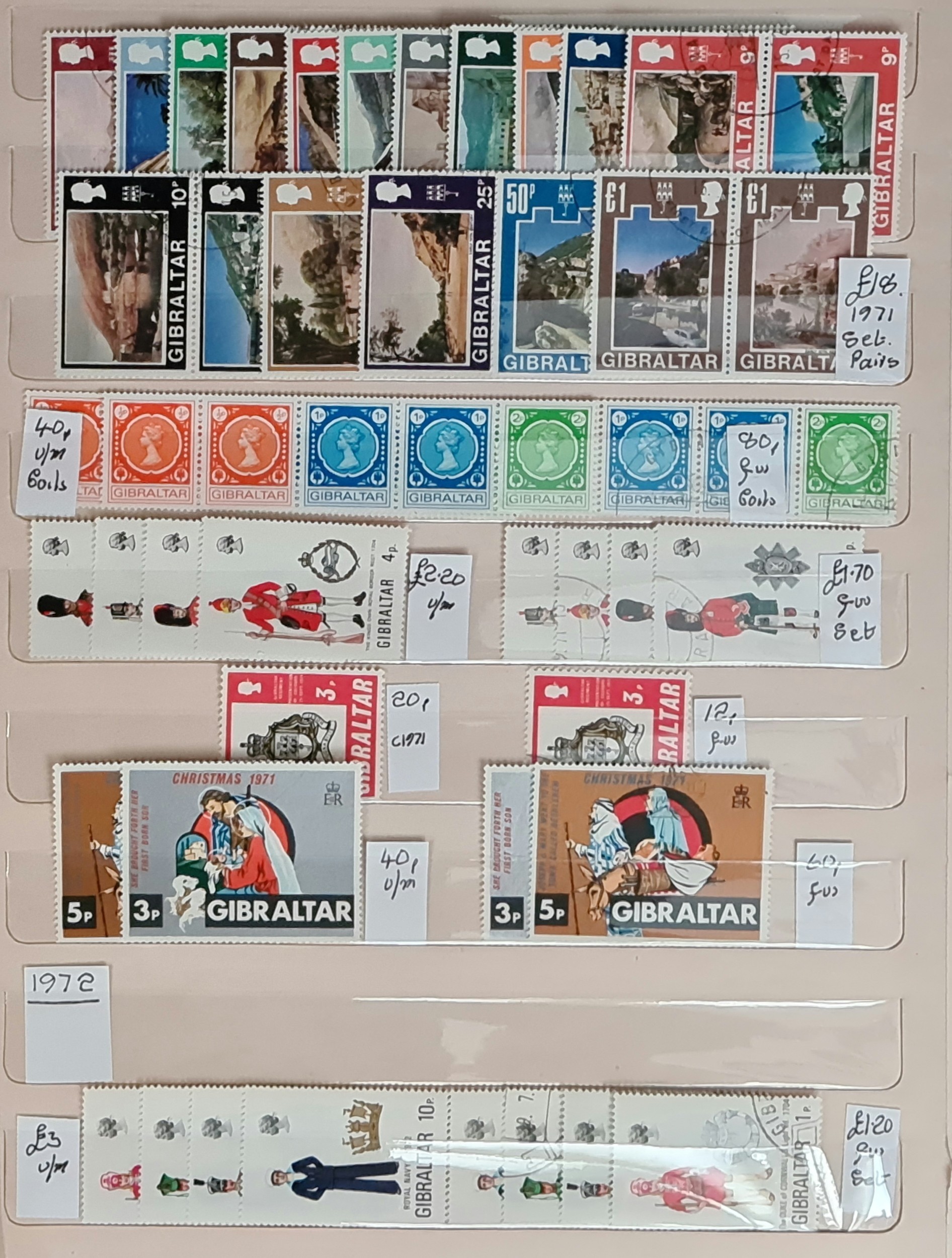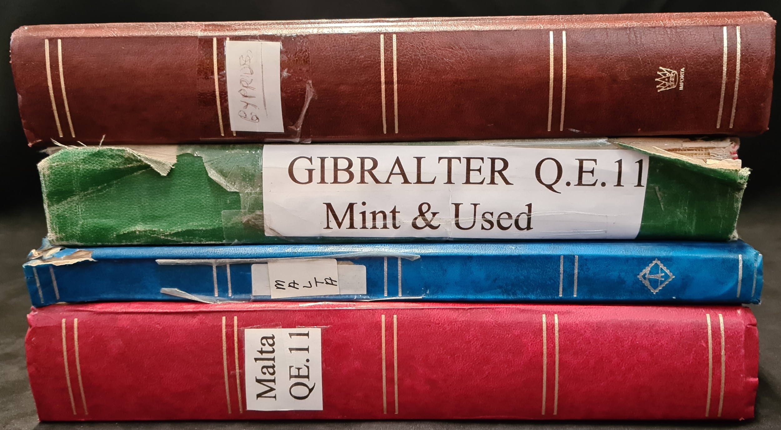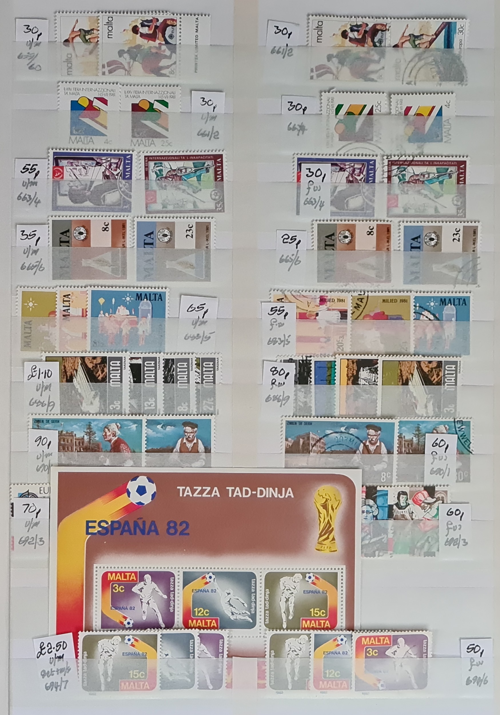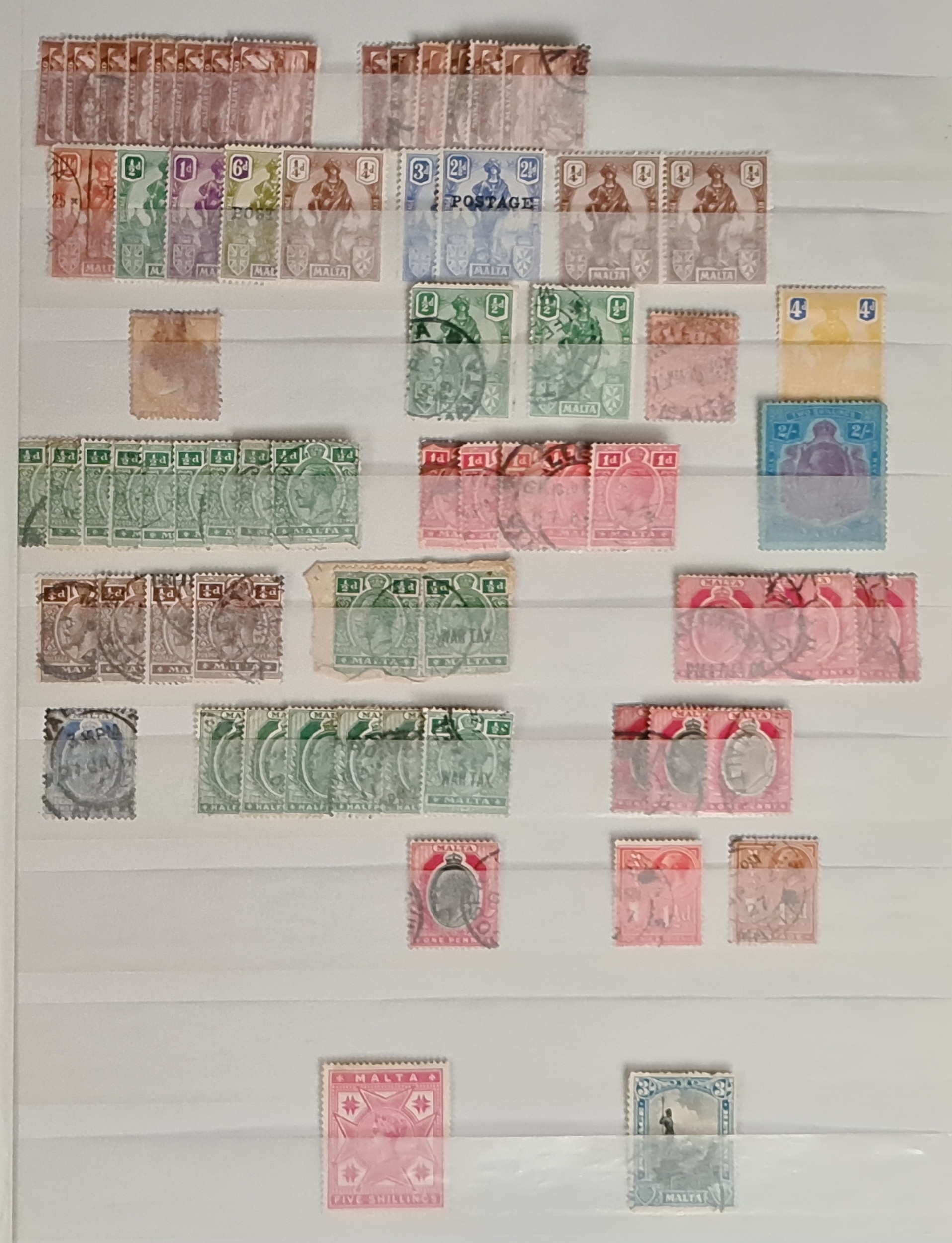 PREDOMINANTLY MODERN MEDITERRANEAN COLLECTIONS: A carton containing mint & used stamps in four stockbooks. Gibraltar 1953-2005 apparently all different inc. 1971 set in used pairs, 2000 £5 umm (SG942 cat. £13), m&u mini. sheets. Cyprus 1882-1999 inc. 1904 6pa mint (SG67 cat. £35), 1938 45pi mint (SG161 cat. £55) & mint mini.sheets. Malta mainly 1953-2010 with a few earlier such as 1860 5/- mint no gum (SG30 cat. £110) 1914 2/- used (SG86 cat. £50) & 1926 3/- used (SG207 cat. £70). Some pmk interest on 1953 issues and M&U mini. sheets. Good range of thematic interest. (large qty) Cross Reference: CYPRUS, GIBRALTAR, MALTA