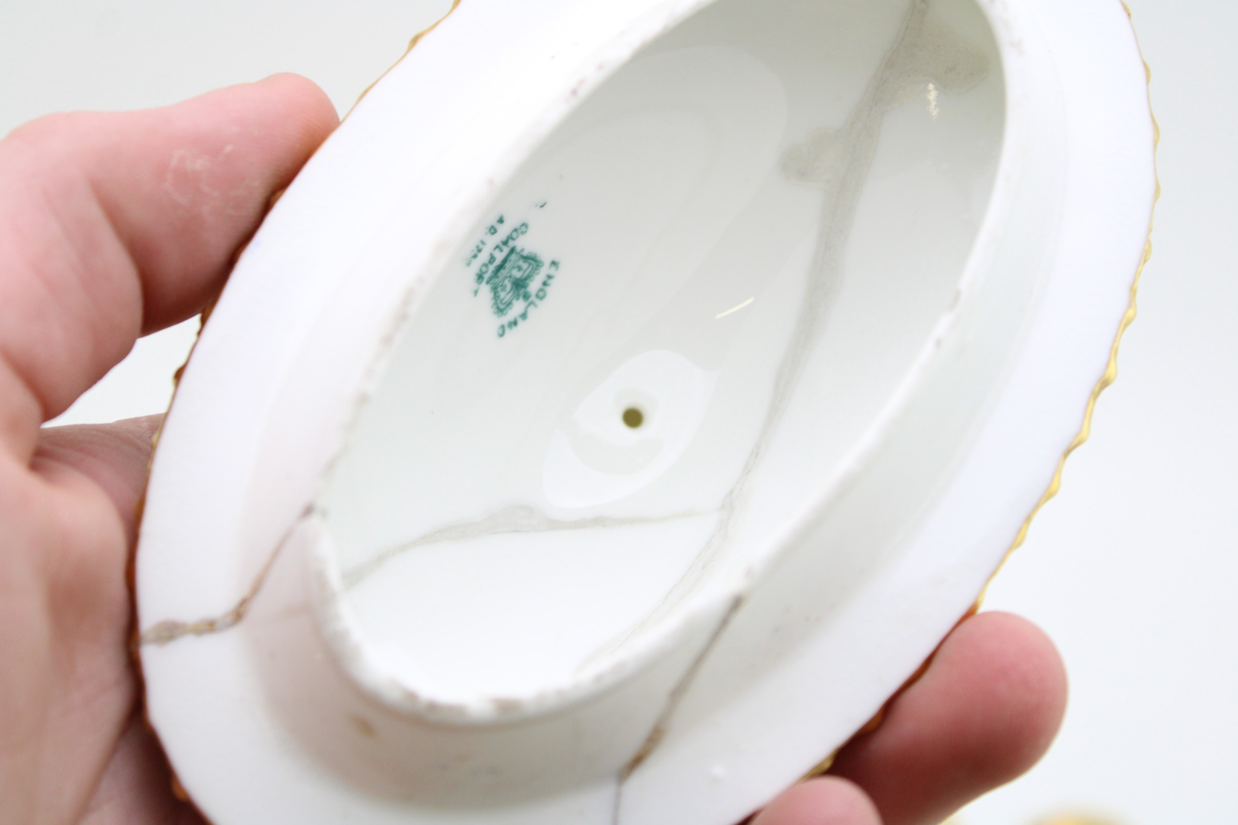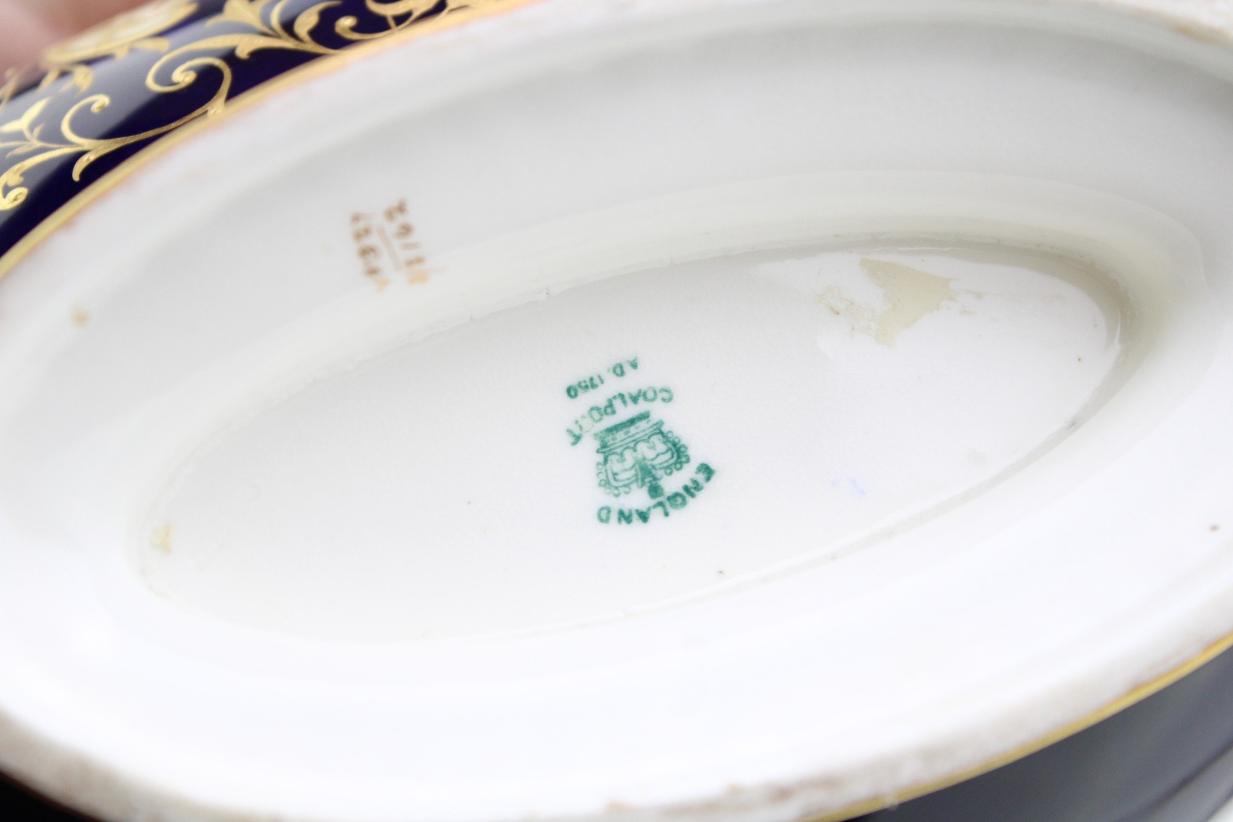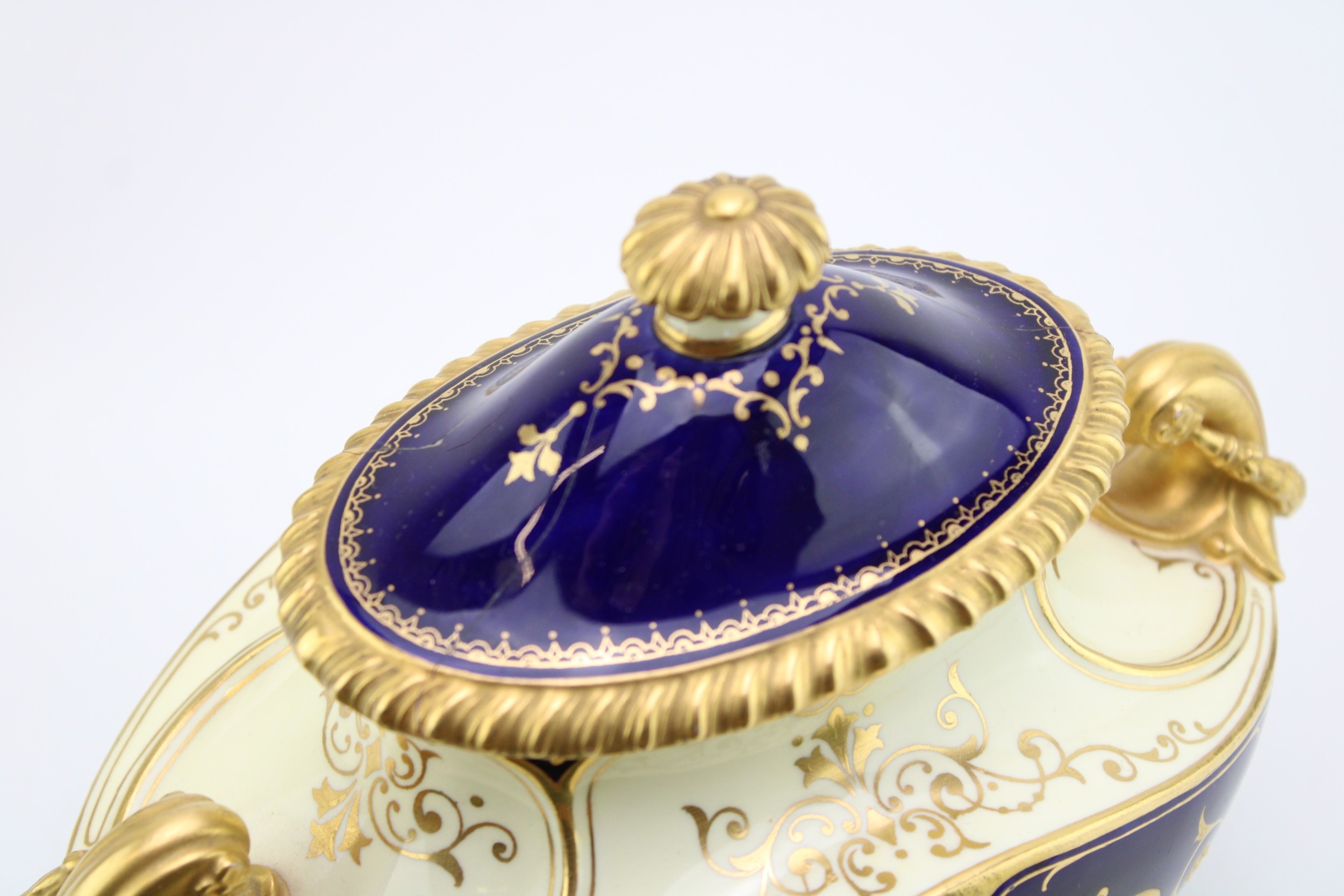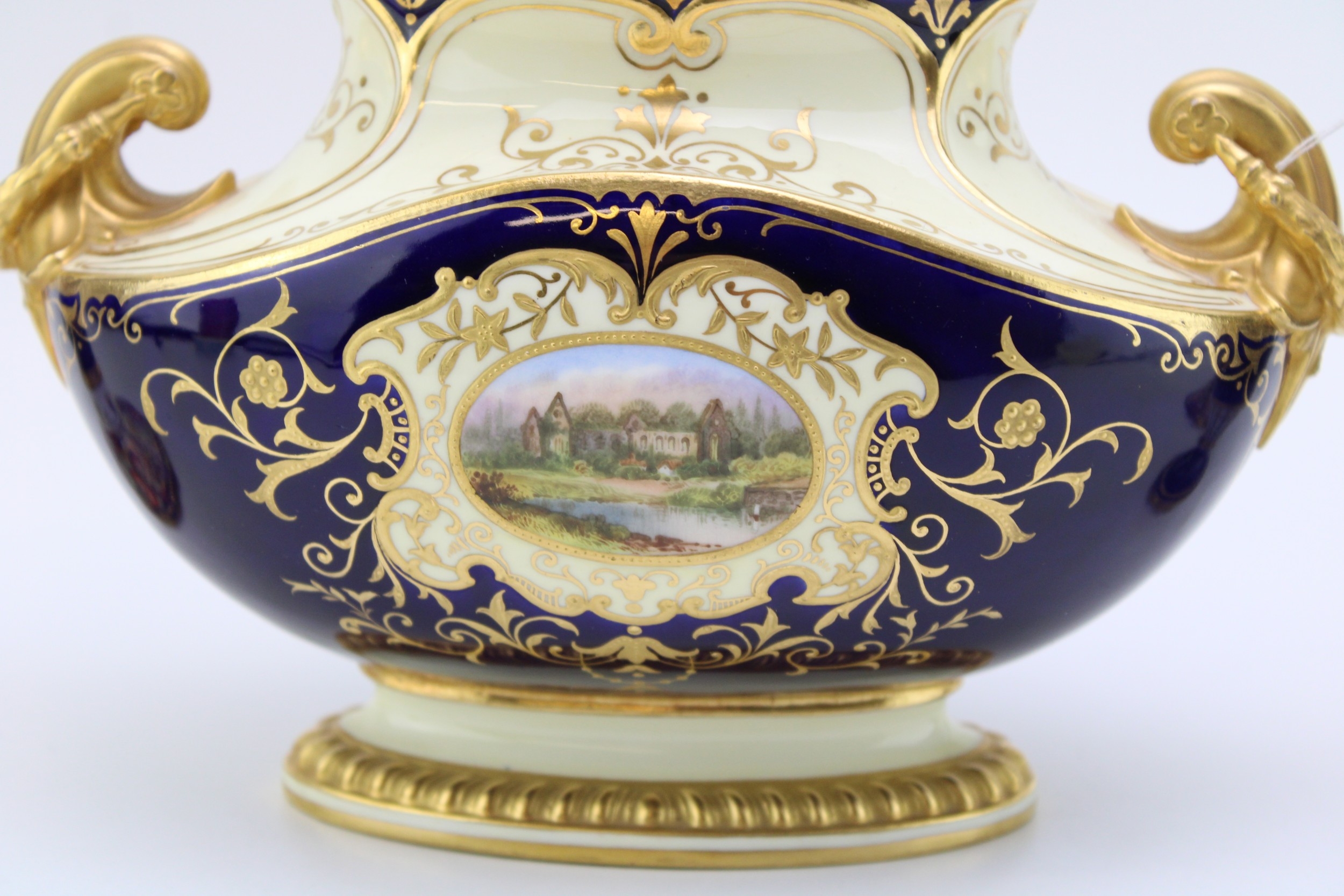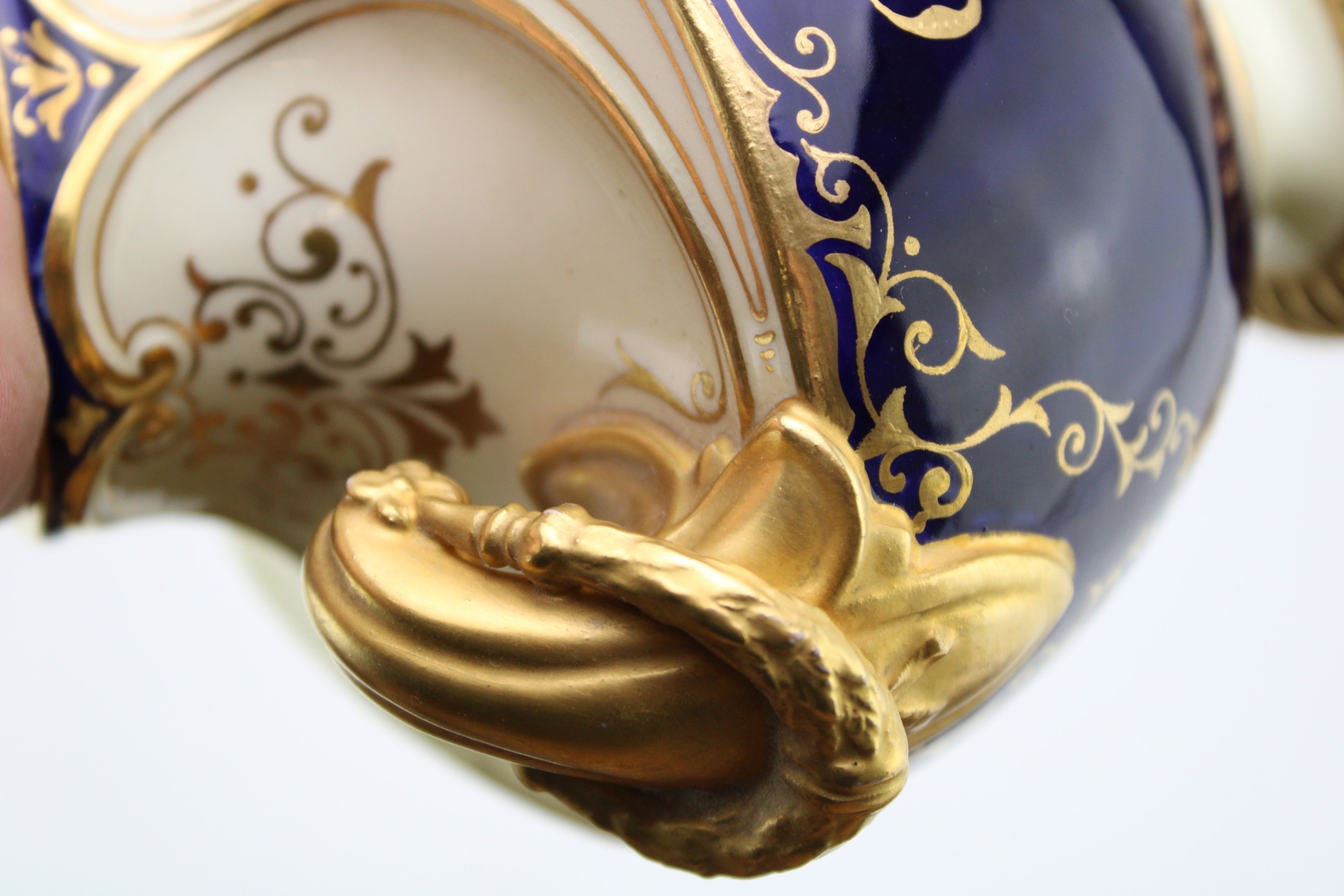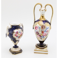 All pieces present well although showing minor flaws, crack to lid of Coalport two handled vase.