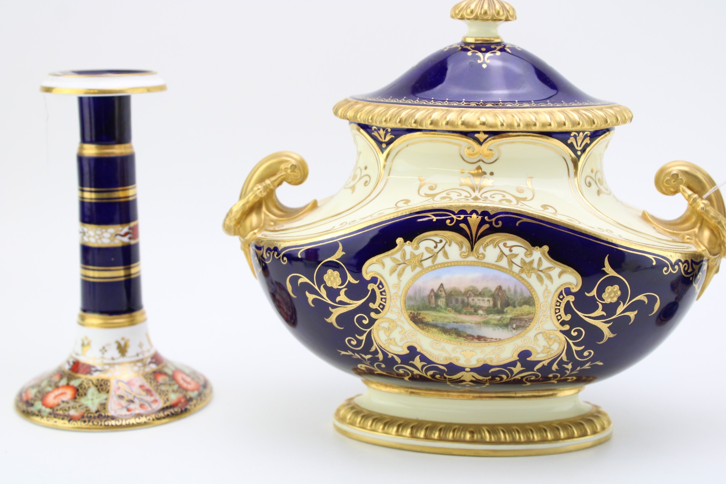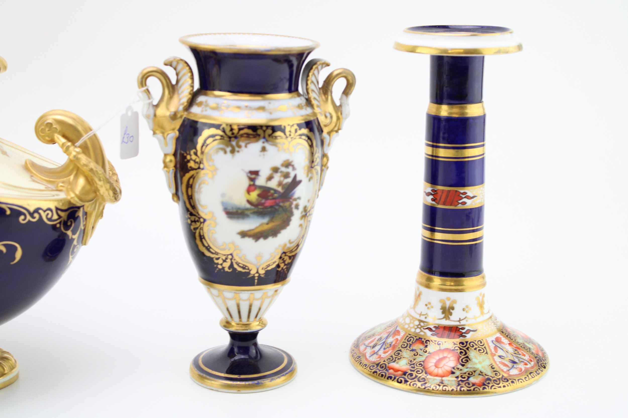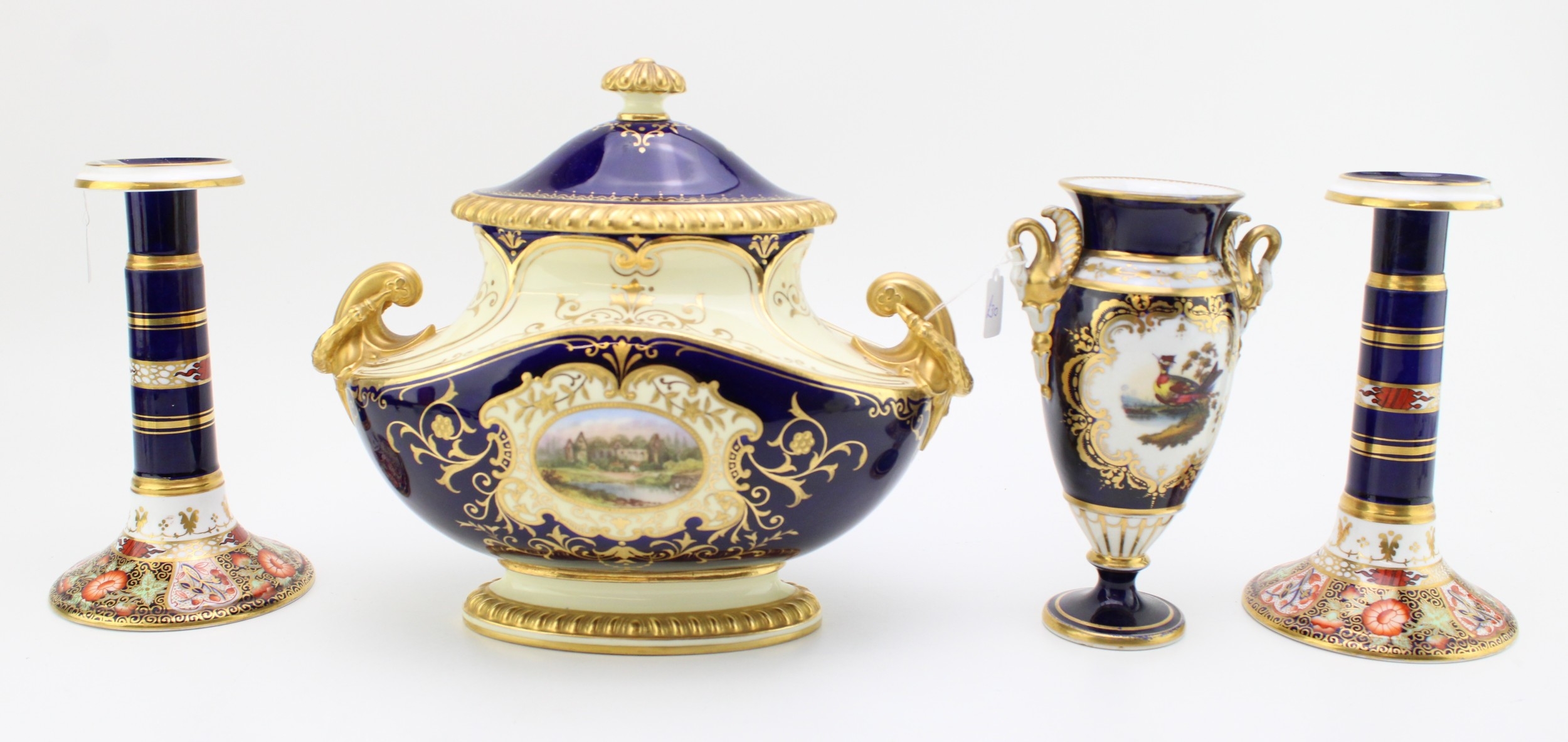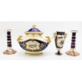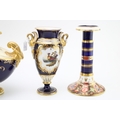 A collection of early ceramics to include Coalport two handled landscape vase, Collingwood Bros pair of candlesticks, together with a two handle vase, cobalt blue ground with gilt decoration c19th century, 20cm tall, (4).