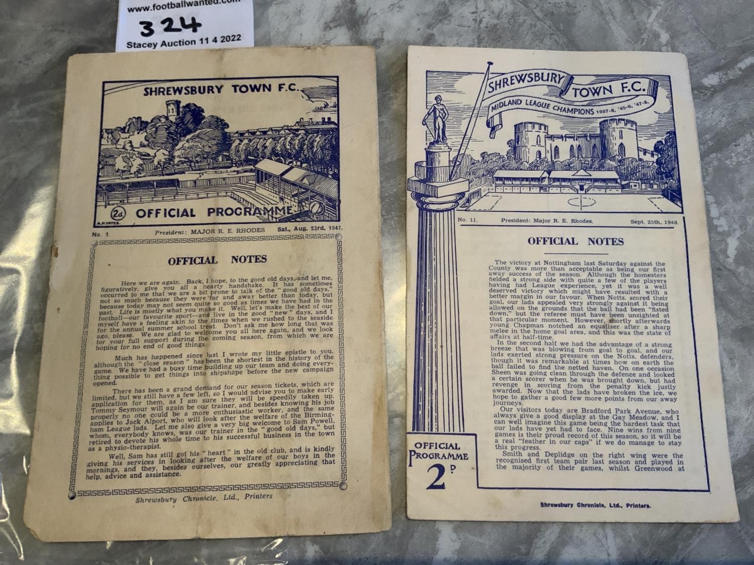 1940s Shrewsbury Town v Bradford Park Avenue Football Programmes: Both Midland league with no team changes. 47/48 has tiny piece out of bottom corner and rusty staple holding firm, 48/49 is excellent. (2)