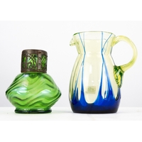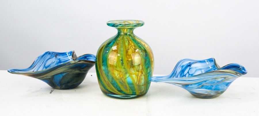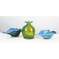 MDINA CRYSAL BLUE STRIPE GLASS VASE, 5 ¾” (14.6cm) high, together with a PAIR OF VALETTA MOTTLED BLUE LEAF SHAPED DISHES, 7 ½” x 5”, etched marks, (3) C/R- all good, no visible faults or damage