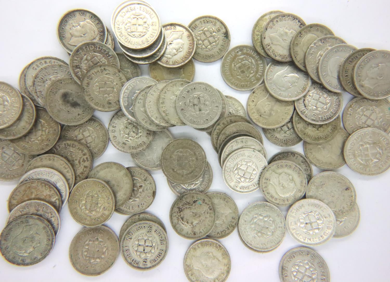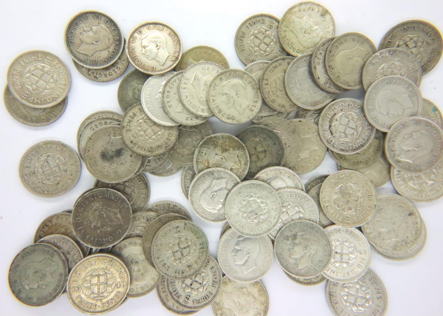 Seventy eight silver threepenny pieces, dates 1937-1950, mixed grades. P&P Group 1 (£14+VAT for the first lot and £1+VAT for subsequent lots)