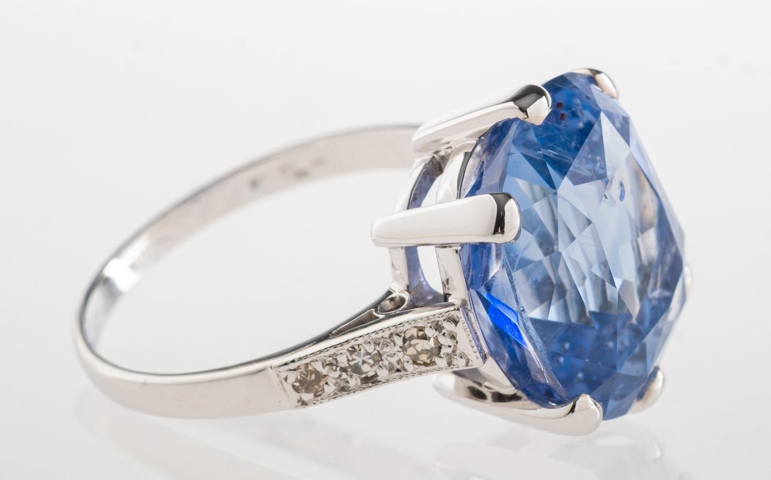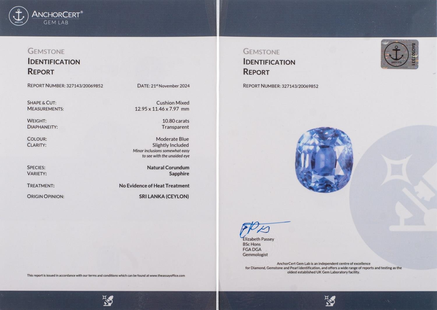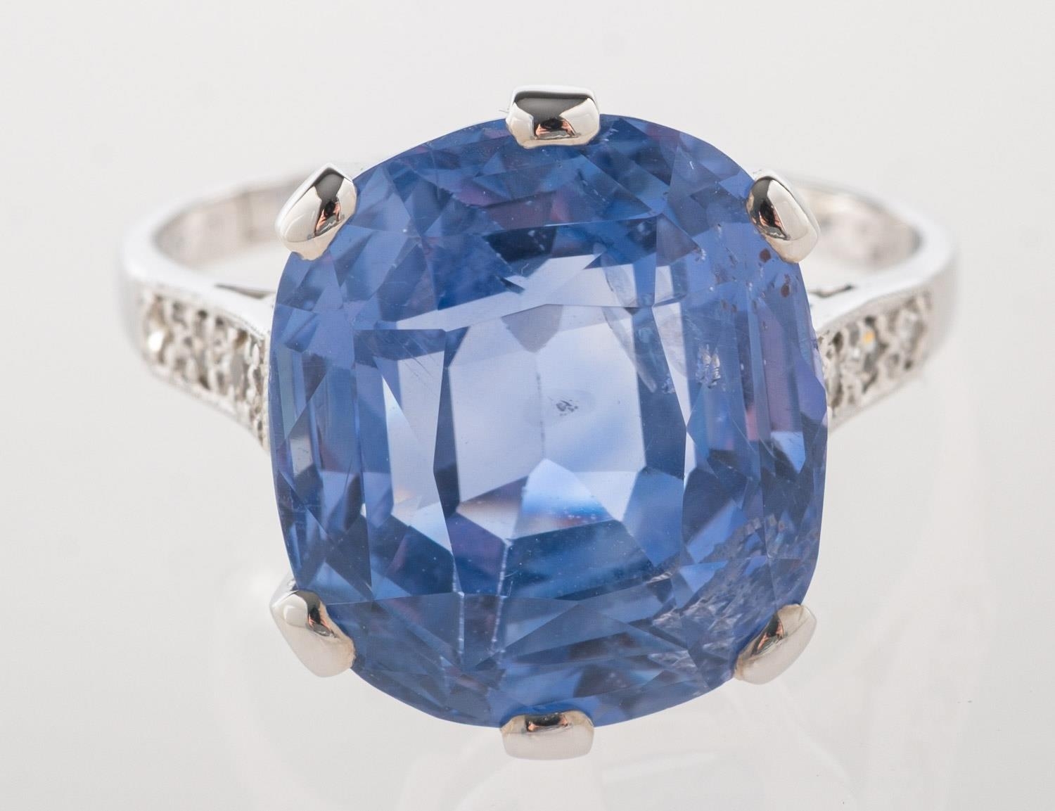 A fine and impressive Ceylon sapphire and diamond ring, claw set with a mixed cushion-cut no heat Ceylon sapphire, sapphire approx. 10.80 carats, measuring approx. 12.95mm x 11.46mm x 7.97mm, of moderate blue and slightly included, (minor inclusions can be seen with the naked eye); grain set to each shoulder with three single-cut diamonds, (six in total), diamonds approx. 0.10 carat total, indistinct mark for 18ct, other indistinct marks, size K, 5.7grams; accompanied by a Gemstone Identification Report from Anchorcert Gem Lab, report number 327143/20069852, dated 21st November 2024, stating Natural Corrundum Sapphire, no evidence of heat treatment, Sri Lanka, (Ceylon); and a photocopy of a Valuation for Insurance by Birmingham Assay Office, dated 15/01/25 for £21,000.00.