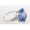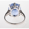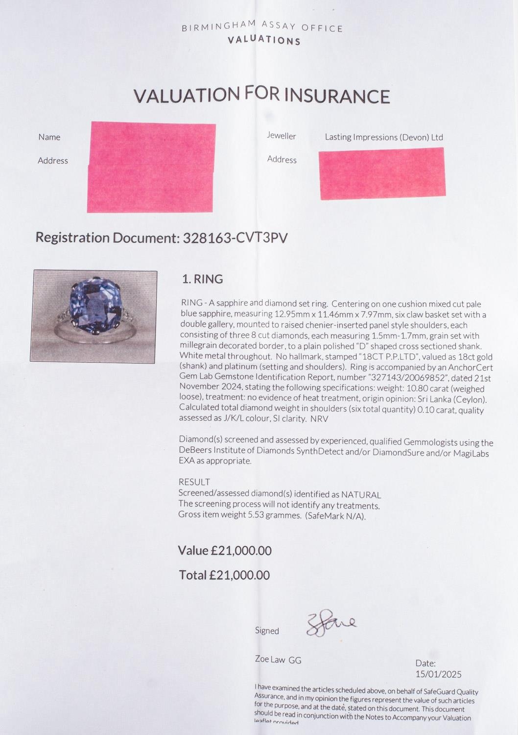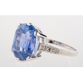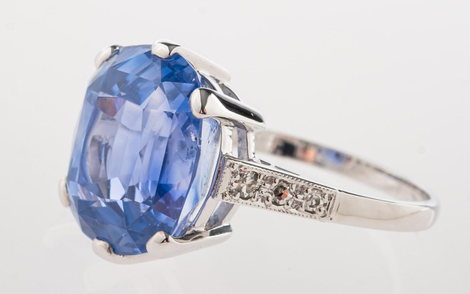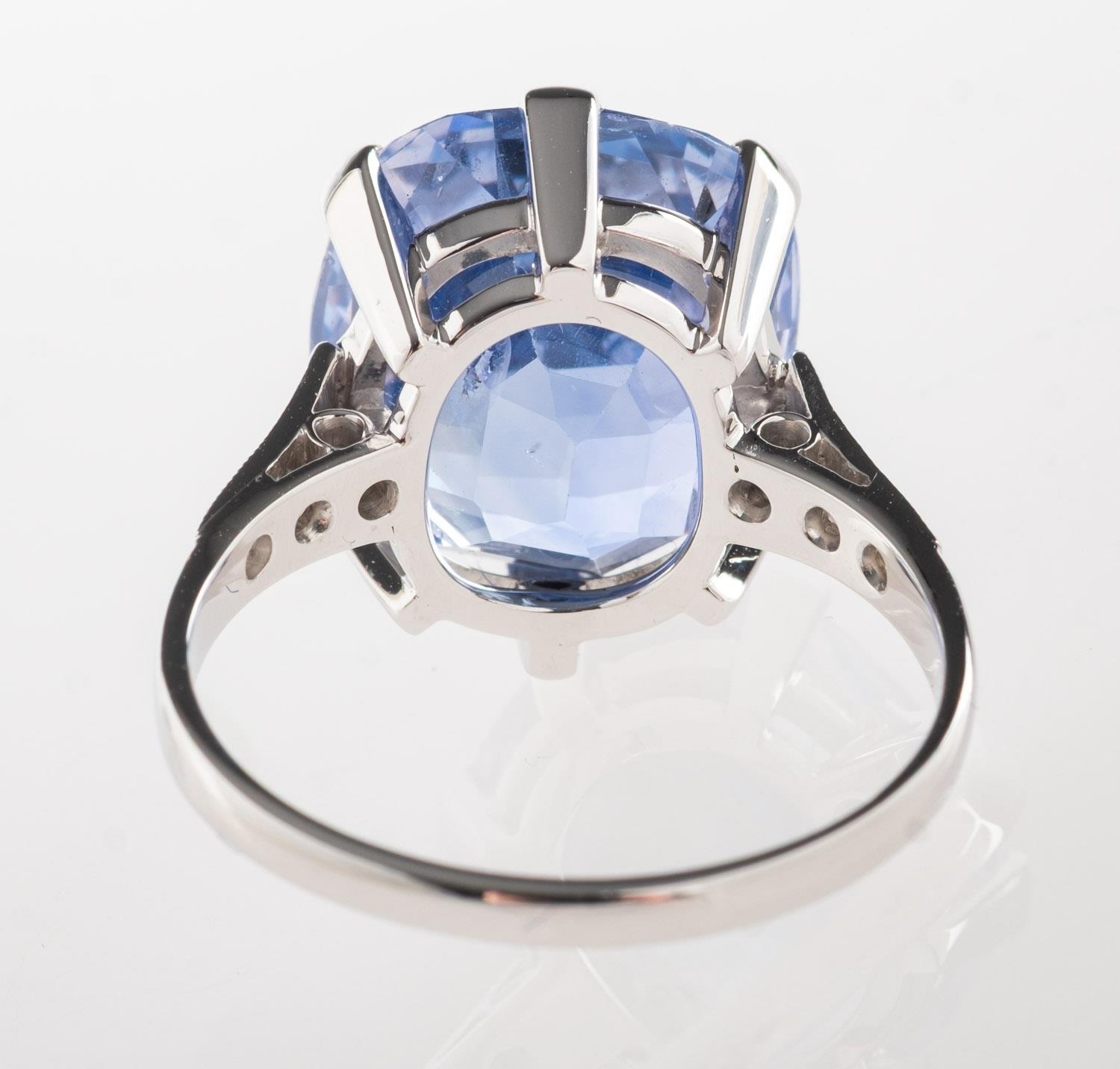 A fine and impressive Ceylon sapphire and diamond ring, claw set with a mixed cushion-cut no heat Ceylon sapphire, sapphire approx. 10.80 carats, measuring approx. 12.95mm x 11.46mm x 7.97mm, of moderate blue and slightly included, (minor inclusions can be seen with the naked eye); grain set to each shoulder with three single-cut diamonds, (six in total), diamonds approx. 0.10 carat total, indistinct mark for 18ct, other indistinct marks, size K, 5.7grams; accompanied by a Gemstone Identification Report from Anchorcert Gem Lab, report number 327143/20069852, dated 21st November 2024, stating Natural Corrundum Sapphire, no evidence of heat treatment, Sri Lanka, (Ceylon); and a photocopy of a Valuation for Insurance by Birmingham Assay Office, dated 15/01/25 for £21,000.00.
