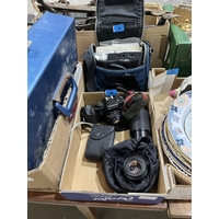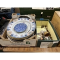 A box of ceramics and a box of coins and sundries.