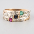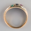 A 9ct gold ruby, sapphire and emerald diamond ring. Approx ring size P, hallmarked 9ct gold, approx gross weight 3.10 grams.