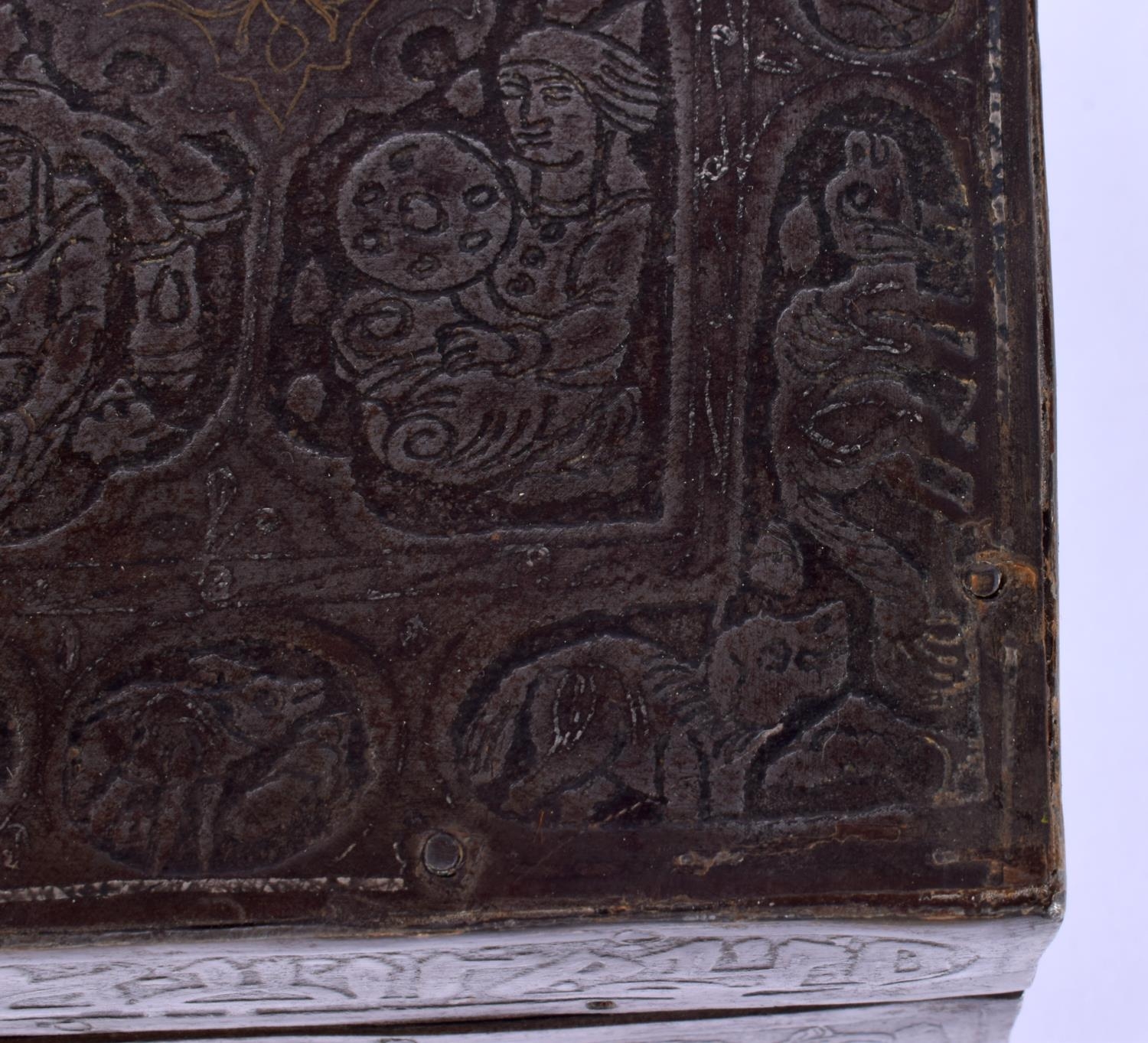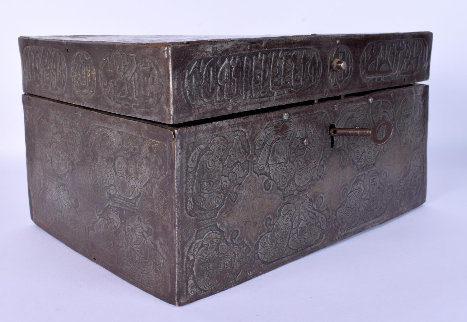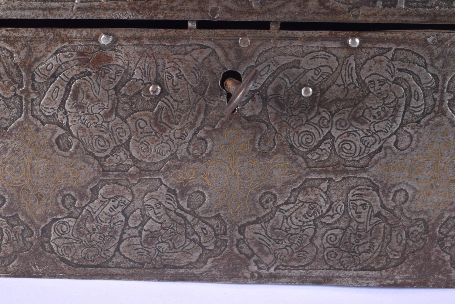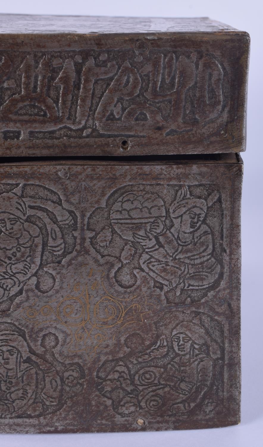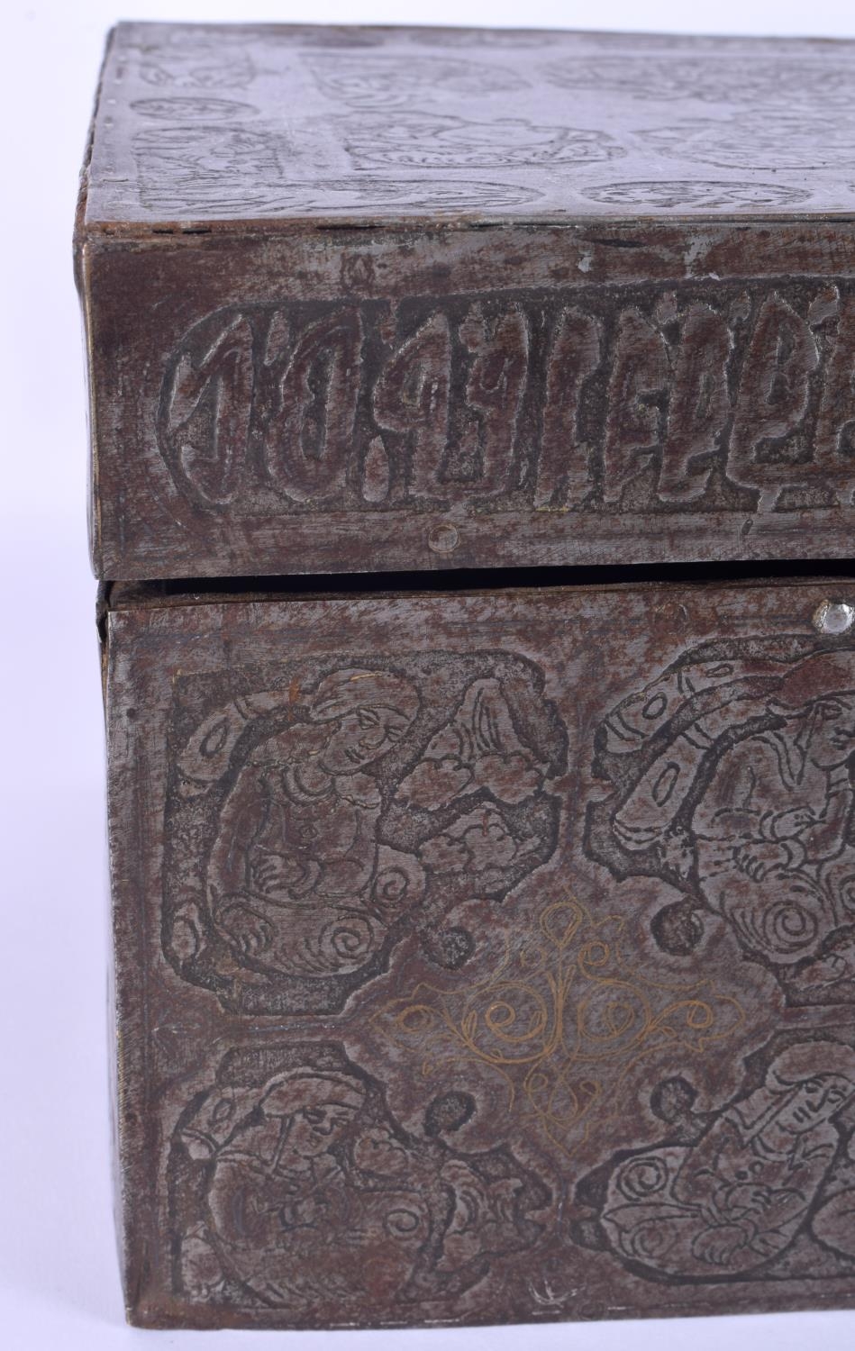 A RARE 18TH/19TH CENTURY PERSIAN SAFAVID STEEL GOLD INLAID CASKET decorated wall over with kufic script and figures in various pursuits. 26 cm x 14 cm x 18 cm.