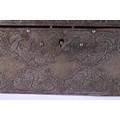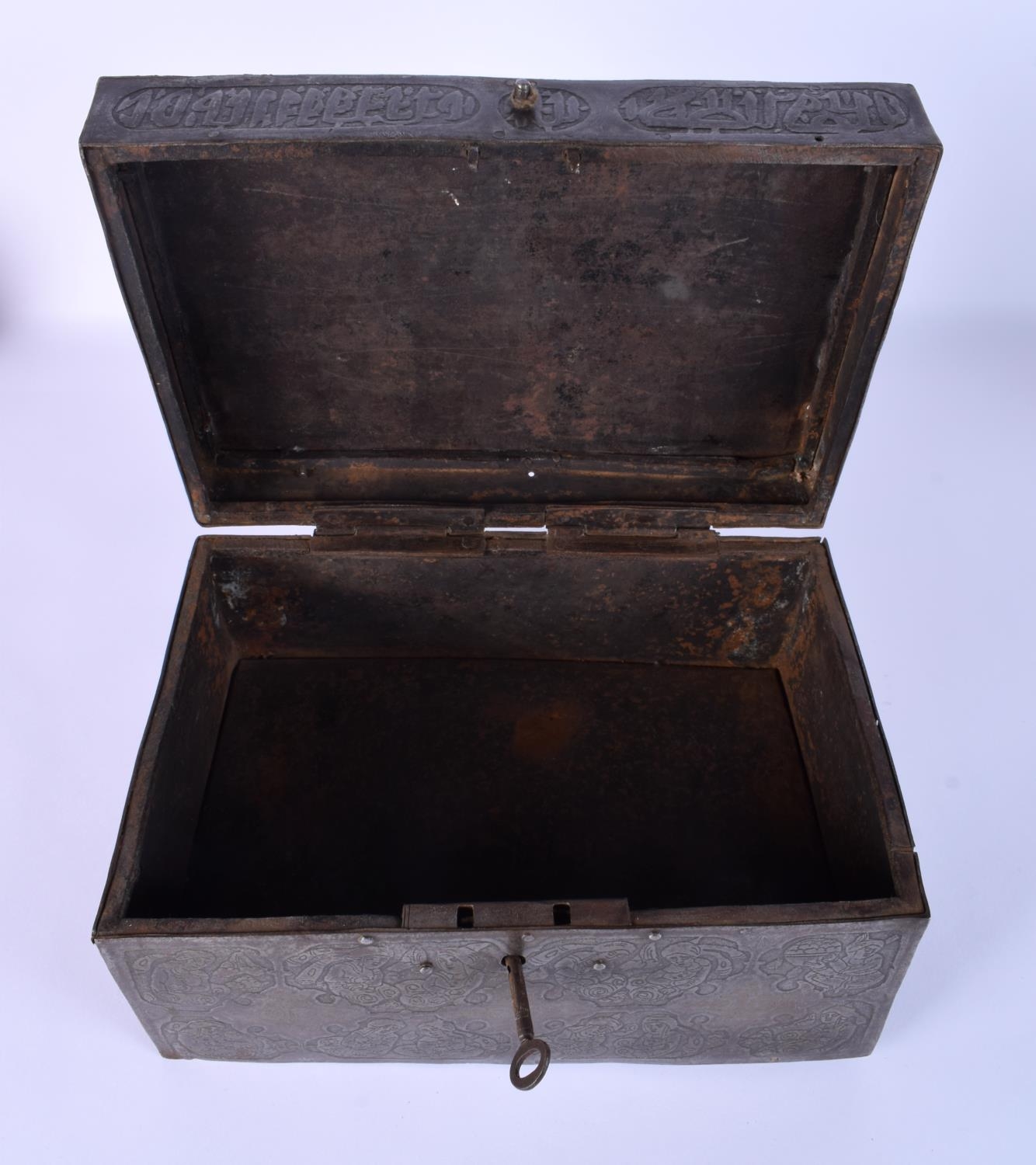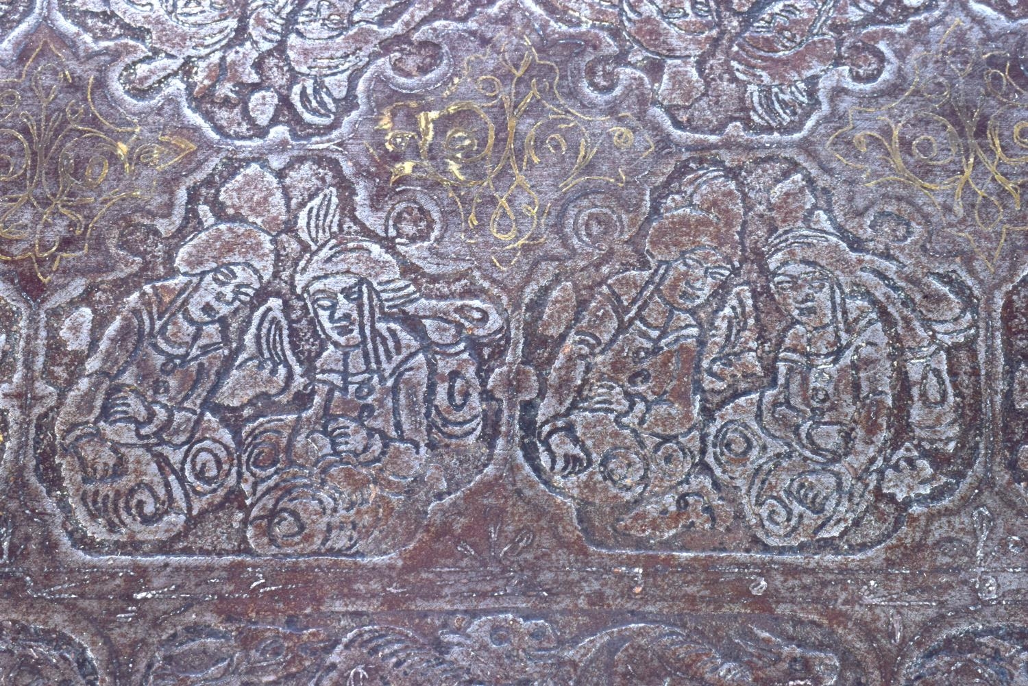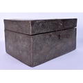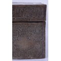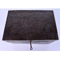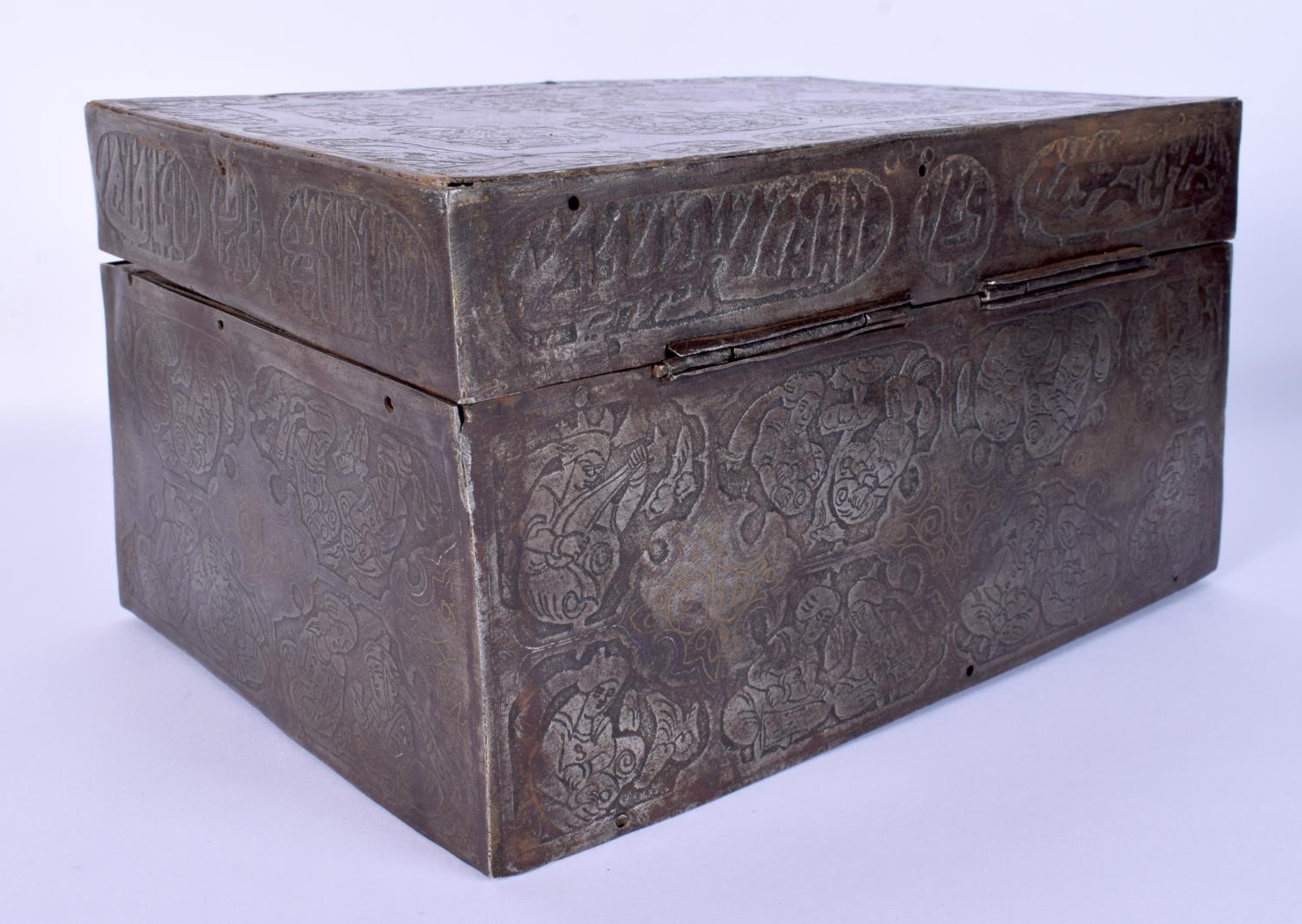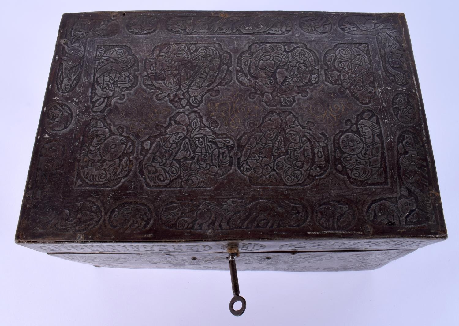 A RARE 18TH/19TH CENTURY PERSIAN SAFAVID STEEL GOLD INLAID CASKET decorated wall over with kufic script and figures in various pursuits. 26 cm x 14 cm x 18 cm.