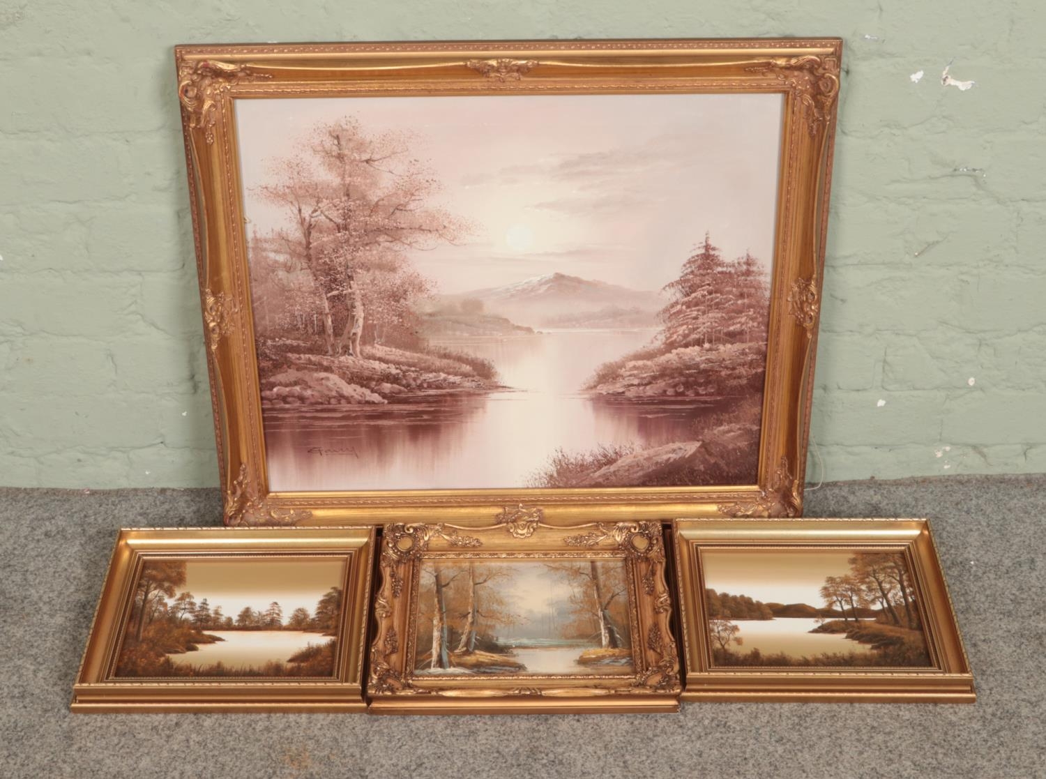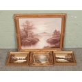 A gilt framed oil on canvas depicting a lake scene, with trees to either side and mountains to the background, together with three similar small examples.