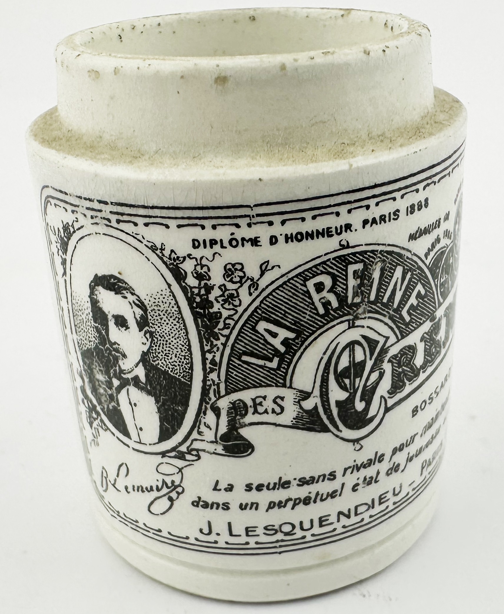 LA REINE DES CREMES BEAUTY POT. APL p88. 2ins tall. J Lesquendieu, Paris, France. Hairline & nick.