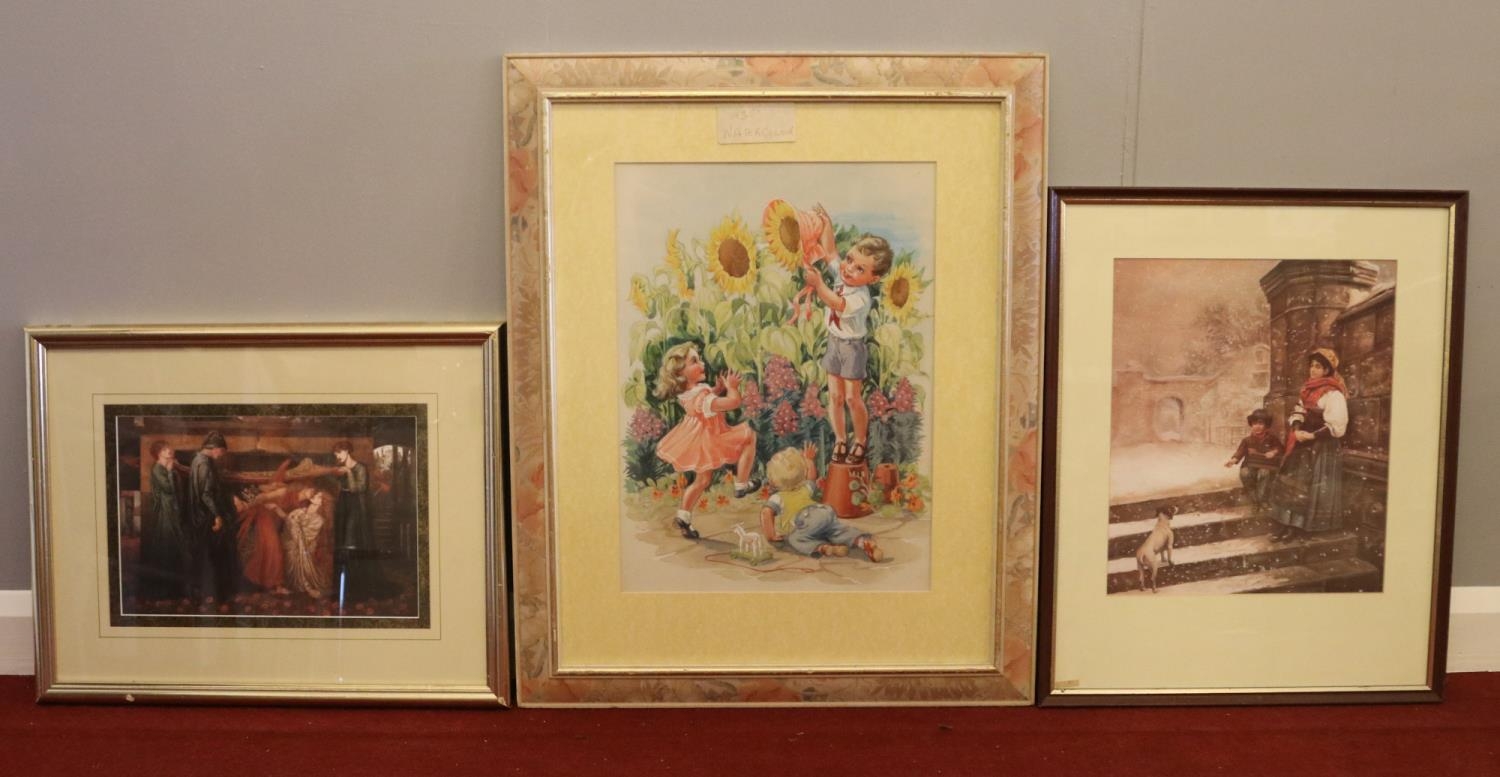 Three framed pictures - comprising of a watercolour illustration signed in pencil by 'M Sinclair' and a print by 'Rossetti' of Dante's Dream at the time of the Death of Beatrice as examples etc.