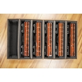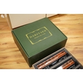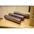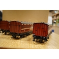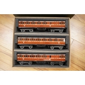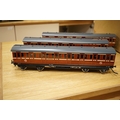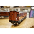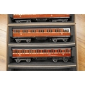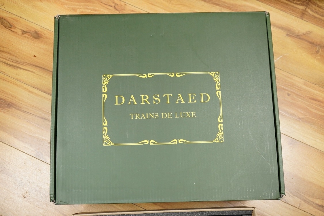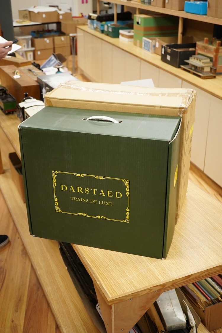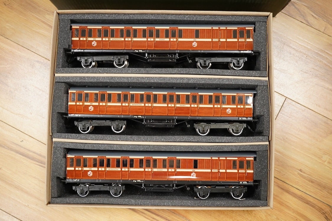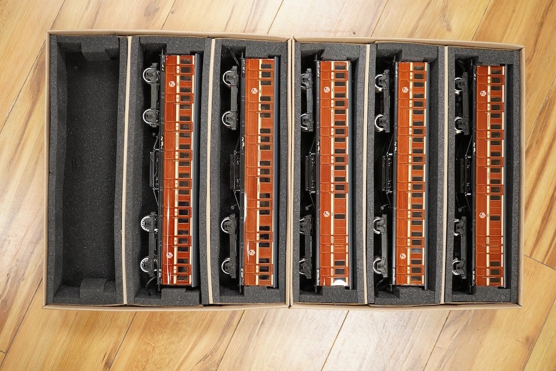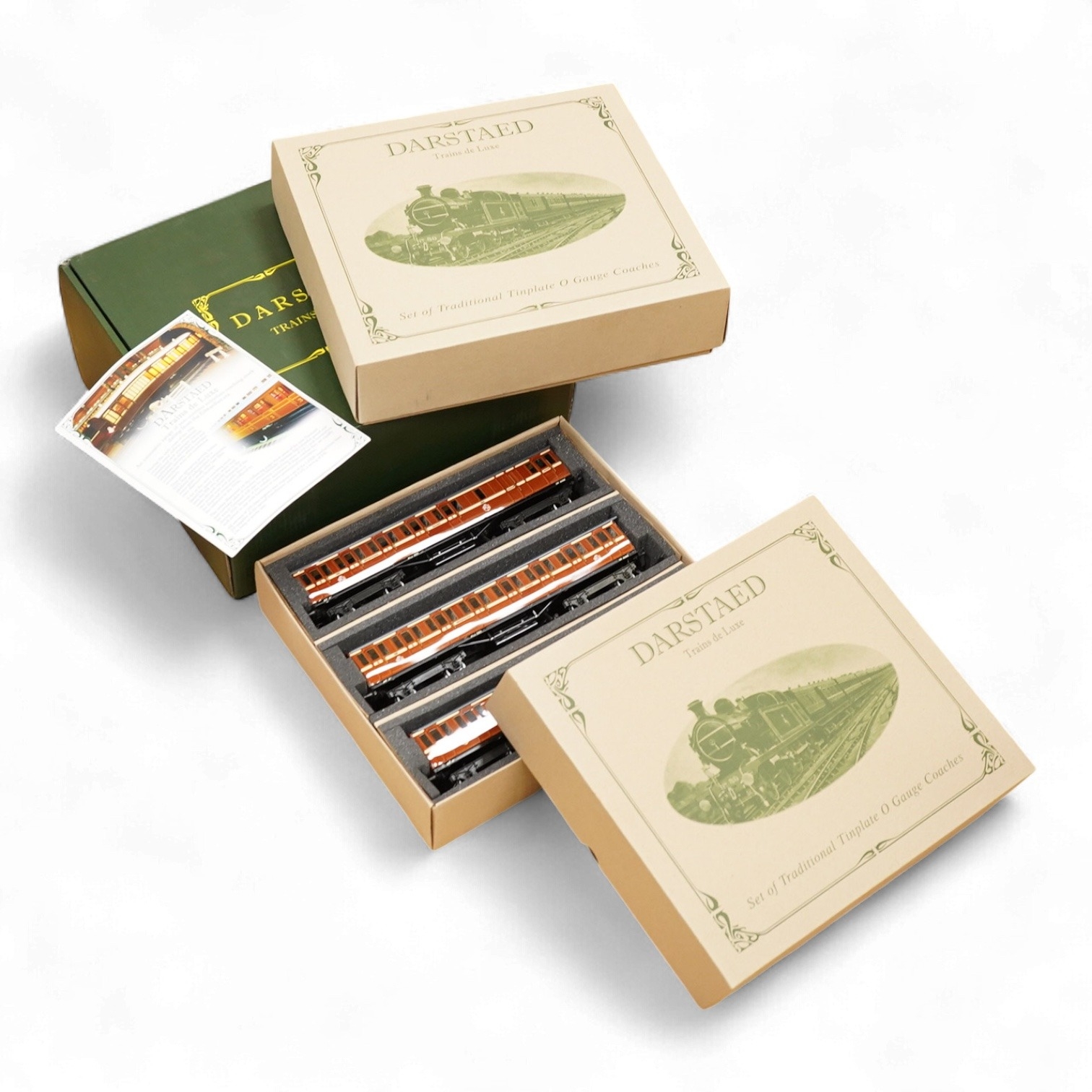 A boxed 0 gauge Darstaed tinplate Metropolitan Railway set of bogie coaches, a rake of five coaches in teak livery including; two Brake Thirds, two Full Thirds, and a Full First, fitted with internal lighting throughout and working tail light, one coach with centre rail pick-up for power, in unused condition and complete with paperwork, internal boxes, and original external card shipping box