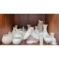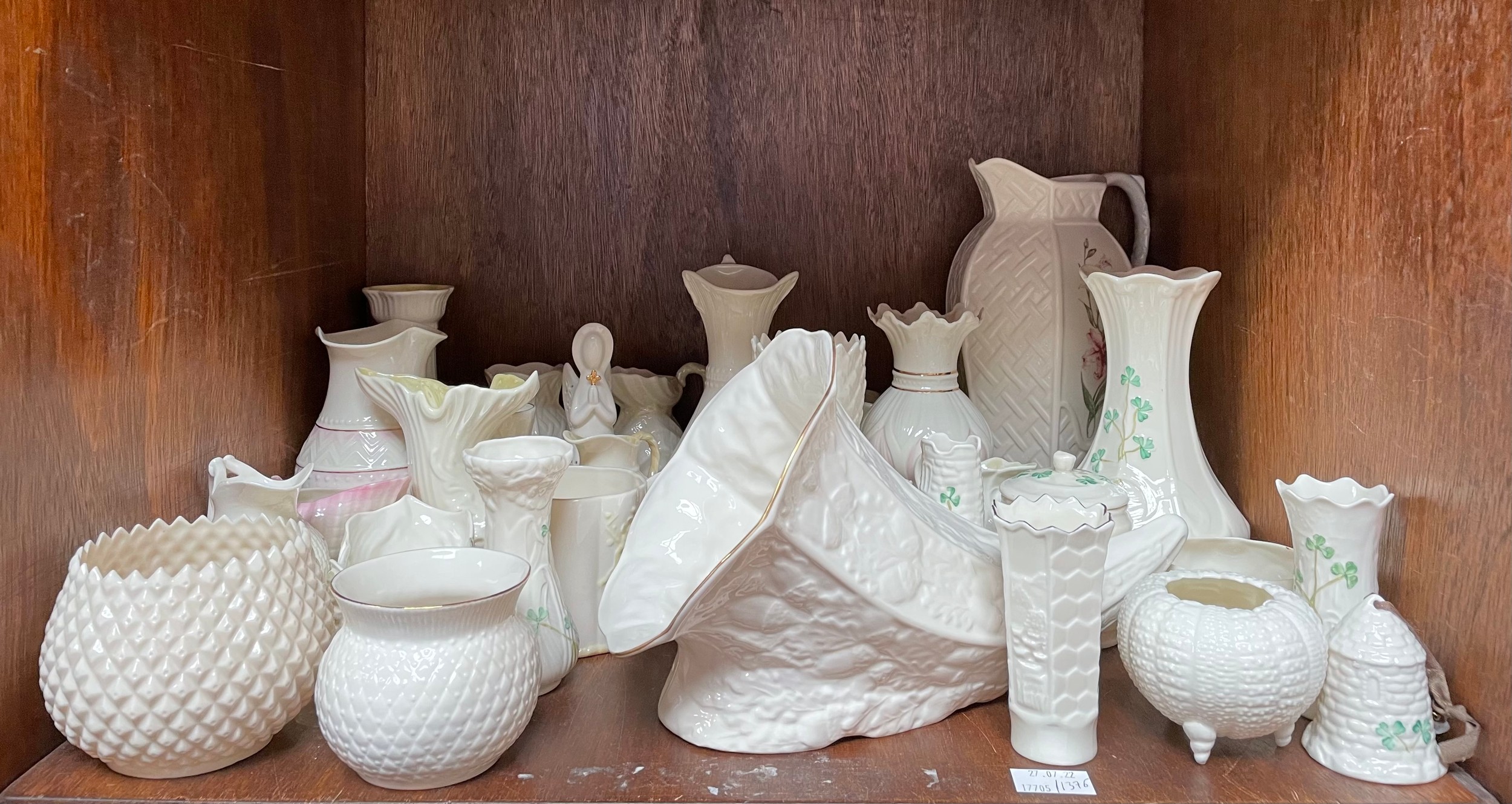 A collection of approximately 32-pieces of Belleek porcelain, comprising a Millennium 2000 shell, various jugs, vases, pot and covers etc. some shamrock pattern items (SECTION 53)