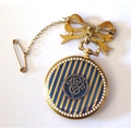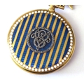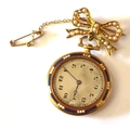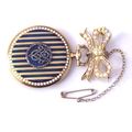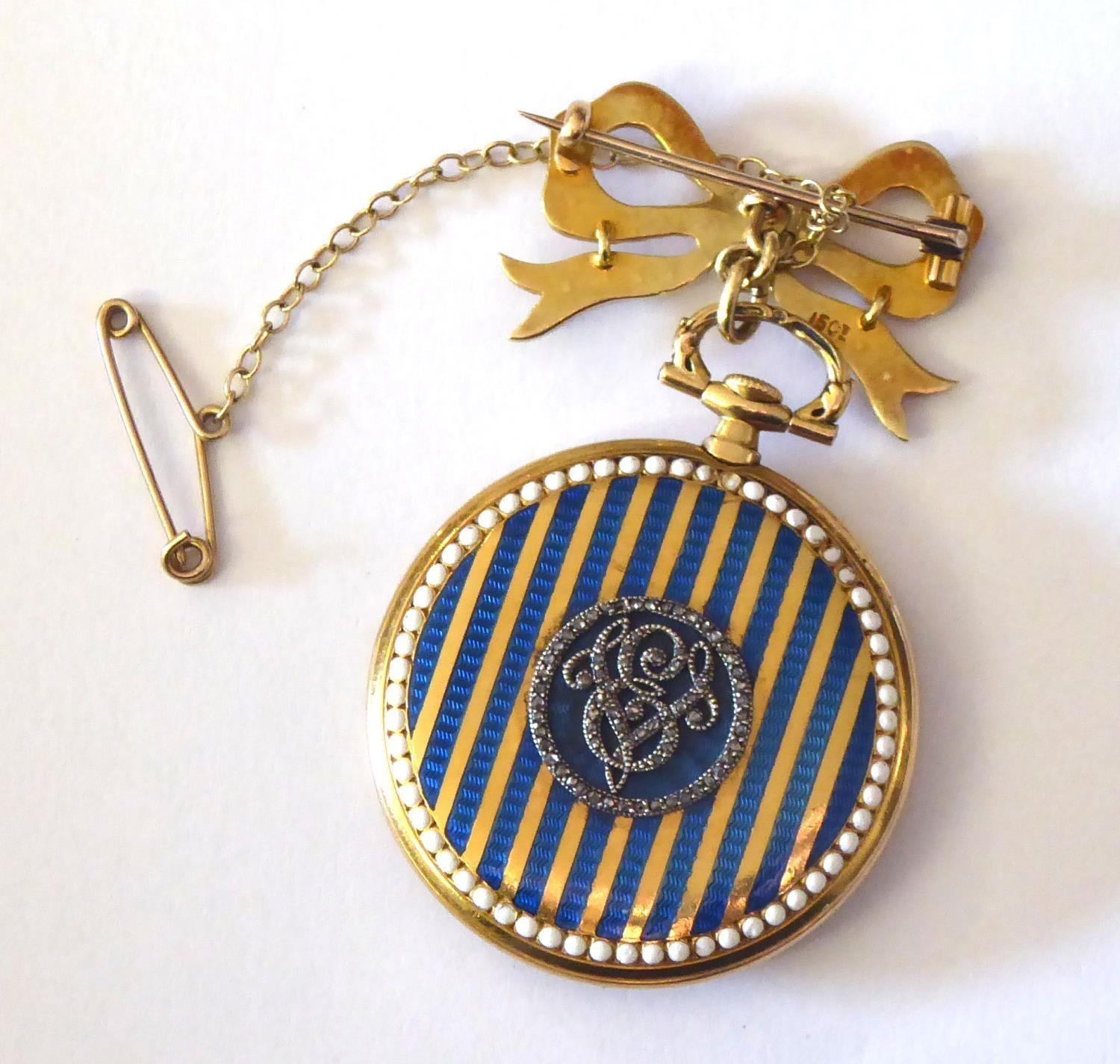 A LATE 19th CENTURY CONTINENTAL YELLOW METAL ENAMEL AND DIAMOND LADIES FOB WATCHhaving a circular silver tone dial with Arabic number markings the reverse decorated with blue and white enamel the central cartouche set with diamonds. Together with a 15ct and seed pearl bow form suspender Approx 3cm diameter