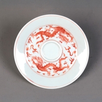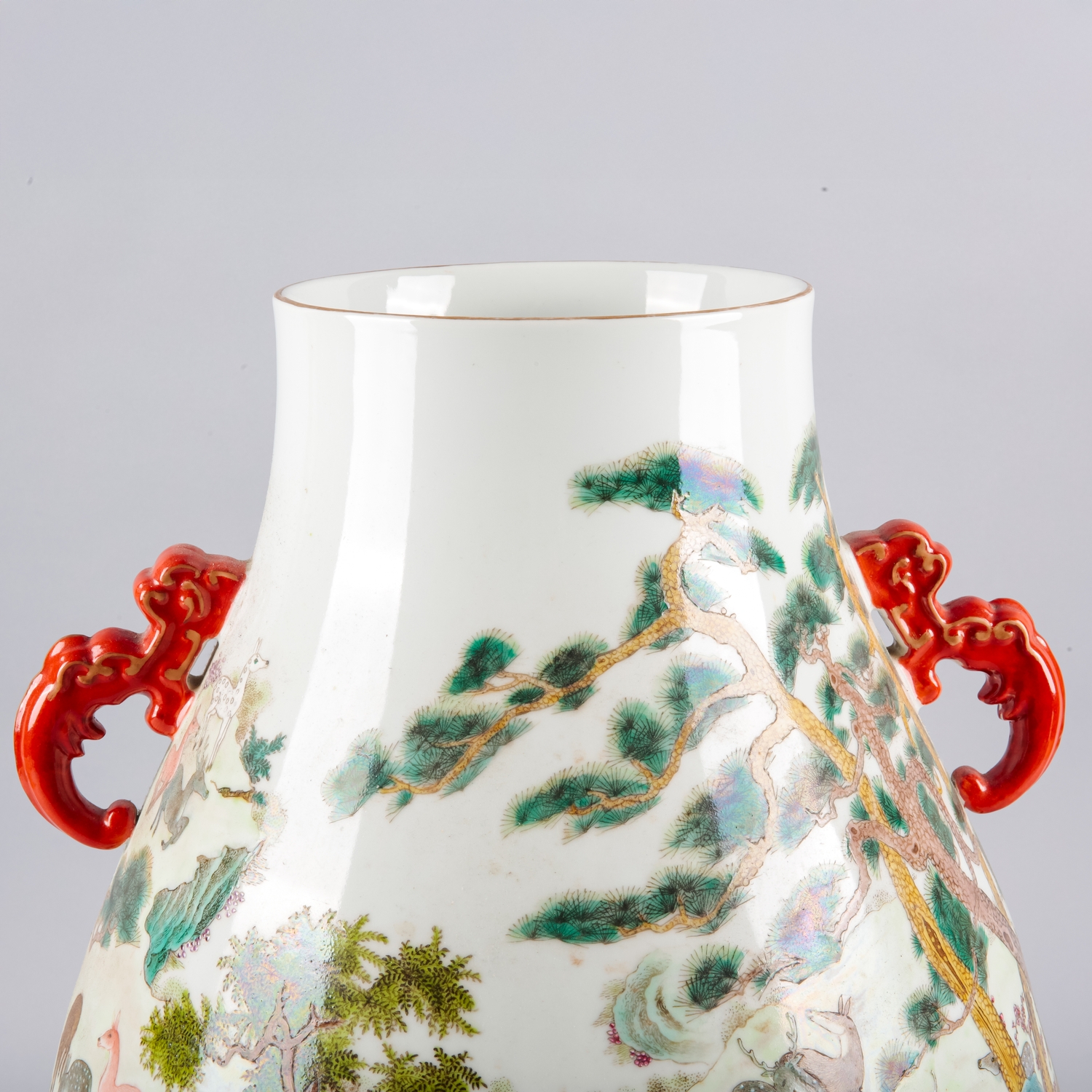 bearing a six character Qianlong seal mark to the base, probably Republic period, of pear shape with wide rim and shaped bracket handles, decorated with an extensive landscape of deer amongst trees, rocks and foliage, 48cm high