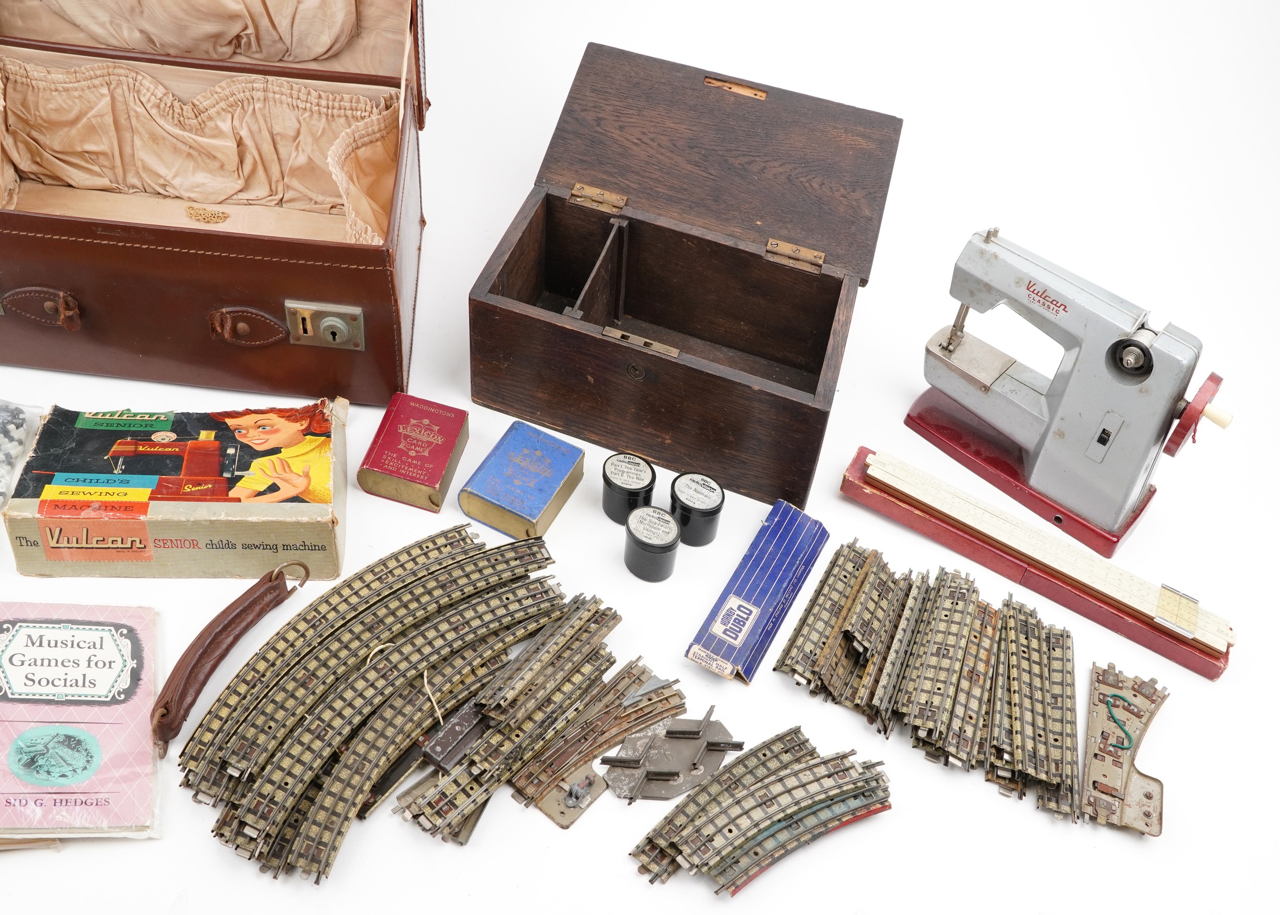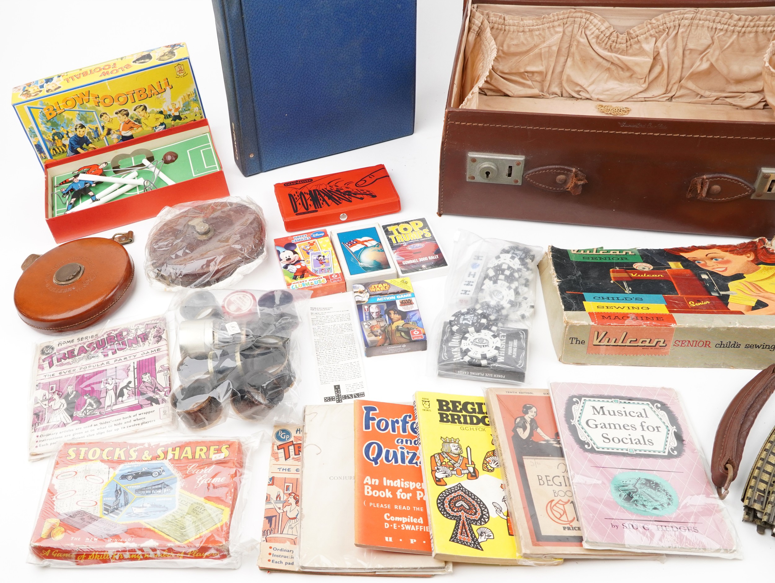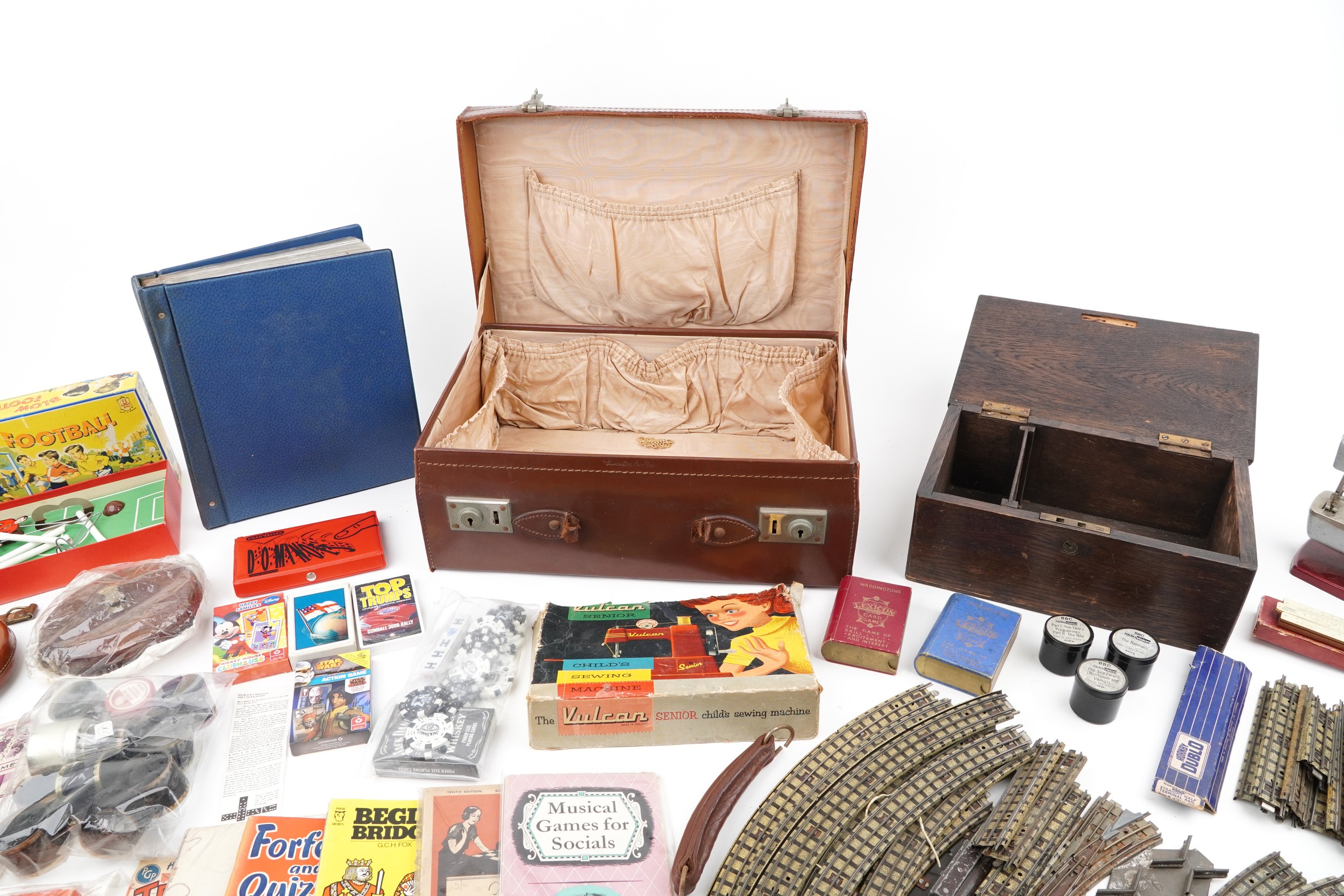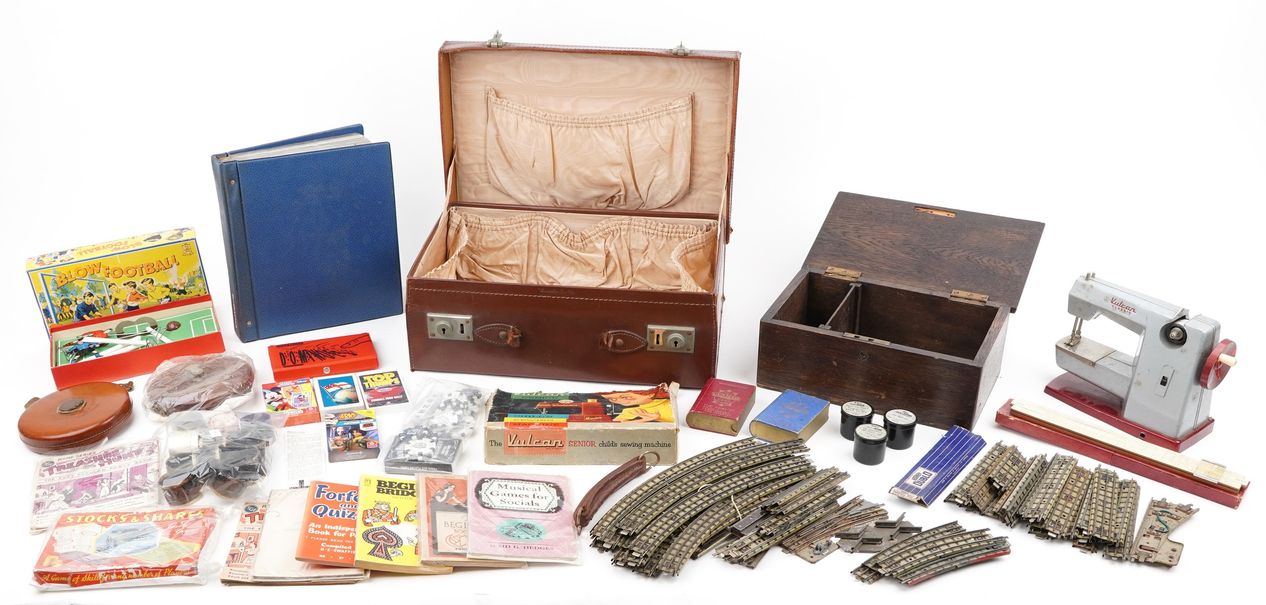 Antique and later sundry items including a travelling vanity case, card games, a child's sewing machine and measuring instruments and One hundred 1960s and 70s British first day covers housed in a blue covers album.