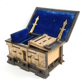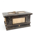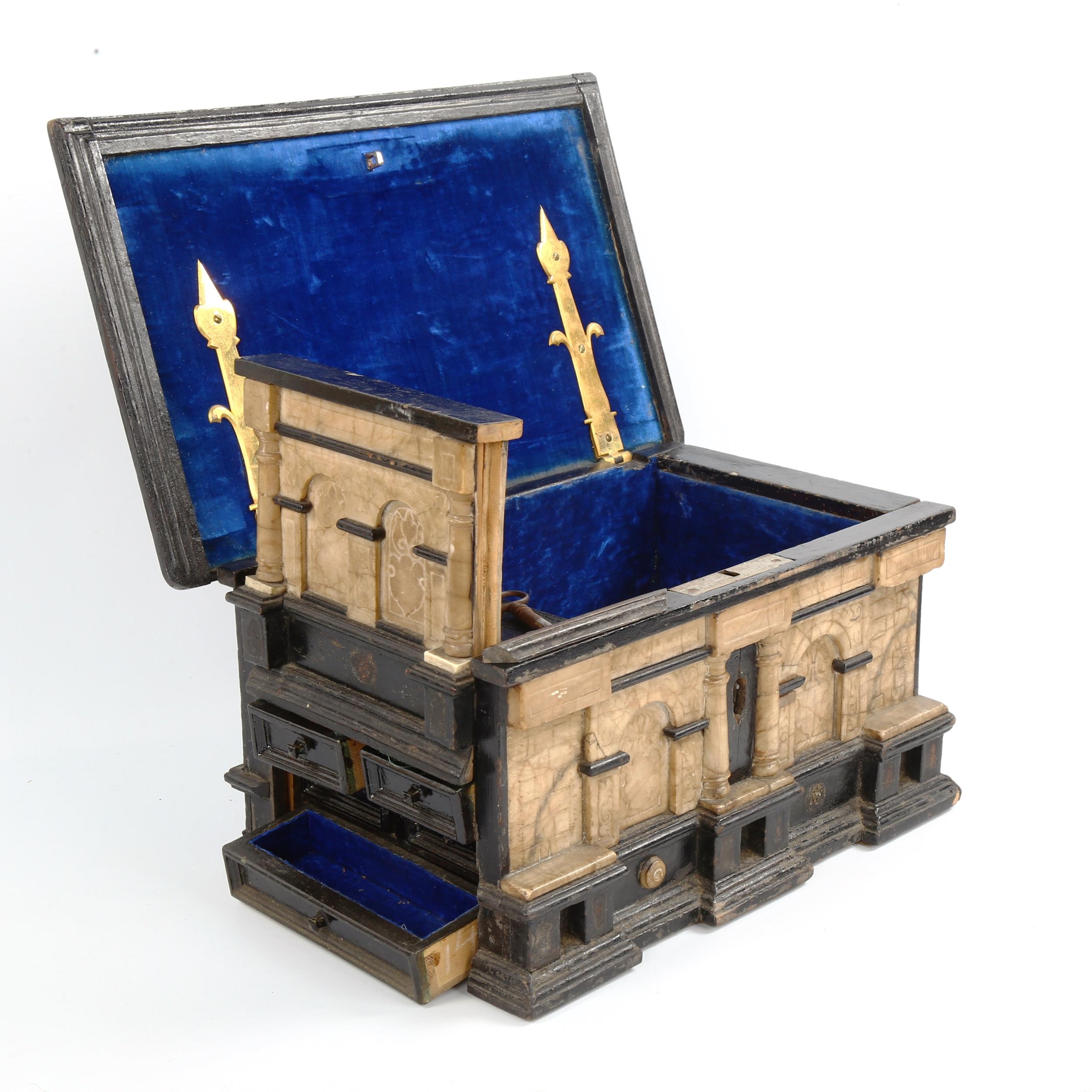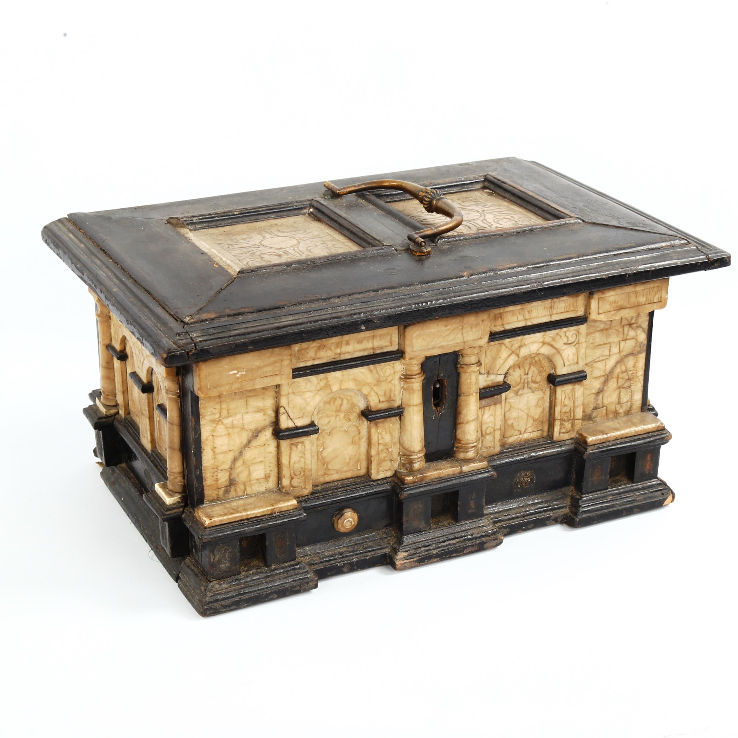 A Malines alabaster casket, 17th century with brass carrying handle, ebonised mouldings and mounts, and carved Archadian alabaster sides, one end opening to reveal secret drawers, length 34cm, depth 21cm, height 16cm
