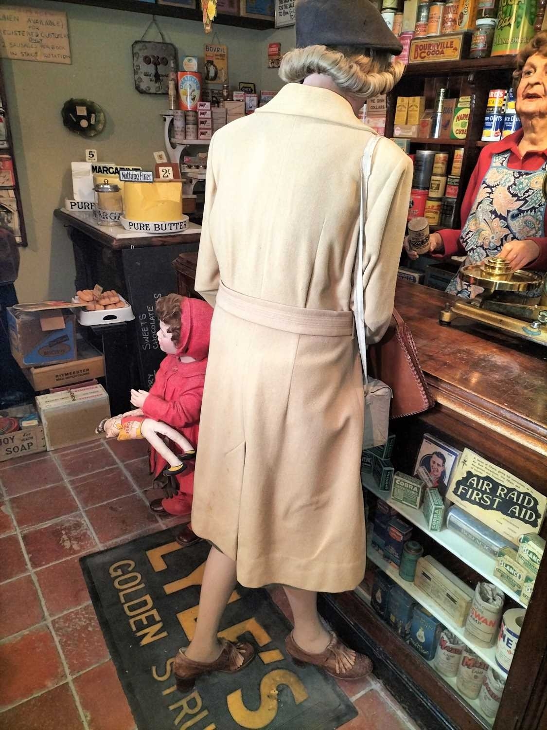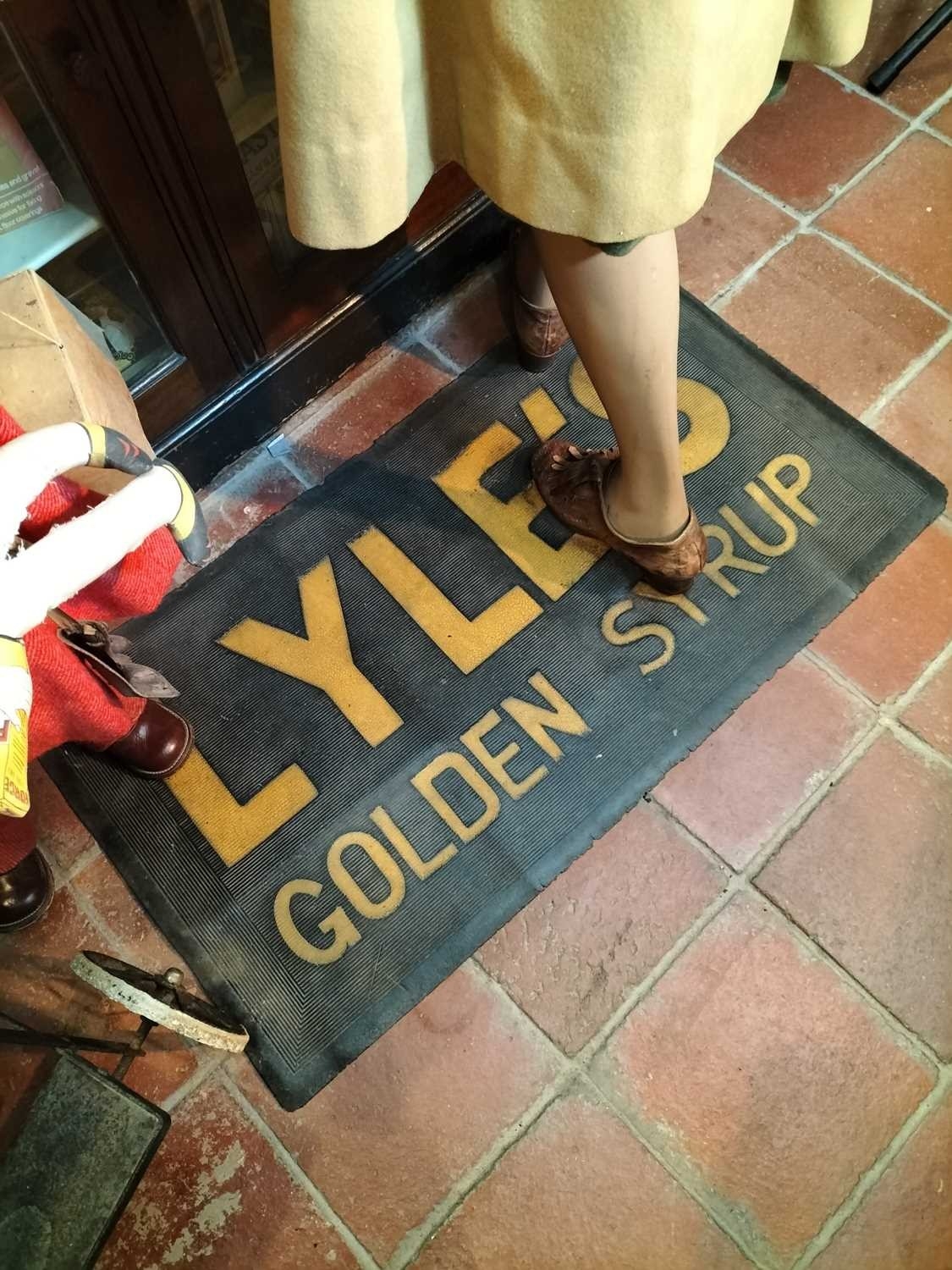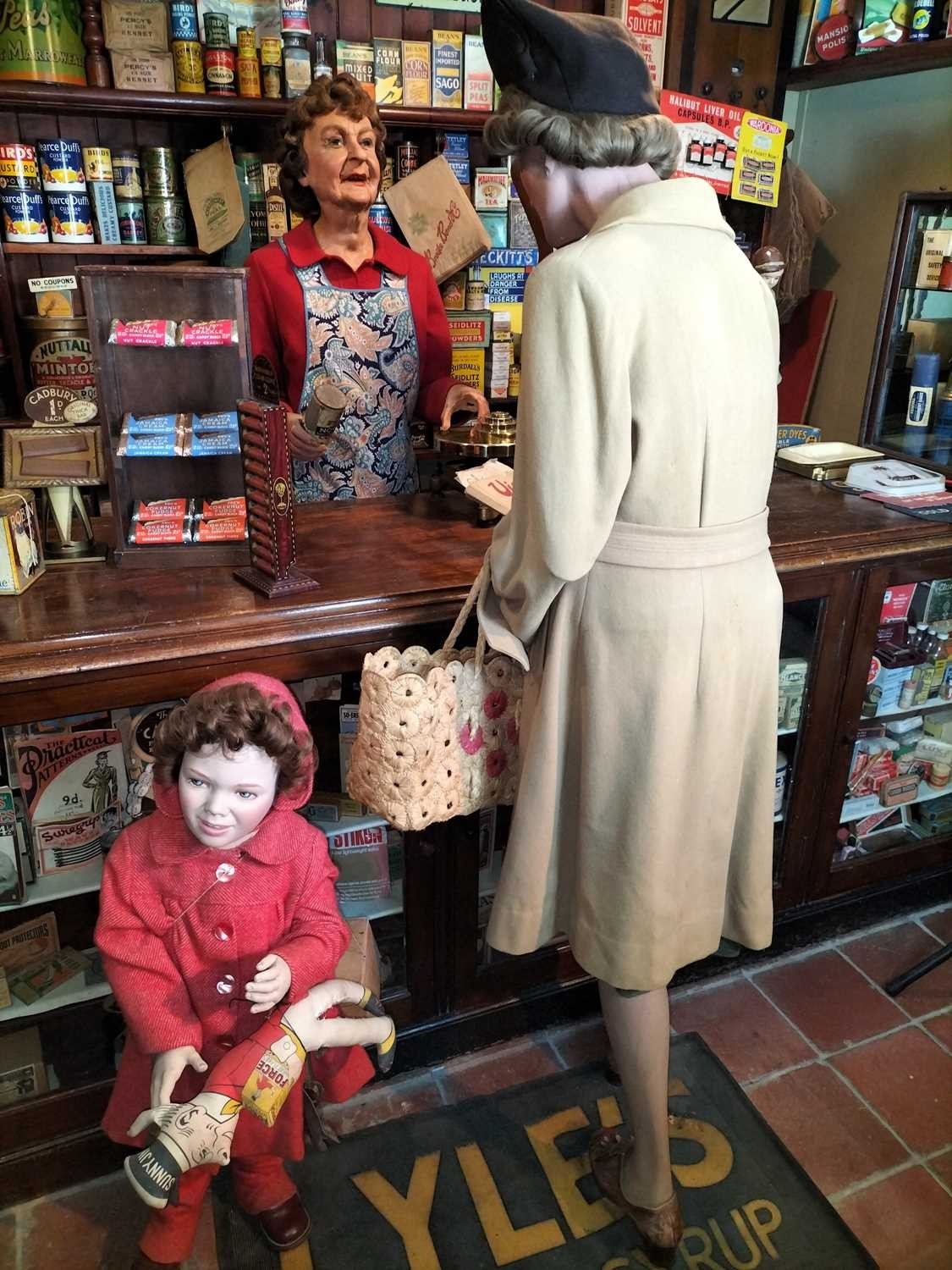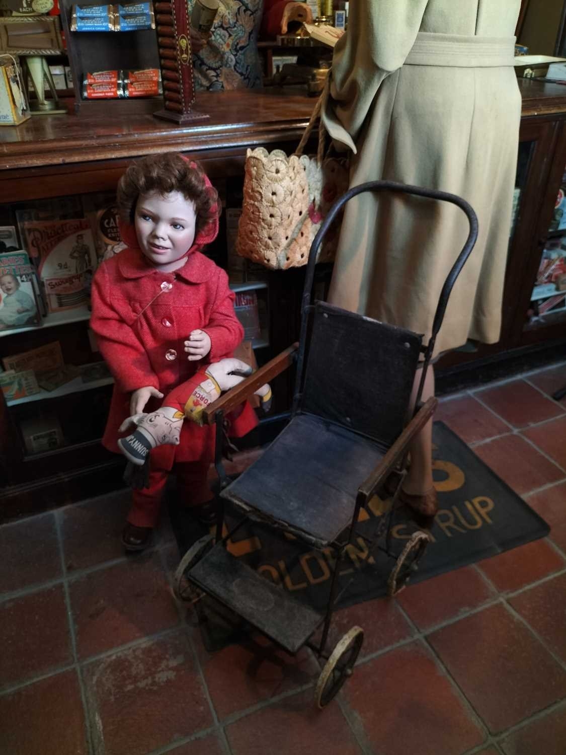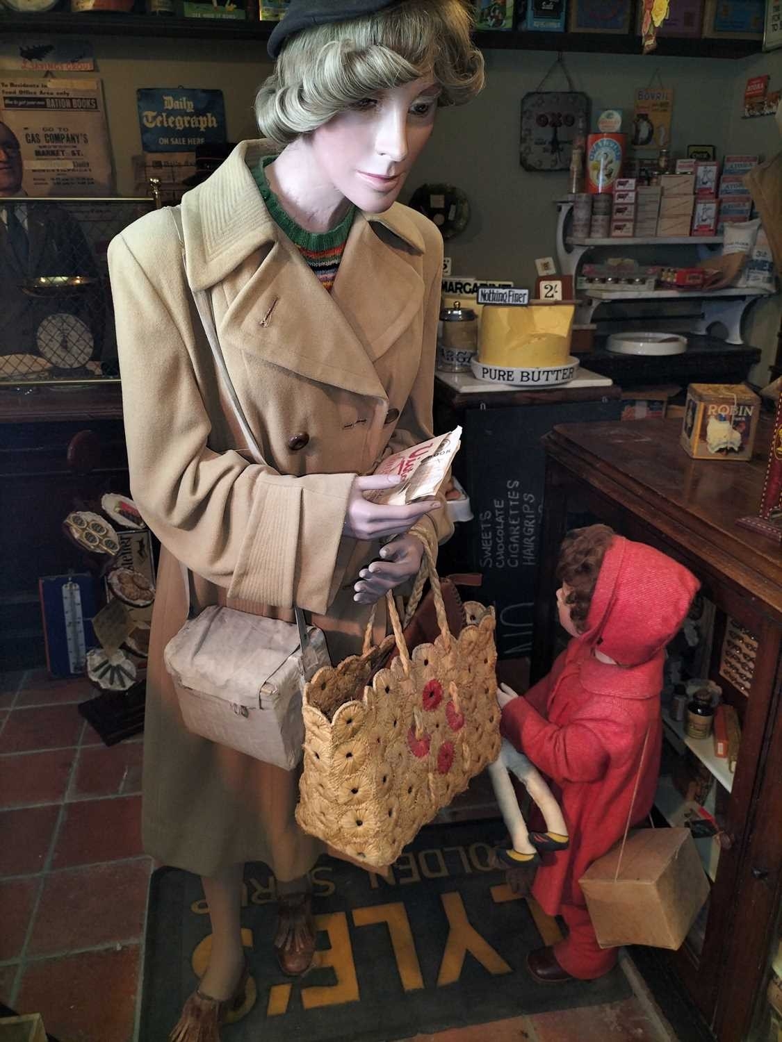 Flambards, two display figures. Mother and child figures floor standing figures both in period style costume, the lady with her shopping bag .mask and ration book, the girl with herb toy Sunny Jim and push chair, these figures include their stands and the rubber Lyles Golden Syrup advertising mat that covers the metal stands. Lady 164H cm & Girl 70H cm
