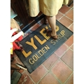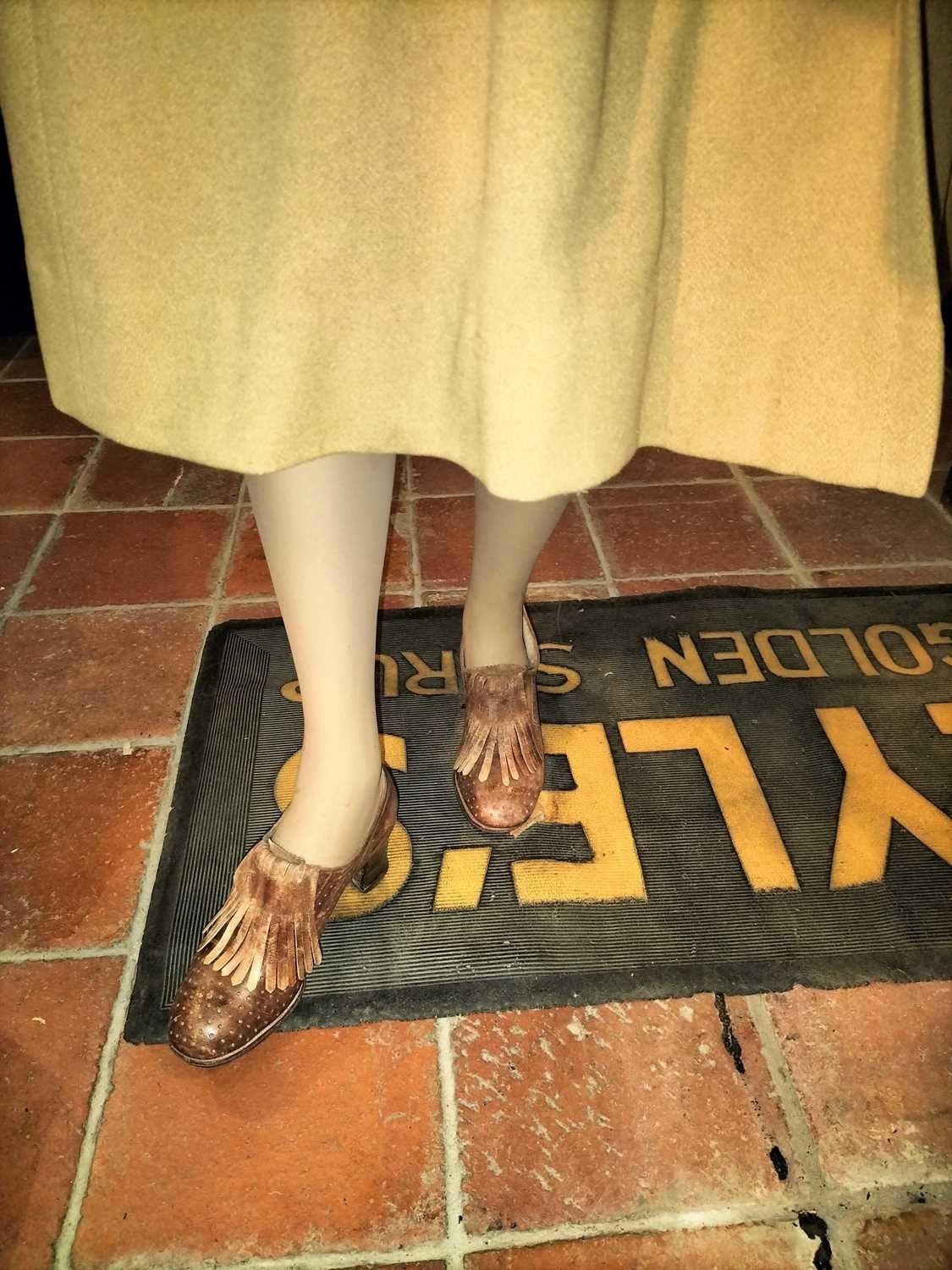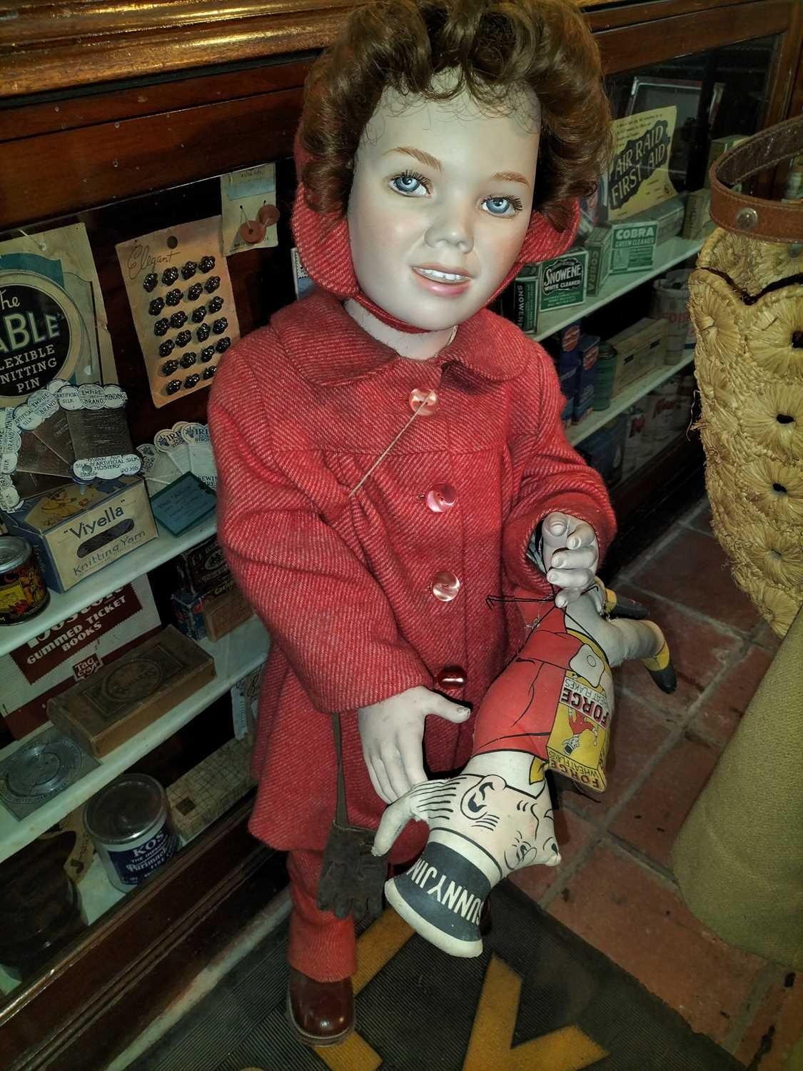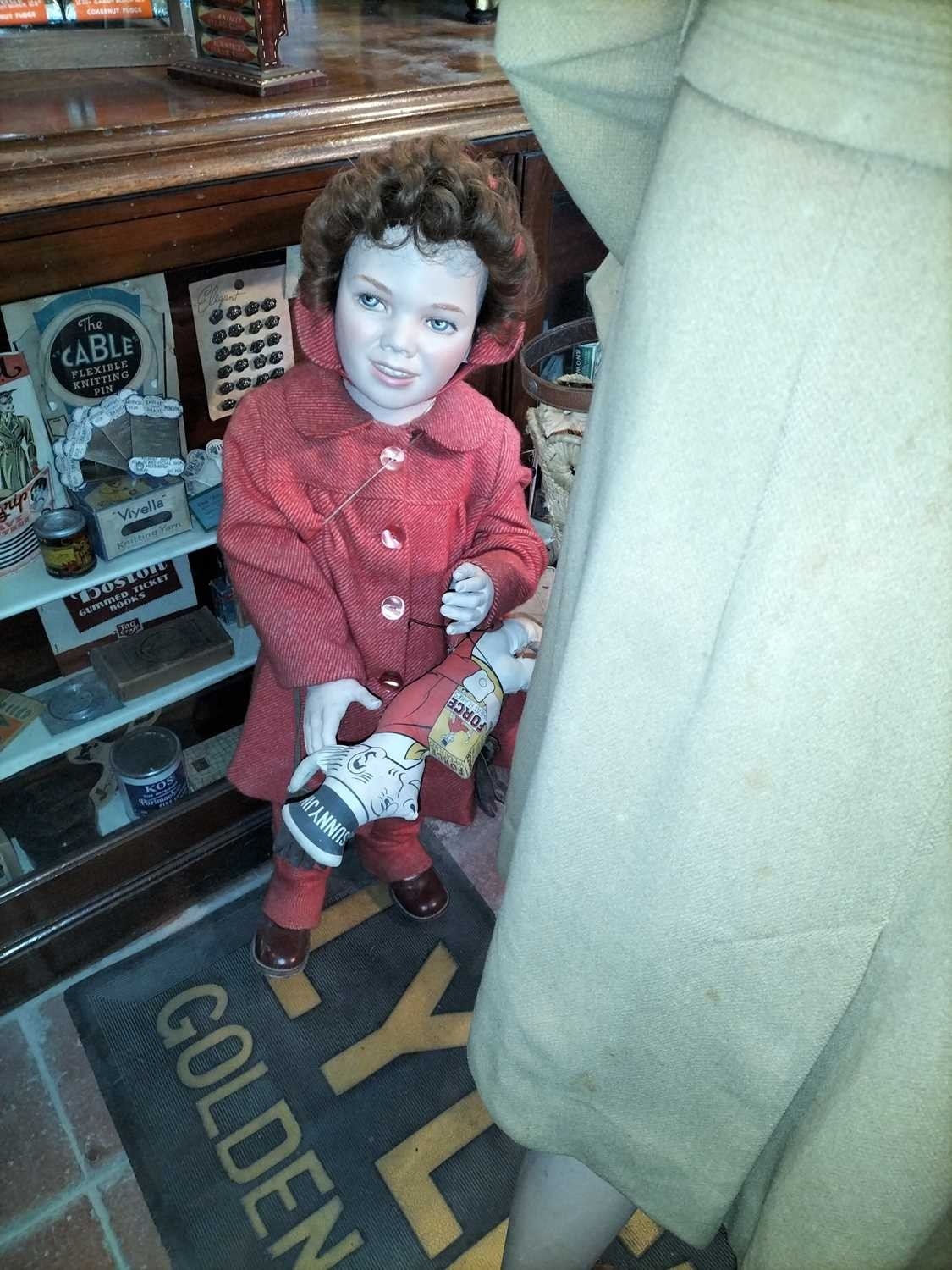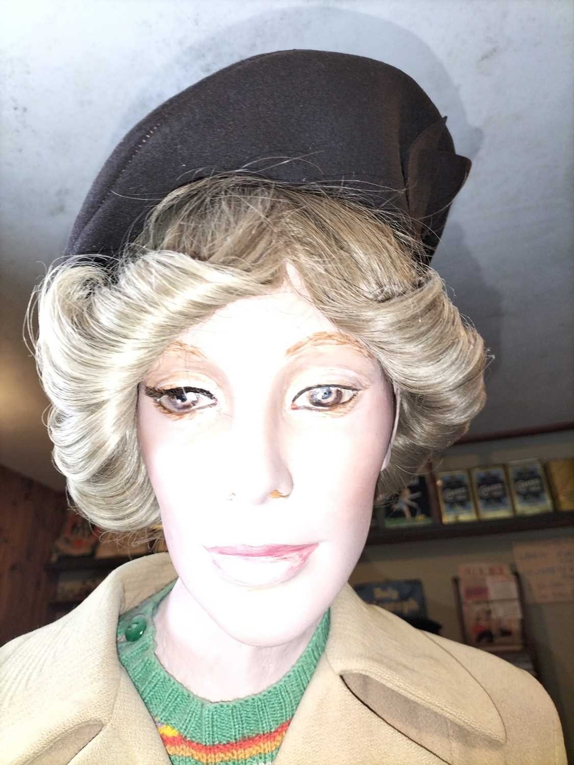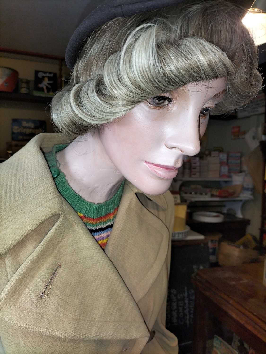 Flambards, two display figures. Mother and child figures floor standing figures both in period style costume, the lady with her shopping bag .mask and ration book, the girl with herb toy Sunny Jim and push chair, these figures include their stands and the rubber Lyles Golden Syrup advertising mat that covers the metal stands. Lady 164H cm & Girl 70H cm