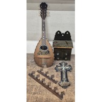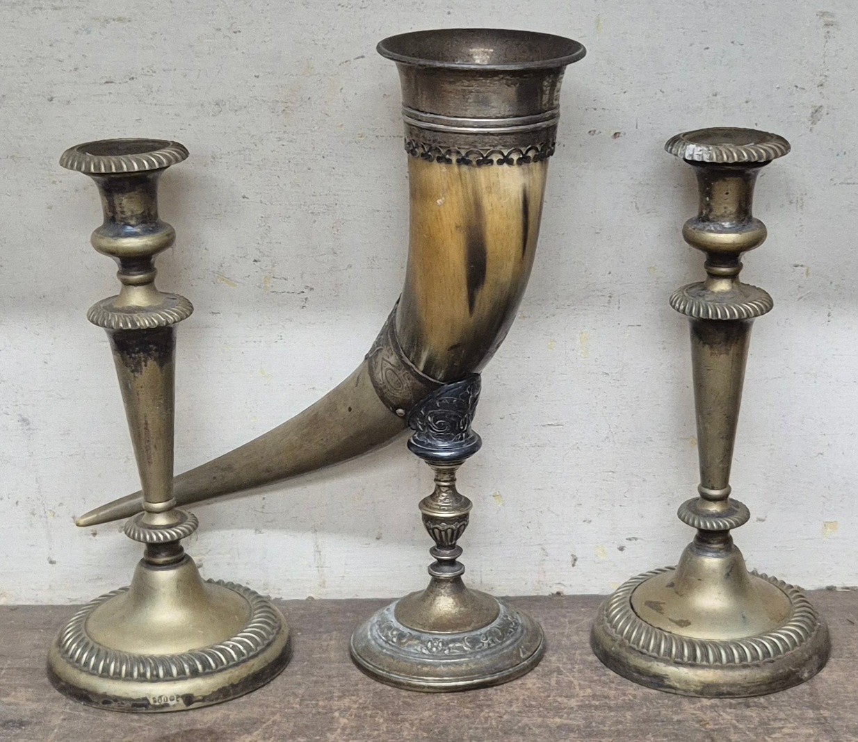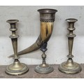 A pair of brass candlesticks and a brass mounted horn on stand