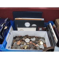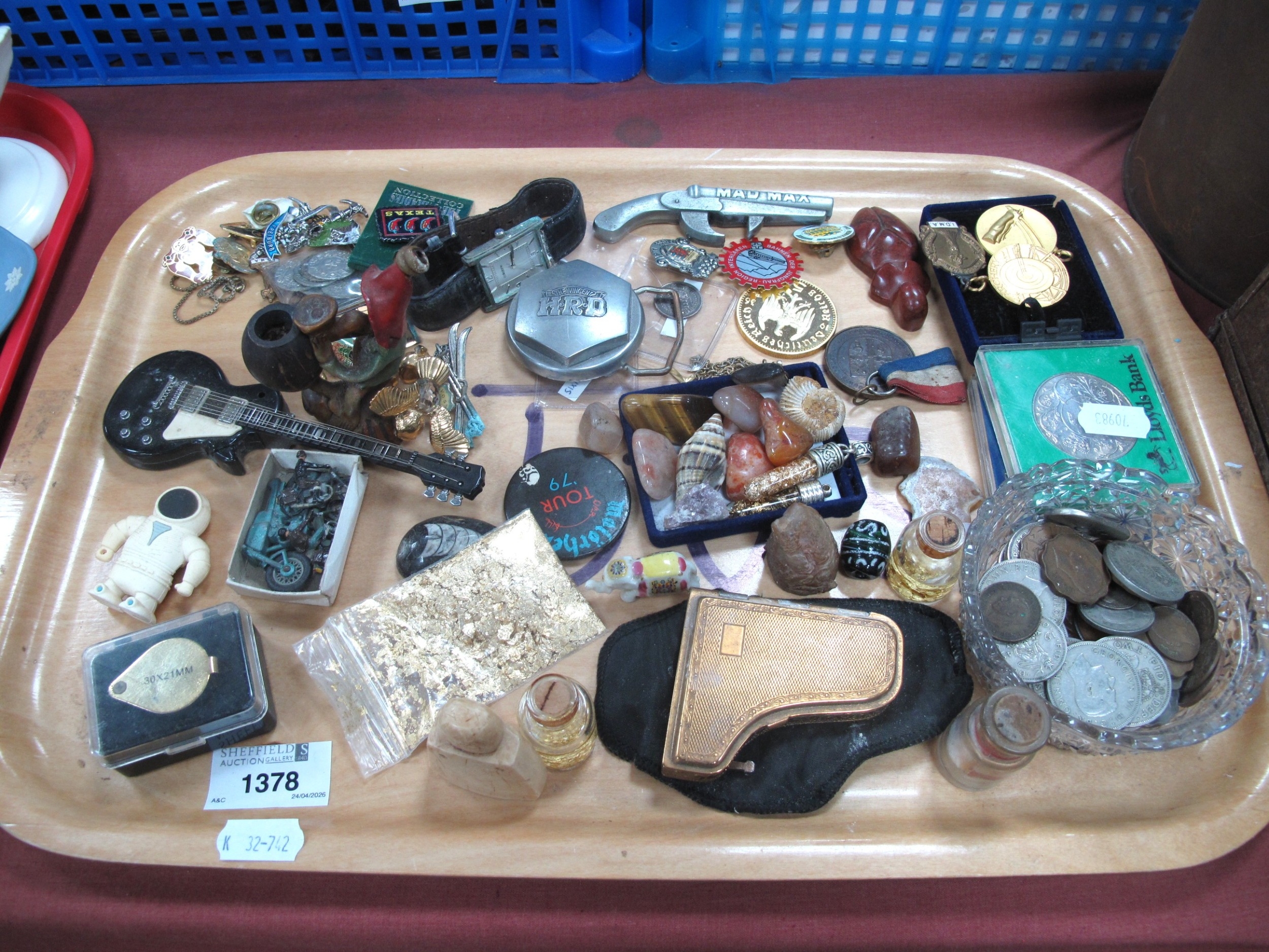 1887 Sixpences (2), 1855 groat, other coinage, badges, medals, pygmalian compact as a piano, seashells, etc:- One Tray.