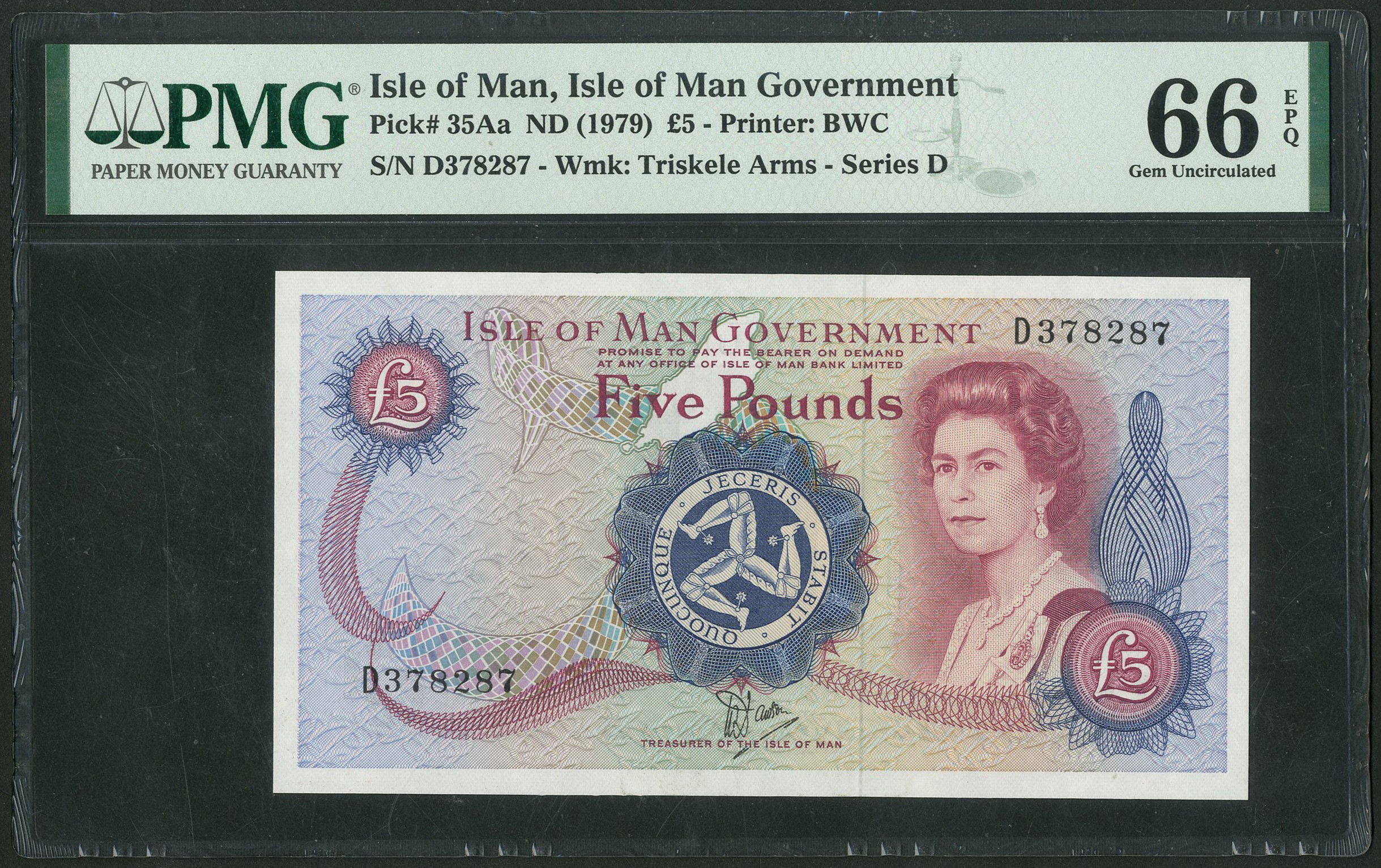 Isle of Man, Government, £5, ND (1979), Dawson signature, #D378287 (Pick35Aa; BNYN IM43b). PMG 66 EPQ Gem Uncirculated.