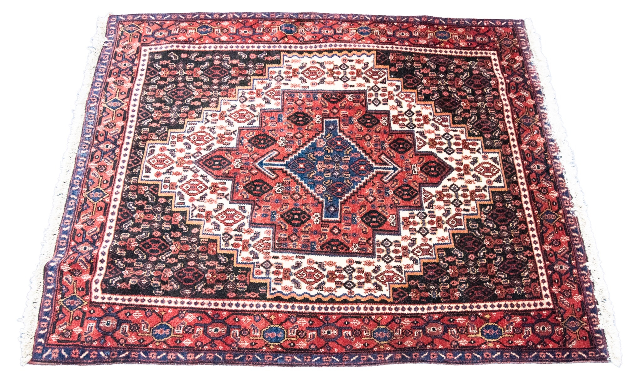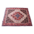SENNEH PERSIAN RUG with two concentric medallions on a small ivory field with midnight blue large spandrels, crimson and floral meander principal border with three guard stripes, 5'7" x 4'4" (approx 170cm x 132cm)