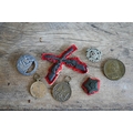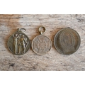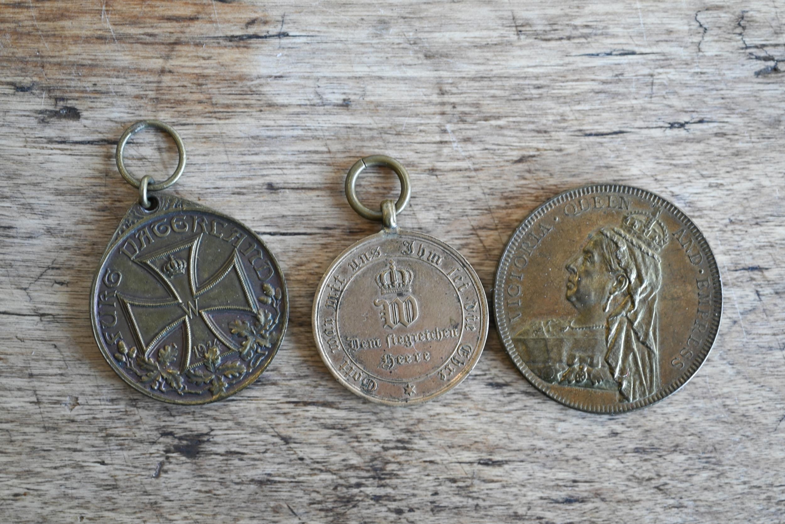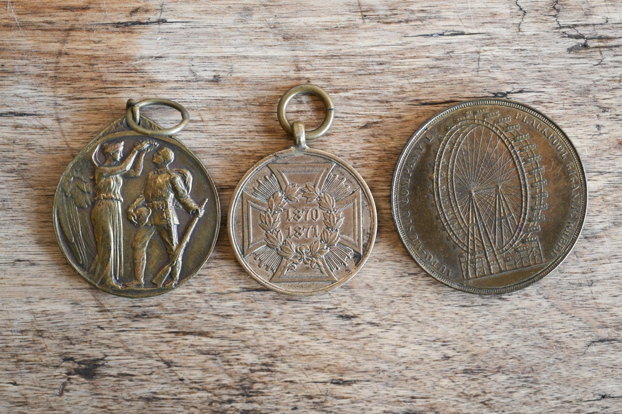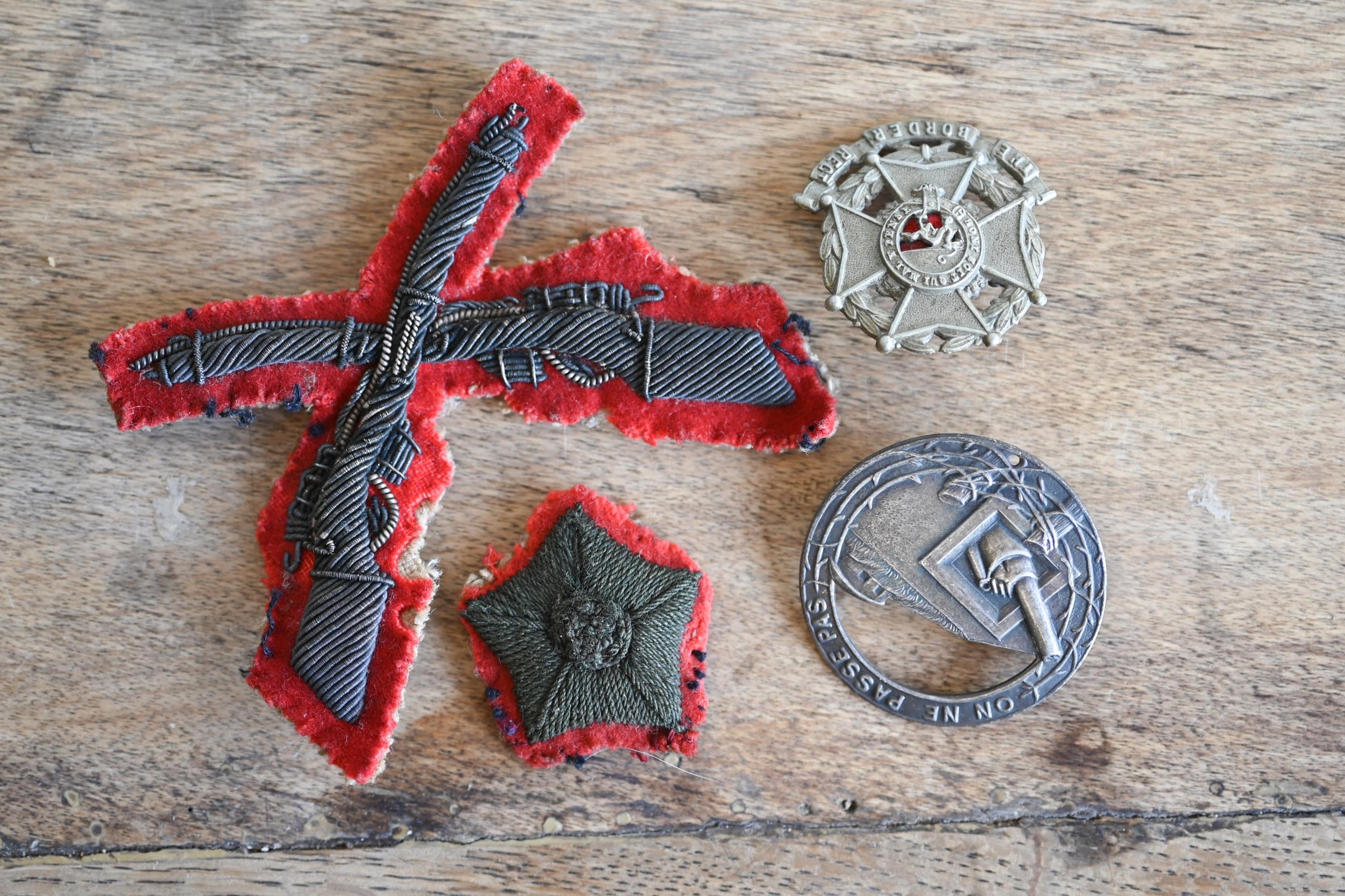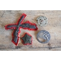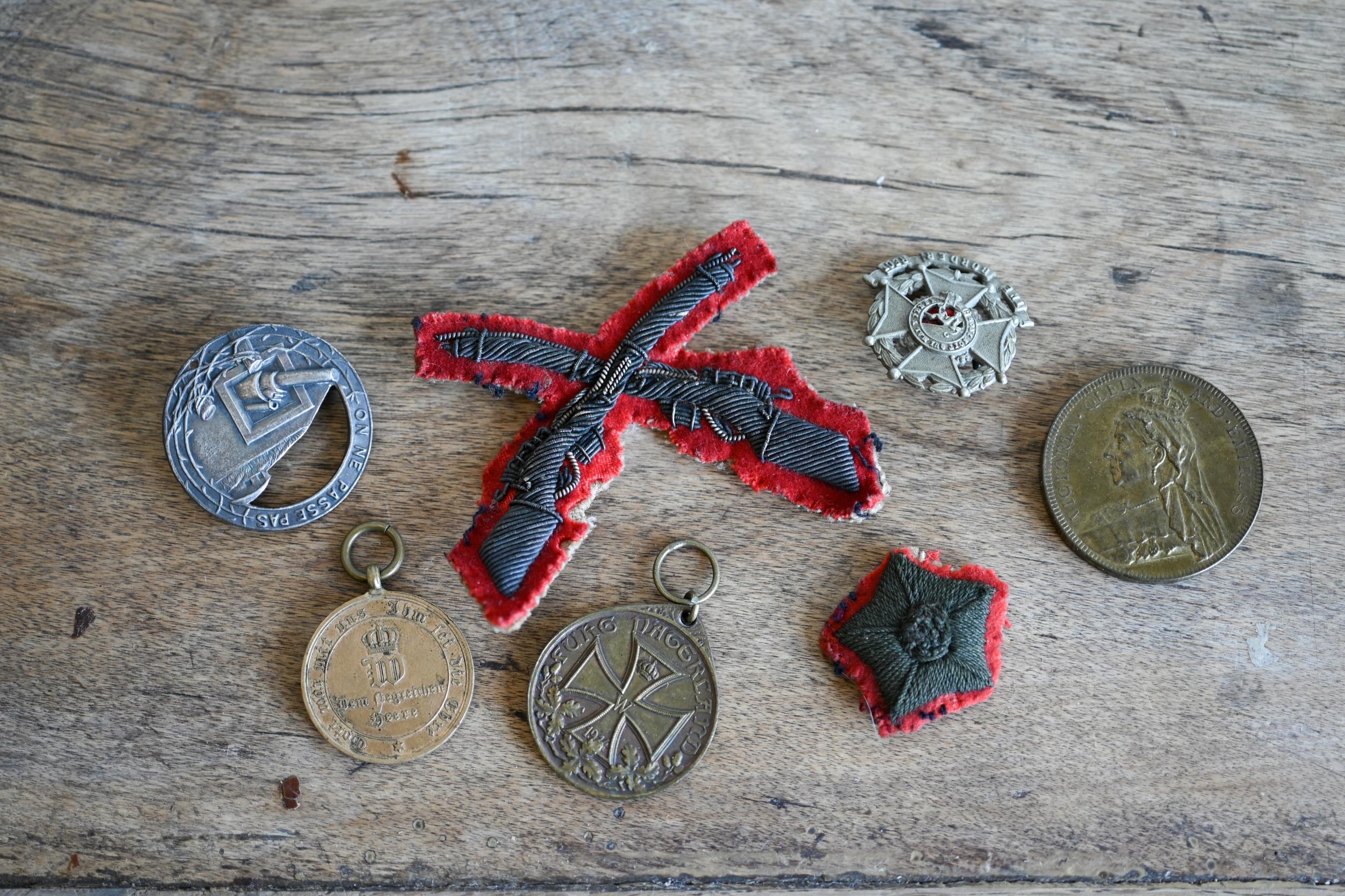 A German 1870-71 War Commemorative Medal (combat veteran), a WW1 Veteran's League Campaign Service Medal and a Maginot Line service badge, a Border Regiment cap badge, a British Army silver bullion embroidered 'Skill at Arms' patch and a bullion formation sign patch flash; lot also includes a Victorian gilt metal commemorative medallion - 'Auto-Music Company Ltd. Blackpool Gigantic Wheel', by Henry Grueber, 37.5mm diameter (7)