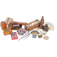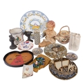 A box of various ceramics, frog surprise mug, Vintage doll, etc.