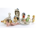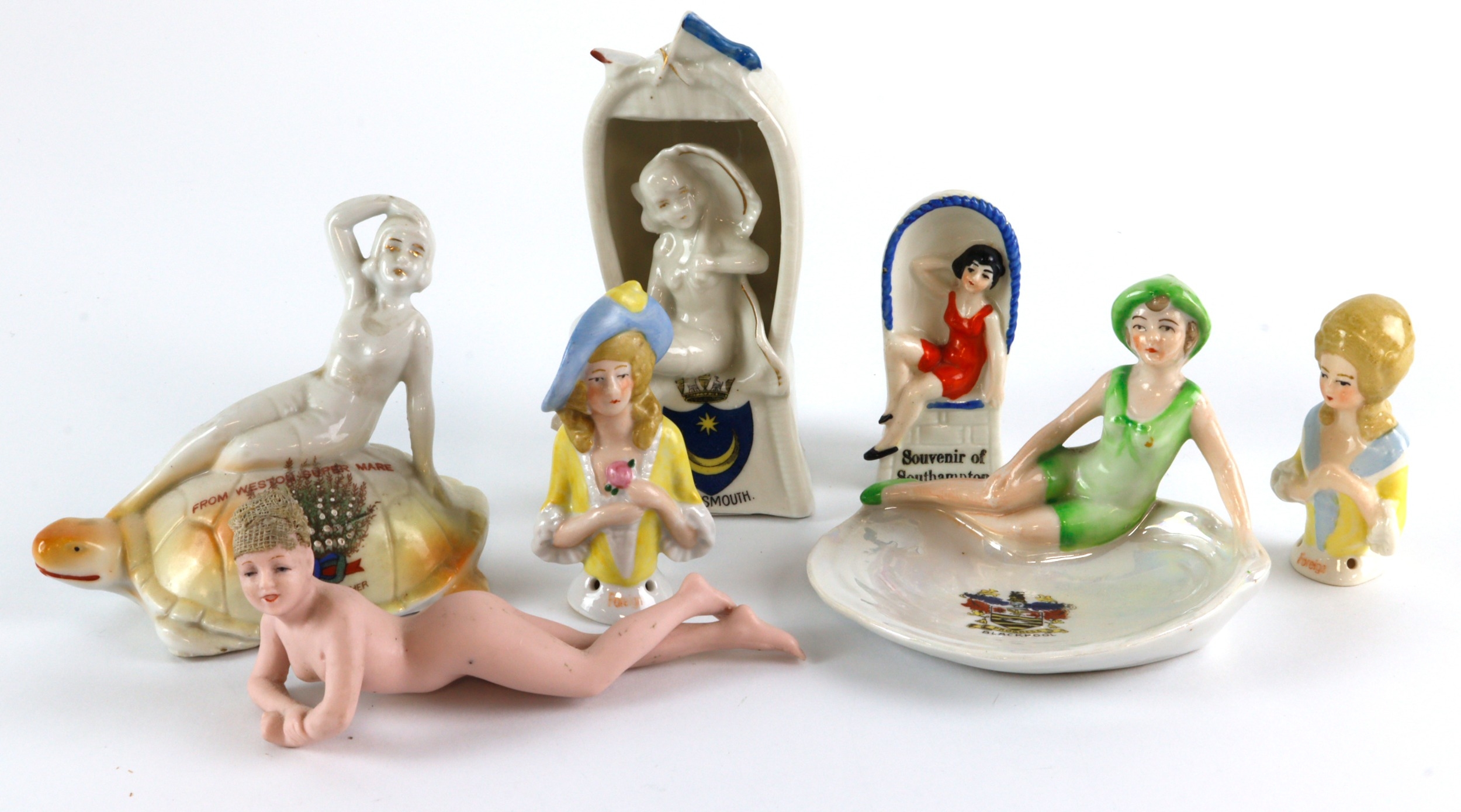 Mixed lot of China Ladies, comprising four Bathing Belles (two of the sitting ladies have chips to a flag & the bottom of the Wicker Seat) together with two half dolls & one very unusual Bisque china miniature female doll (nude)