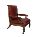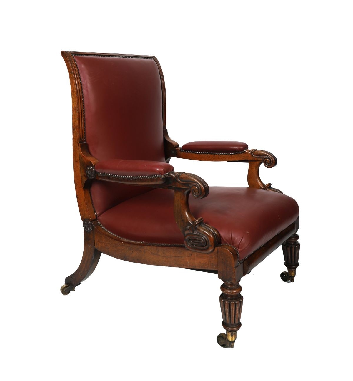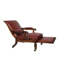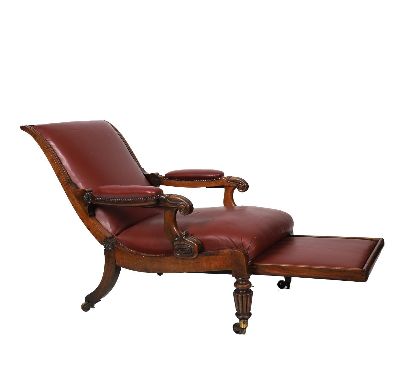 Circa 1835. The upholstered seat and back in burgundy leather with brass-studded borders, scroll arms and turned front legs on castors; the seat extending to form a chaise longue for reading or repose. Stamped by the maker with patent stamps to back legs, with the original comprehensive operating instructions paper label. 106 cm. high; 60 cm. wide; 80 cm. deep FURNITURE Tuesday 25th November 2025 11:13:27