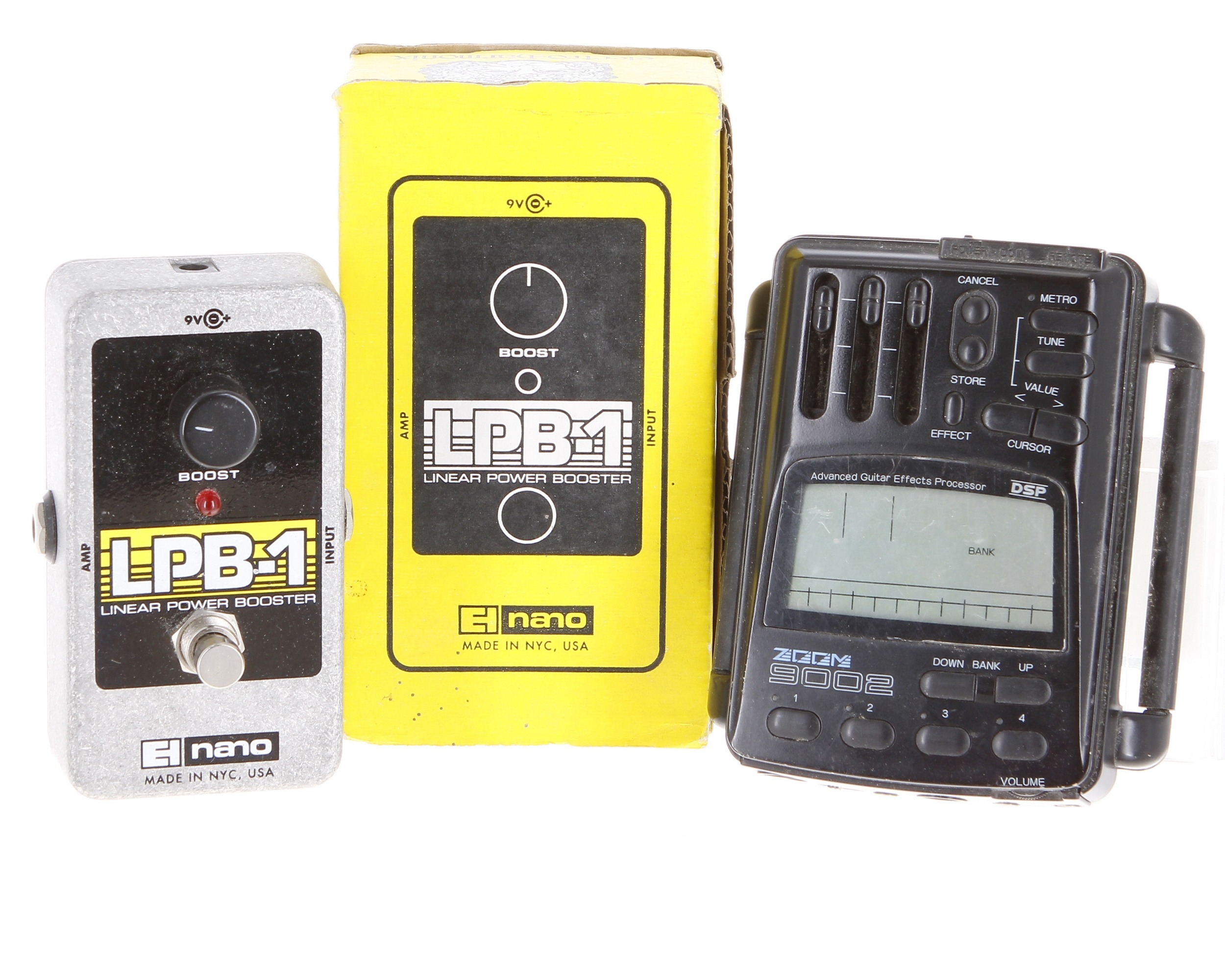 Electro-Harmonix Nano LPB-1 Linear Power Booster guitar pedal, boxed; together with a Zoom 9002 multi-effects guitar unit