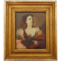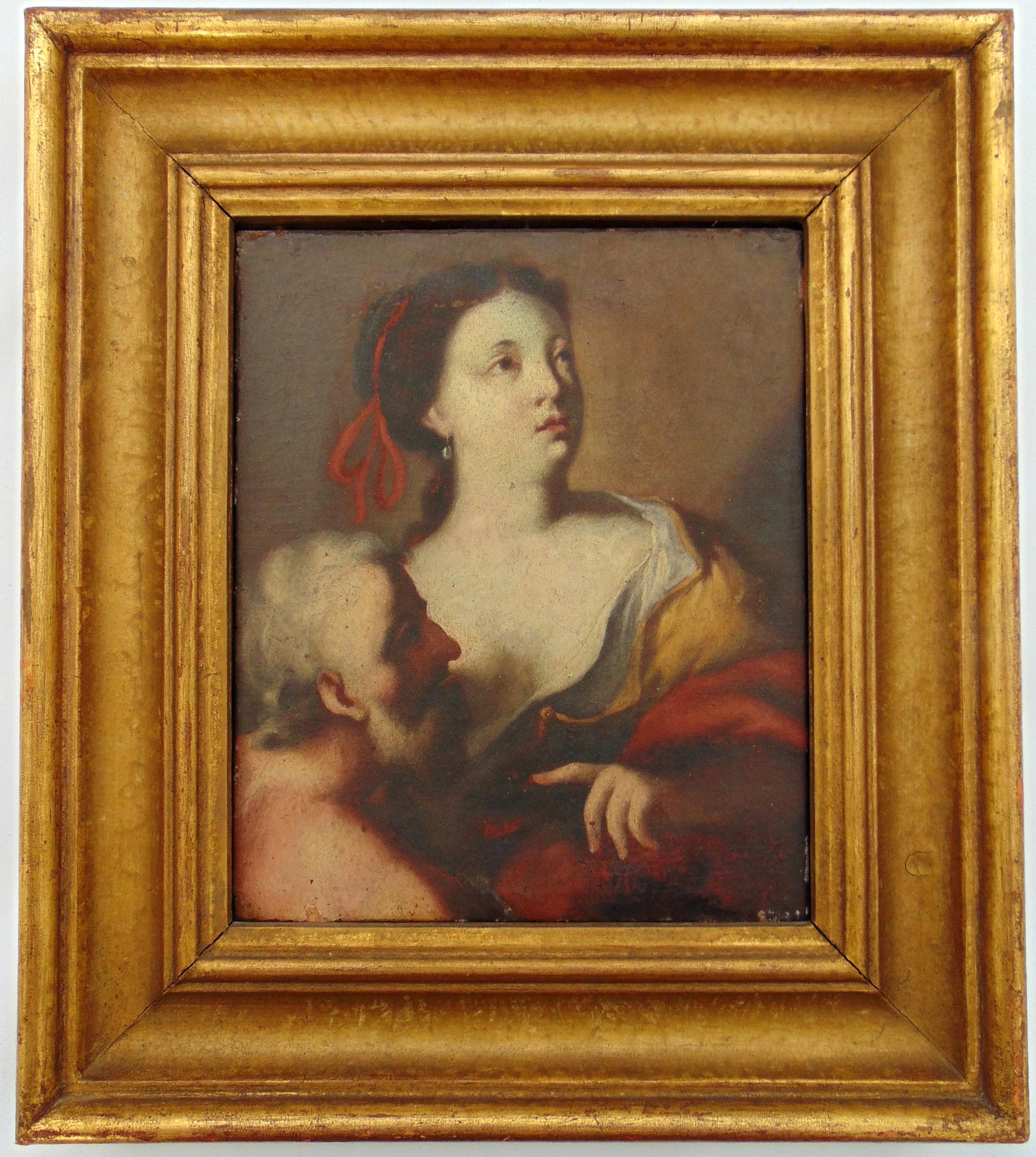 A framed 17th century framed oil on canvas Roman Charity attributed to Massimo Stanzione, Christies label to verso, 22.5 x 18.5cm