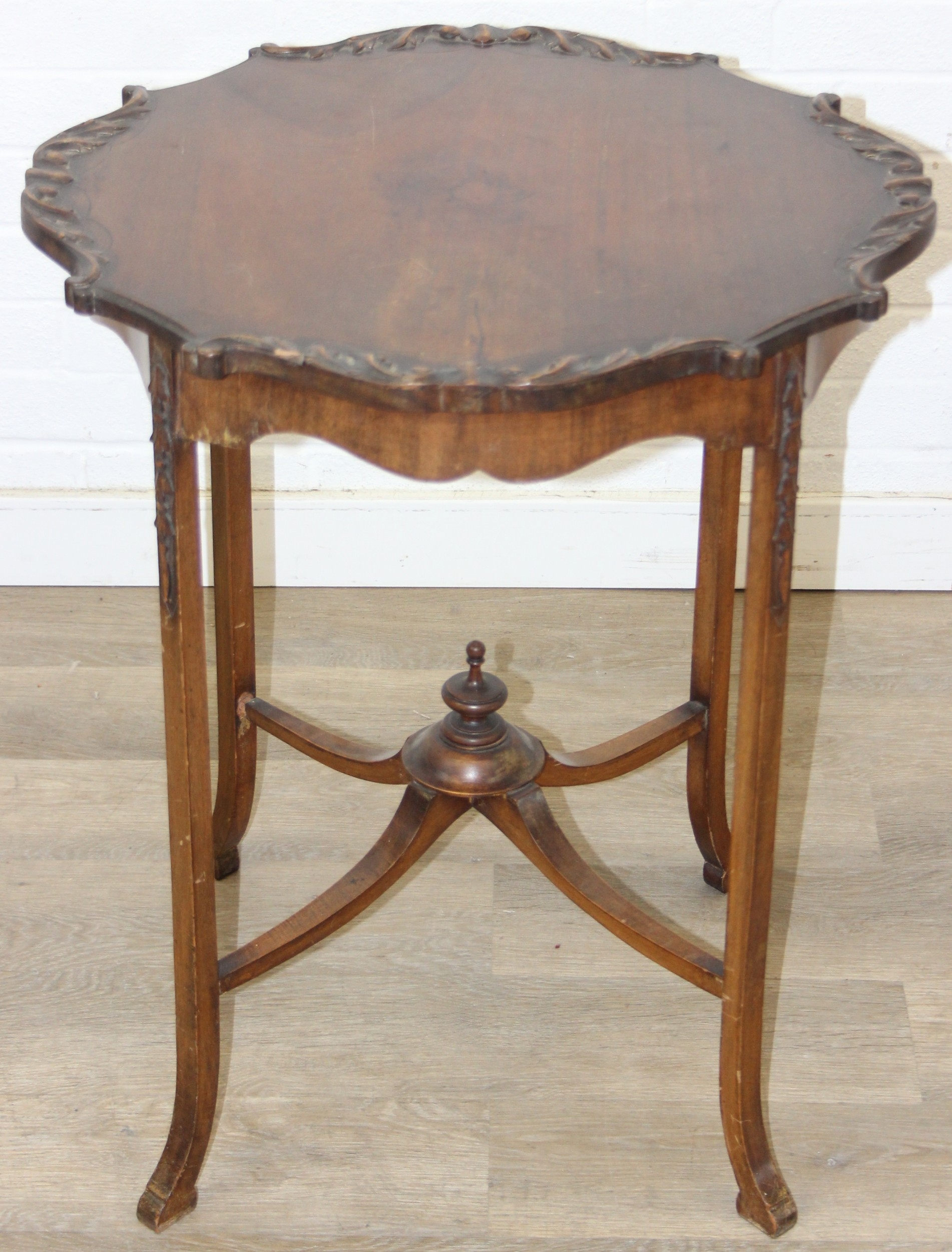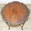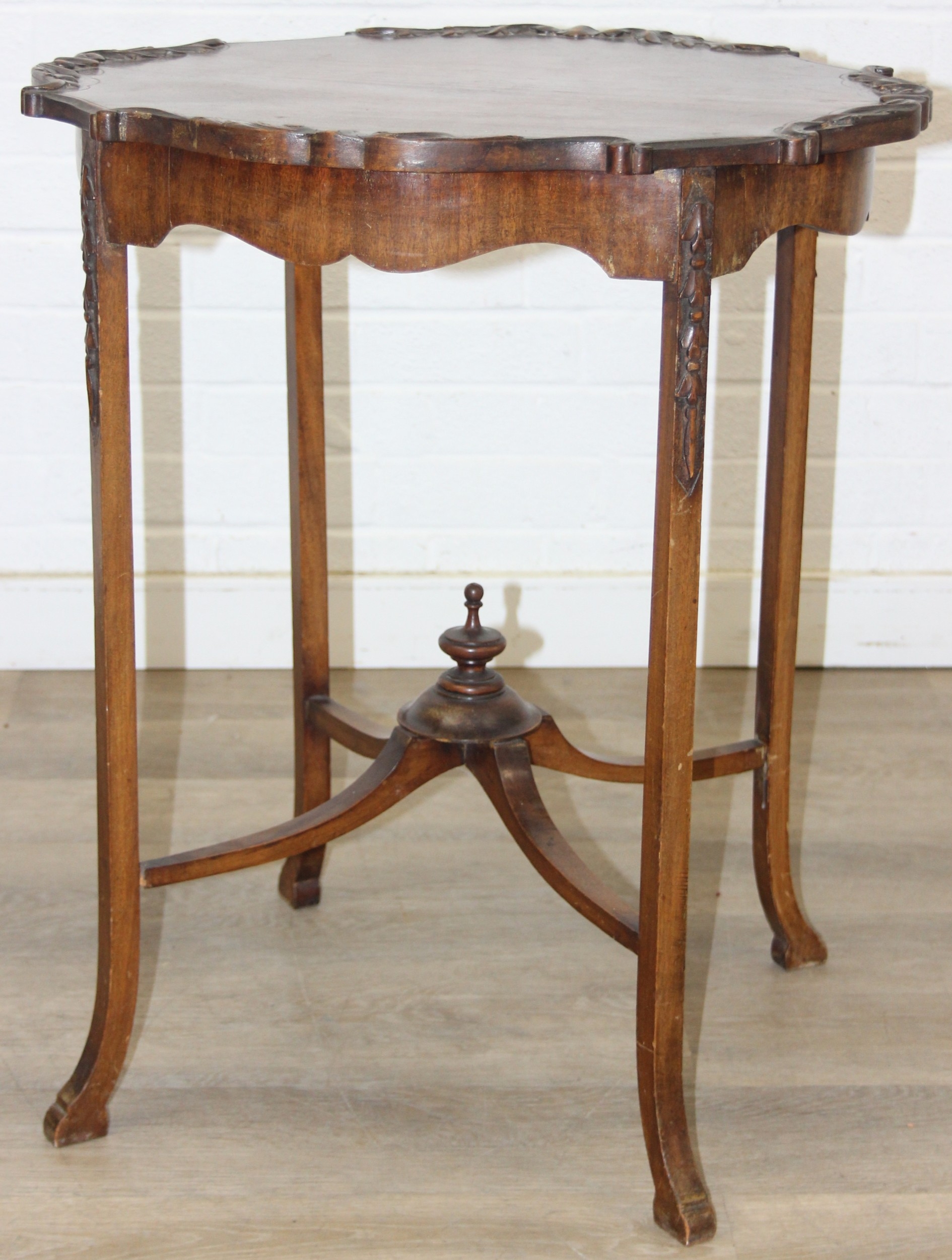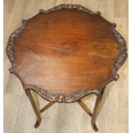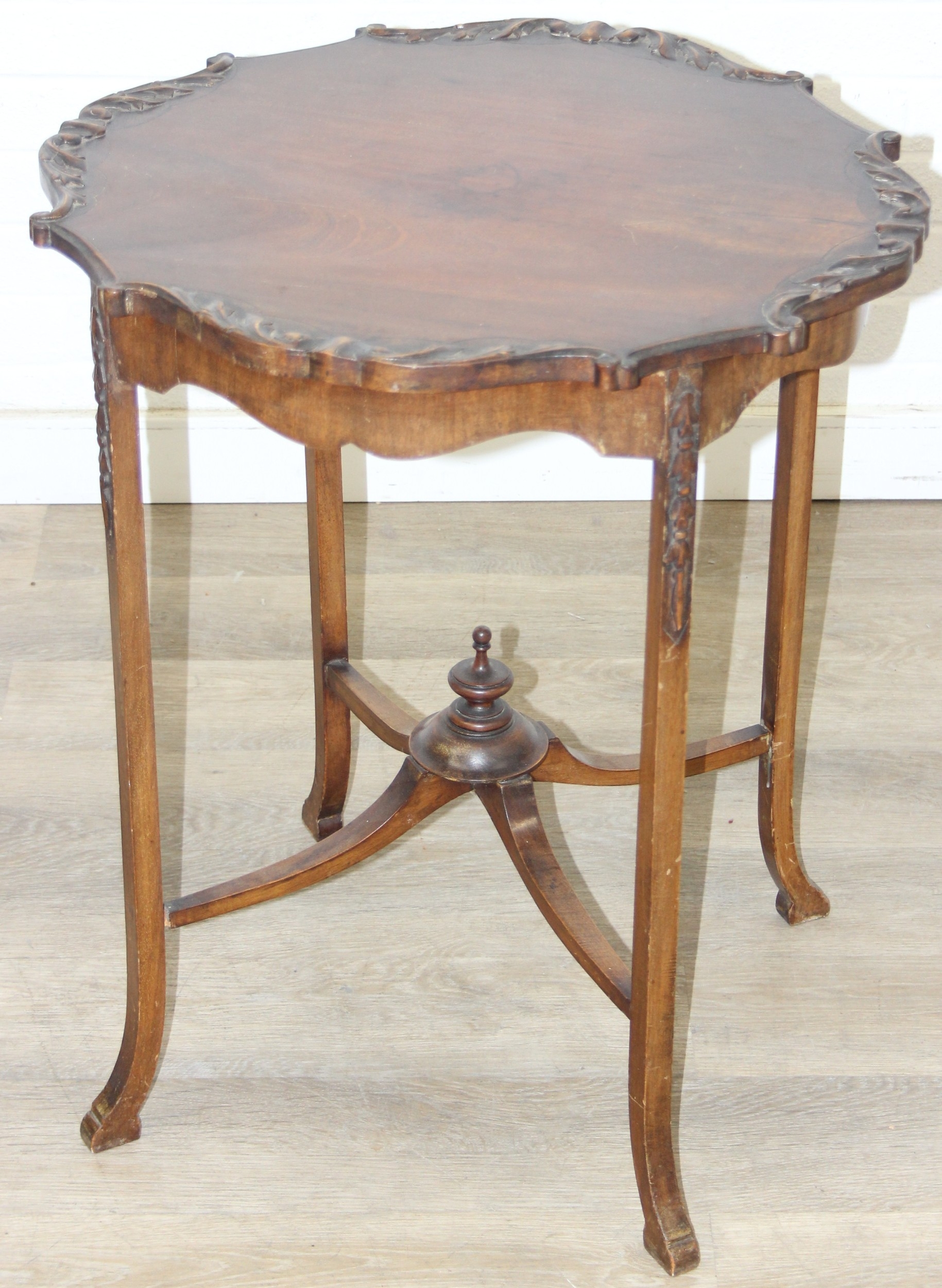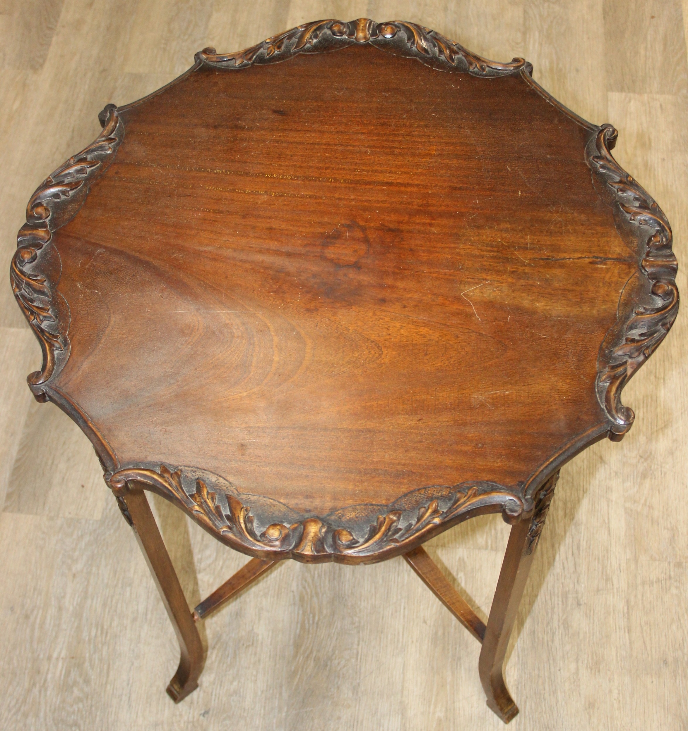 A vintage mahogany side table with decorative carved edge, standing on four thin splayed legs, 61cm in diameter x 71cm tall