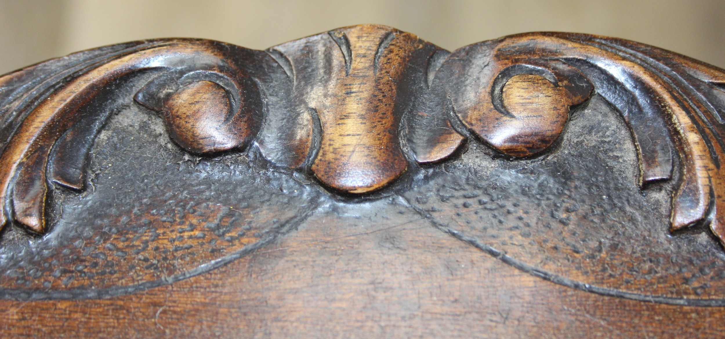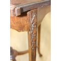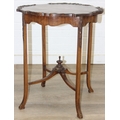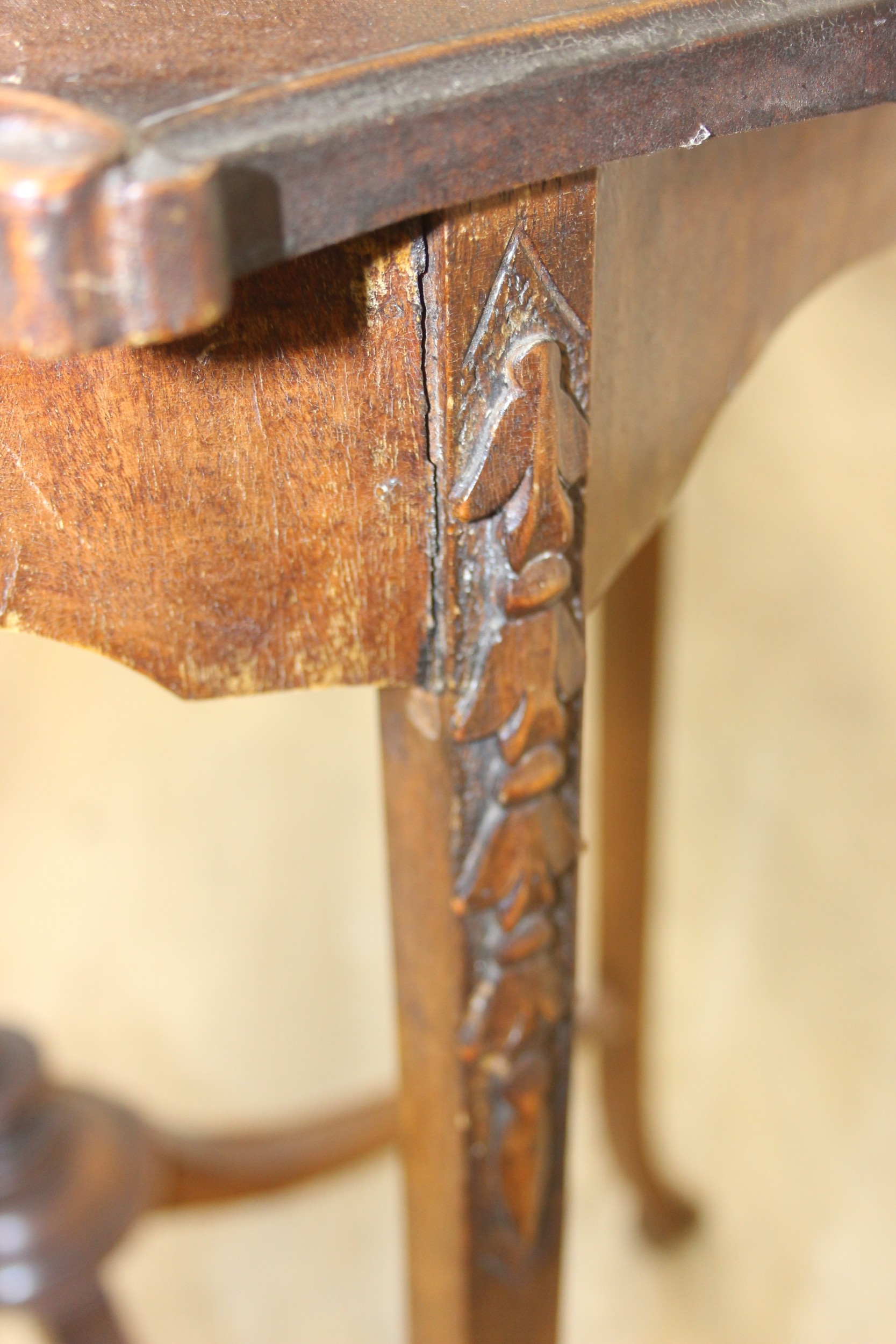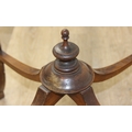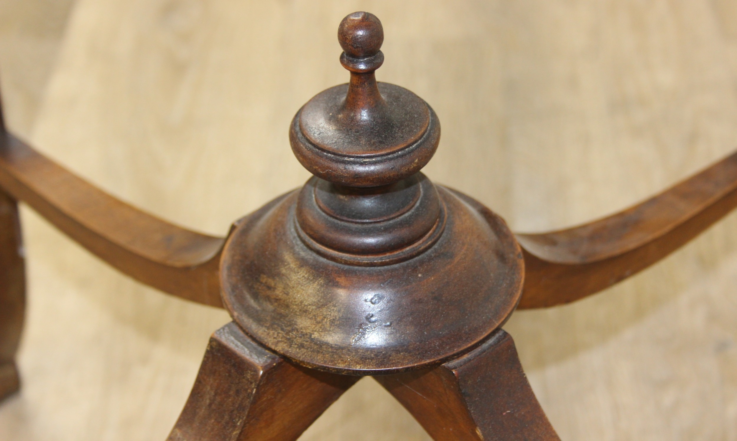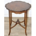 A vintage mahogany side table with decorative carved edge, standing on four thin splayed legs, 61cm in diameter x 71cm tall