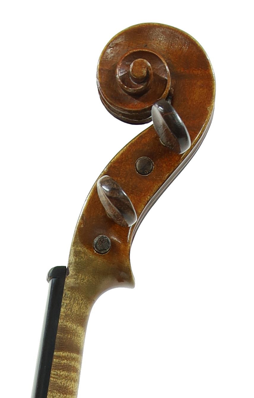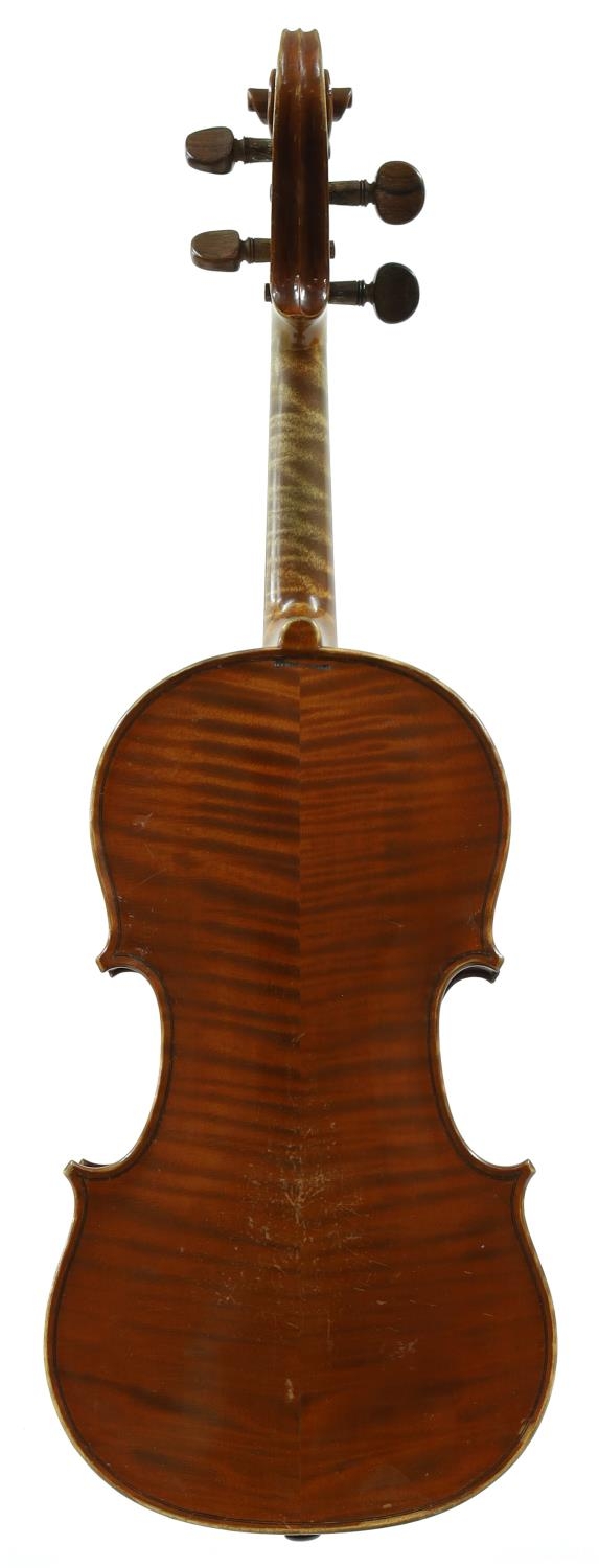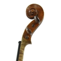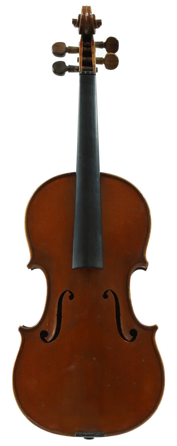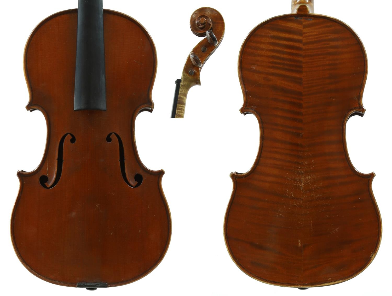 French violin labelled Gustave Villaume, Nancy, Annee 1943, no. 41; also stamped Gustave Villaume beneath the button, the two piece back of medium curl with similar wood to the sides and head, the table of a medium width grain and the varnish of a light reddish-brown colour on a golden ground, 14 1/8", 35.90cm