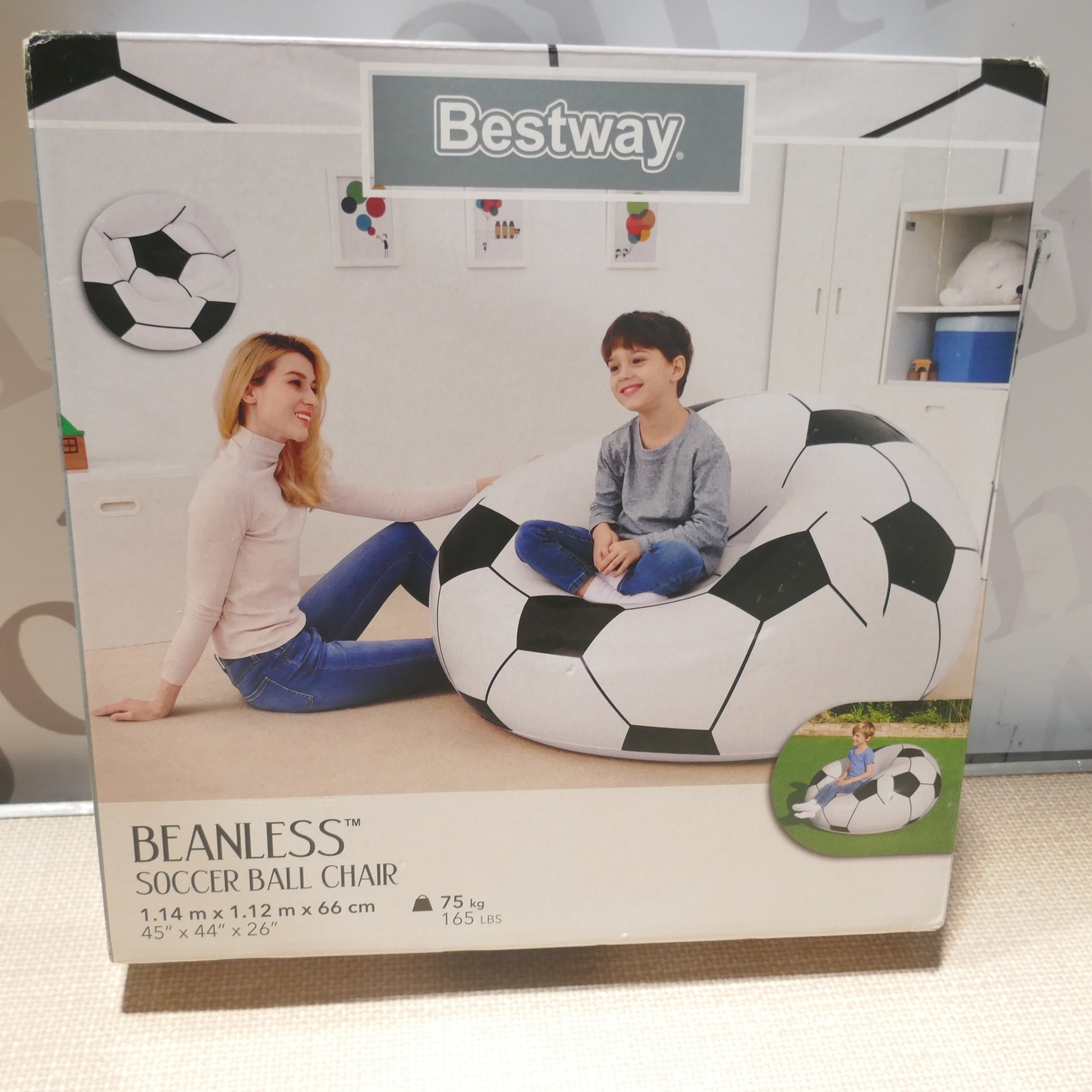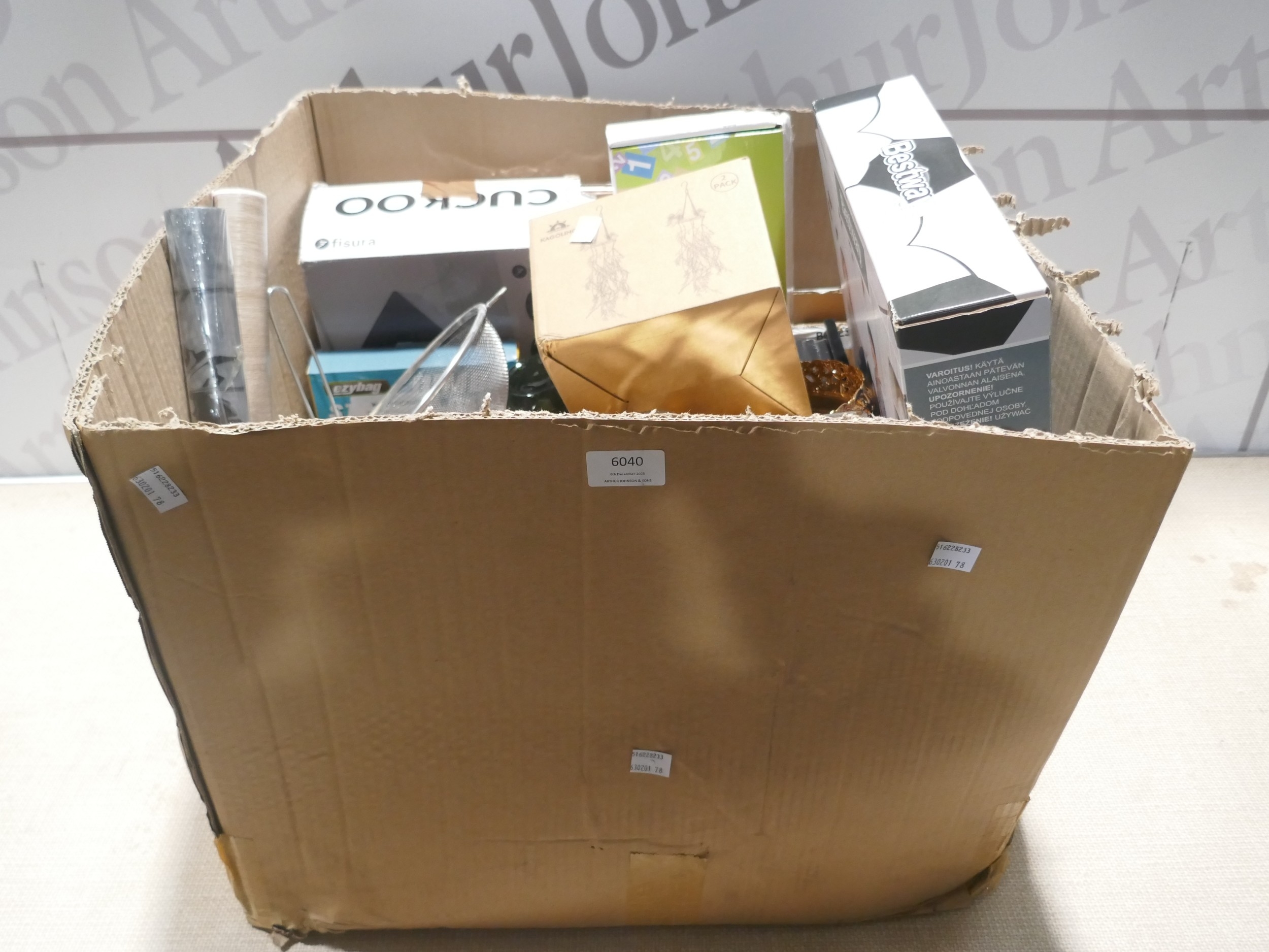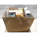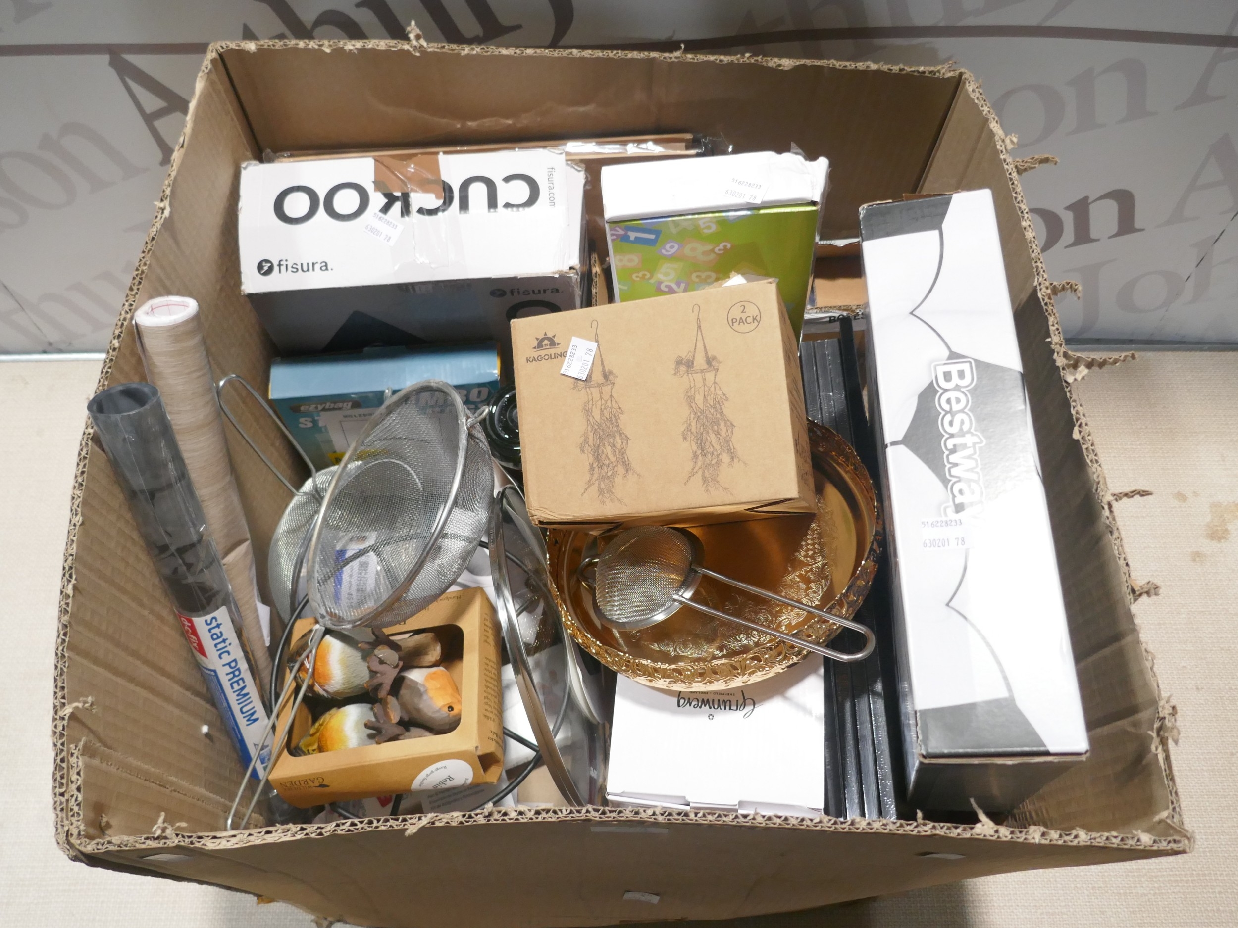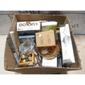 A box of miscellaneous items including blow up chair, cuckoo clock, trays, door wedge, glass jars, Jumbo bags, etc. * This lot is subject to VAT