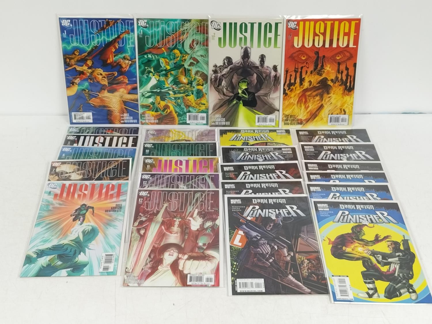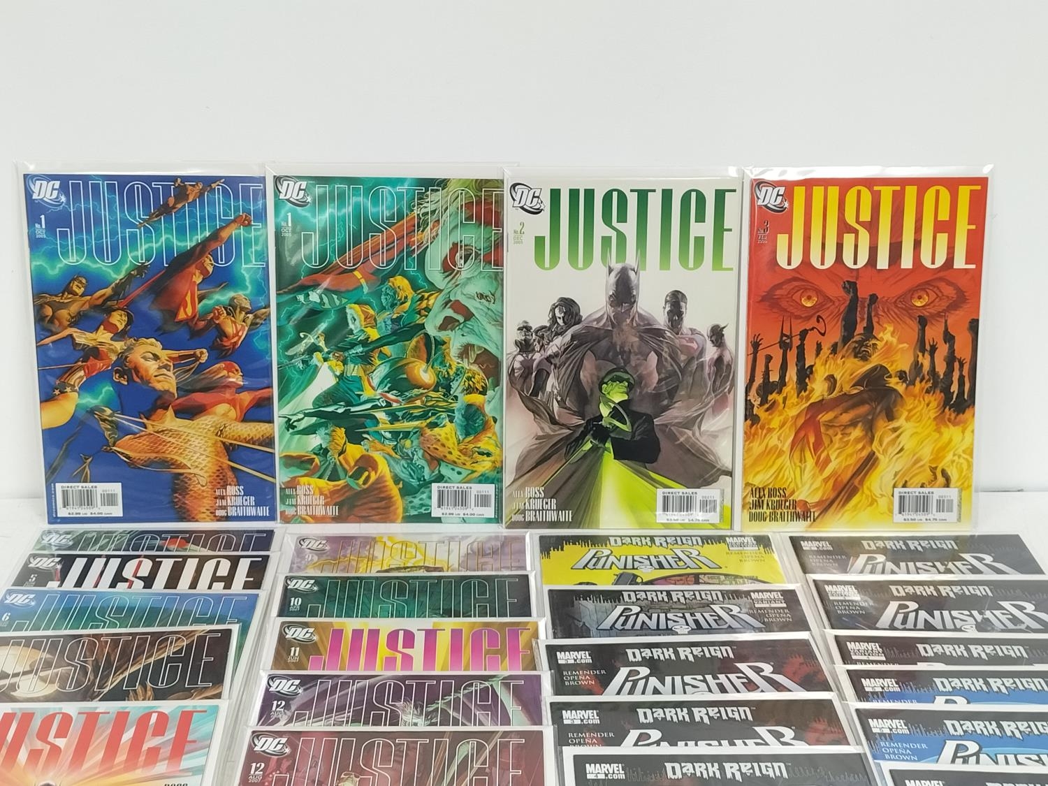DC Comics D.C.Justice 2005 Limited Run 1-12 Complete plus Marvel Punisher:Dark Reign 2009 Limited Run of 5 Nos 1 Variant, 2 Variant 2nd Print, 3x2, 4x2, 4x2 Variant, 5x2, 5 Variant. Bagged and Boarded