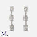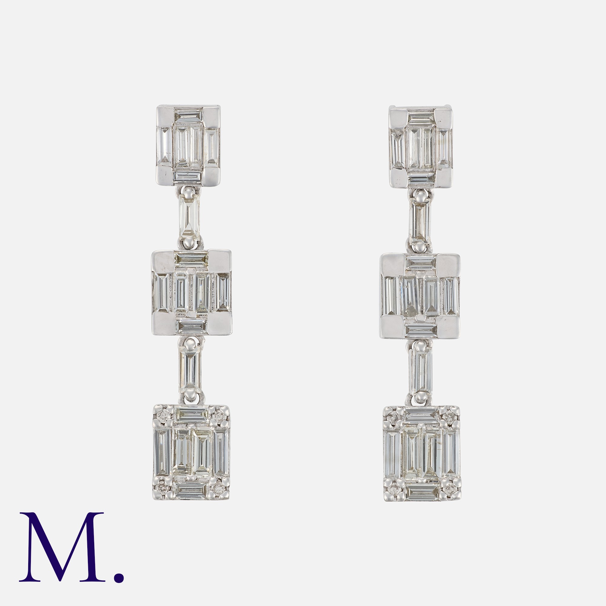 A Pair of Diamond Drop Earrings in white gold, set with baguette-cut diamonds weighing 1.3ct in total. Posts stamped K18WG indicating 18ct white gold.