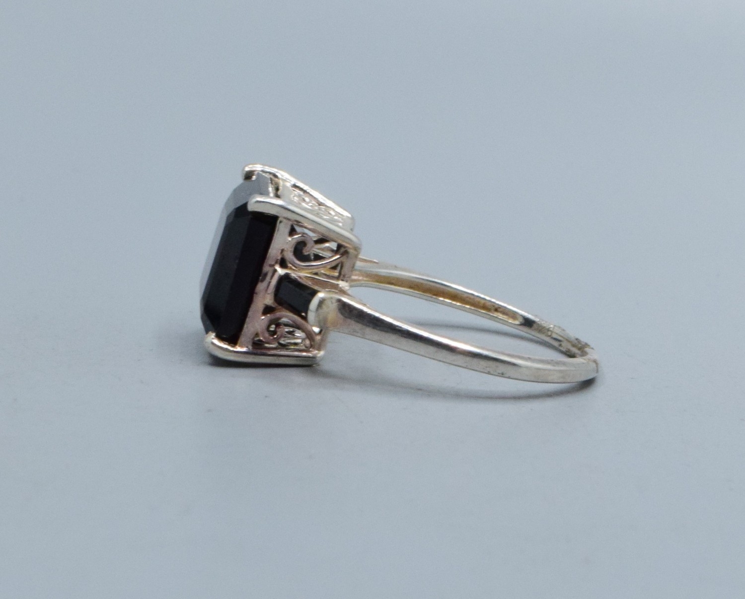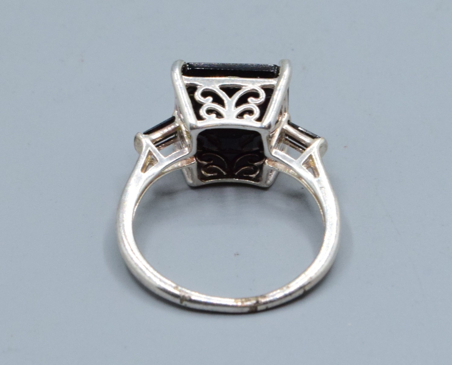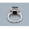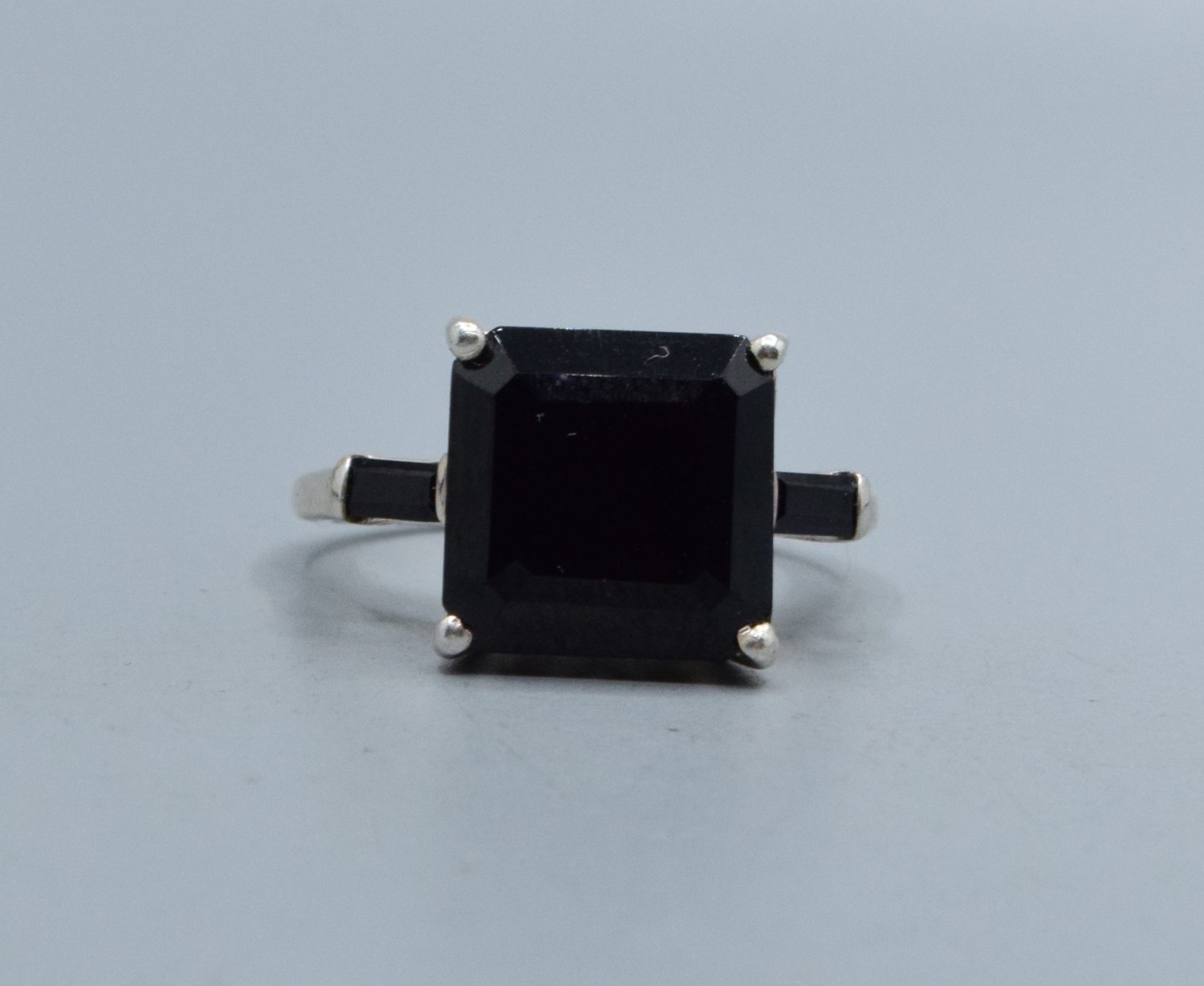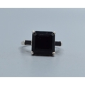 925 silver square shape black Agate ladies dress ring with the head measuring 11x11mm and held in a castle setting with side stone decoration size O