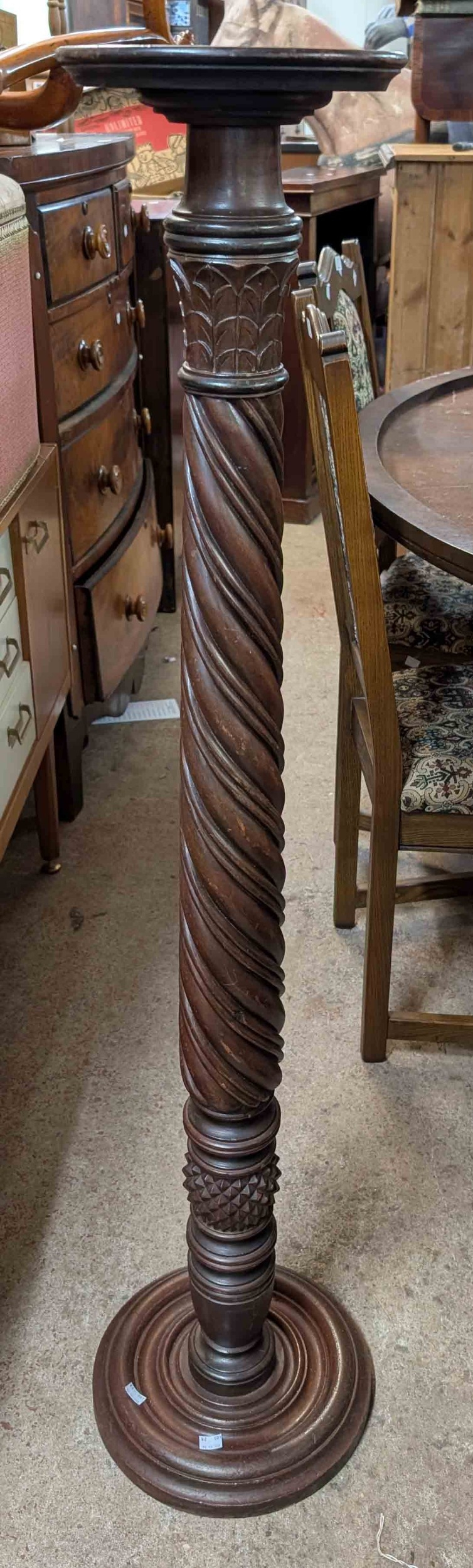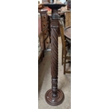 An old stained wood torchère with rope twist pillar and carved decoration, set on a circular base