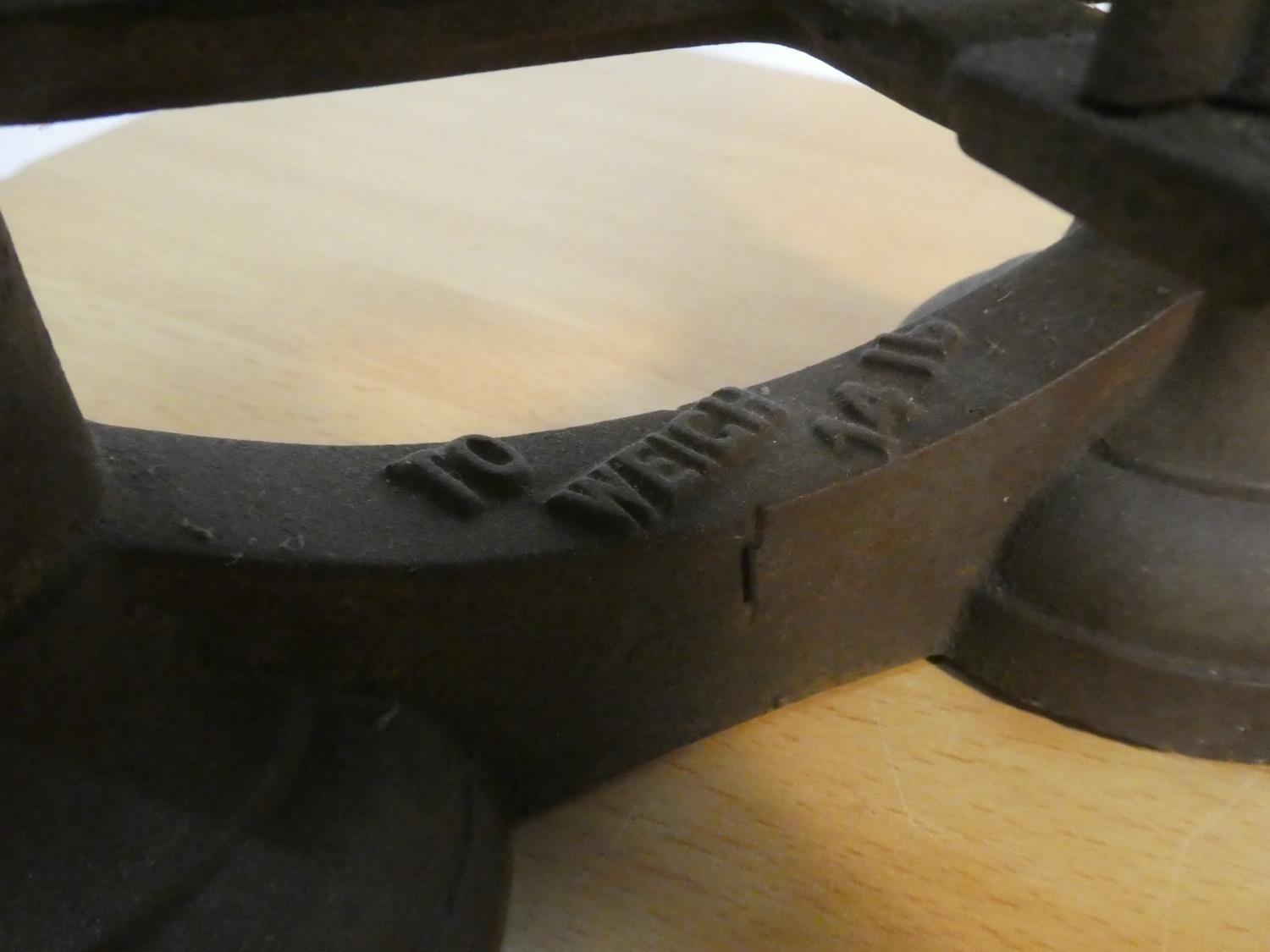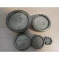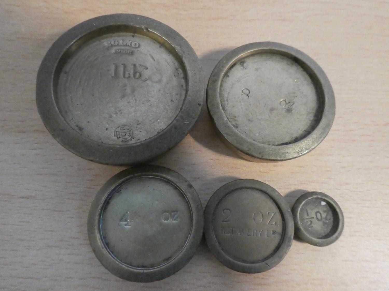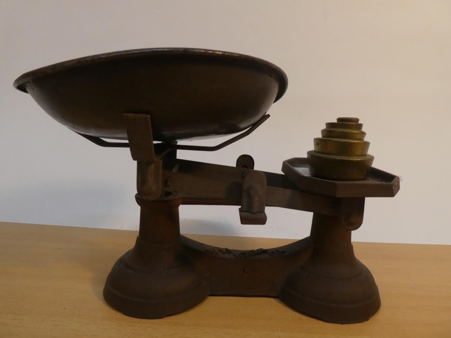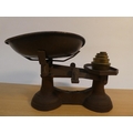 A set of antique kitchen scales and weights.
