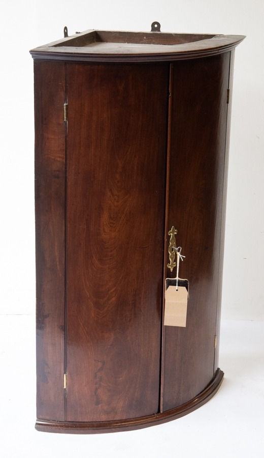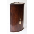 GEORGE III FIGURED MAHOGANY BOW FRONTED CORNER CUPBOARD, of typical form, the interior with three shelves and single spice drawer, 41” (104.1cm) high, 26 ¼” (66.7cm) wide