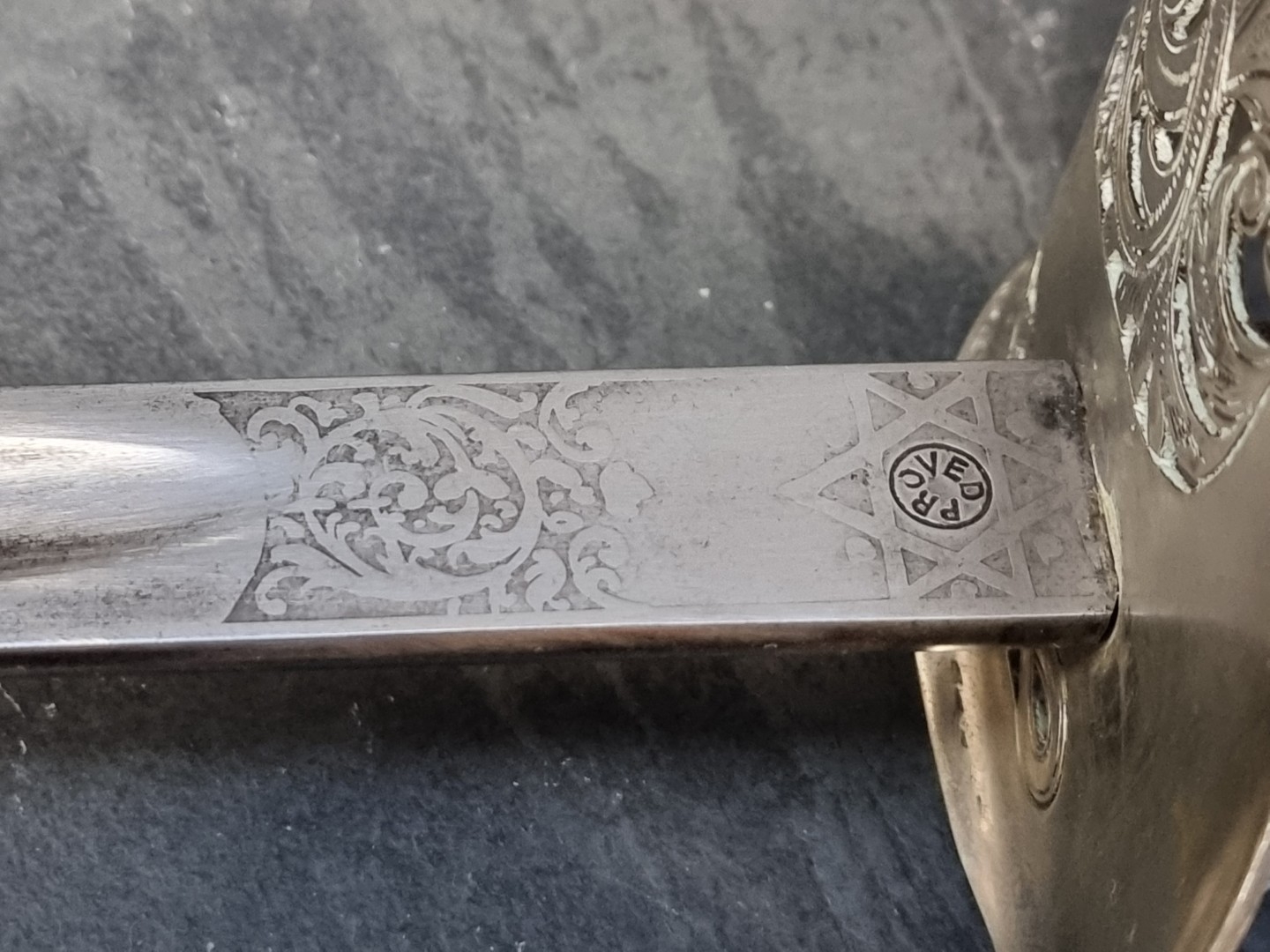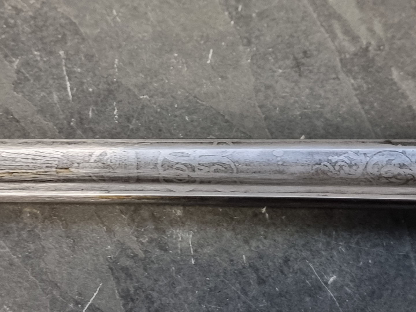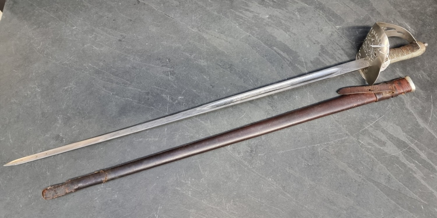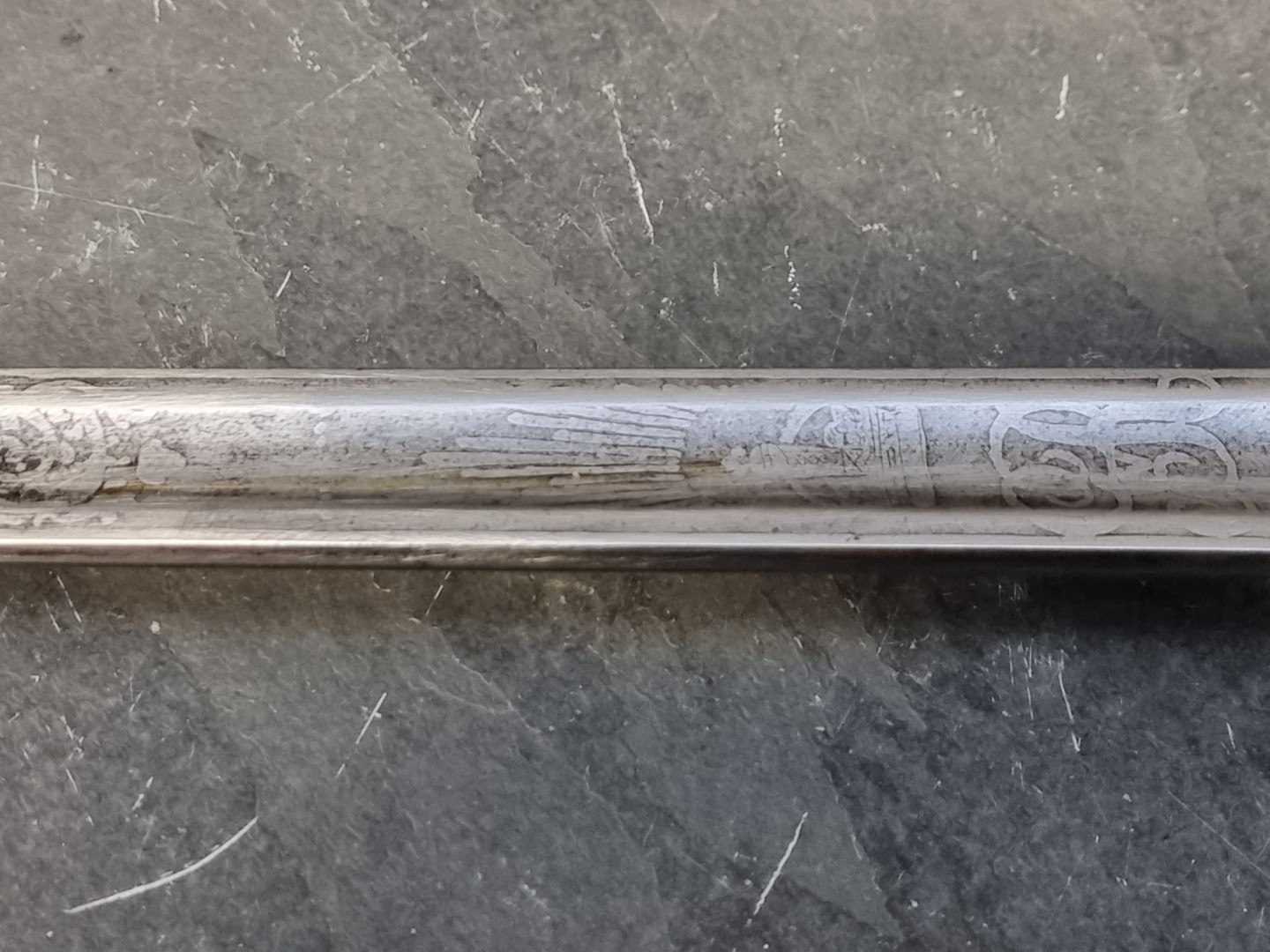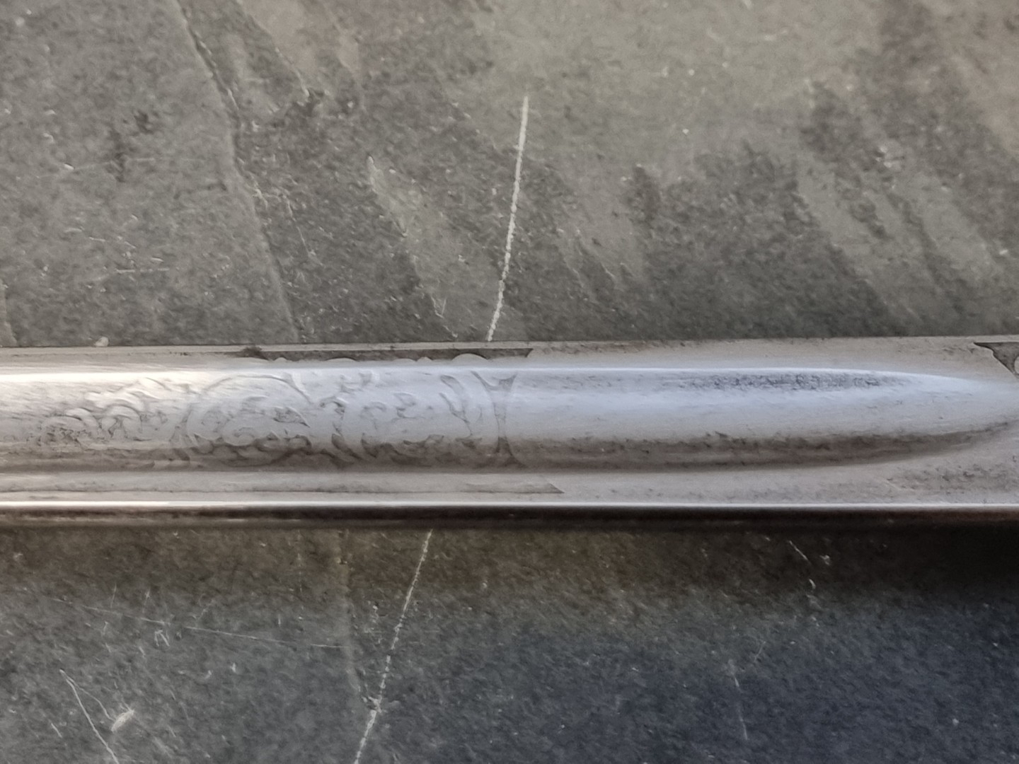 A British 1897 pattern infantry officers sword and scabbard, with 85cm etched blade.