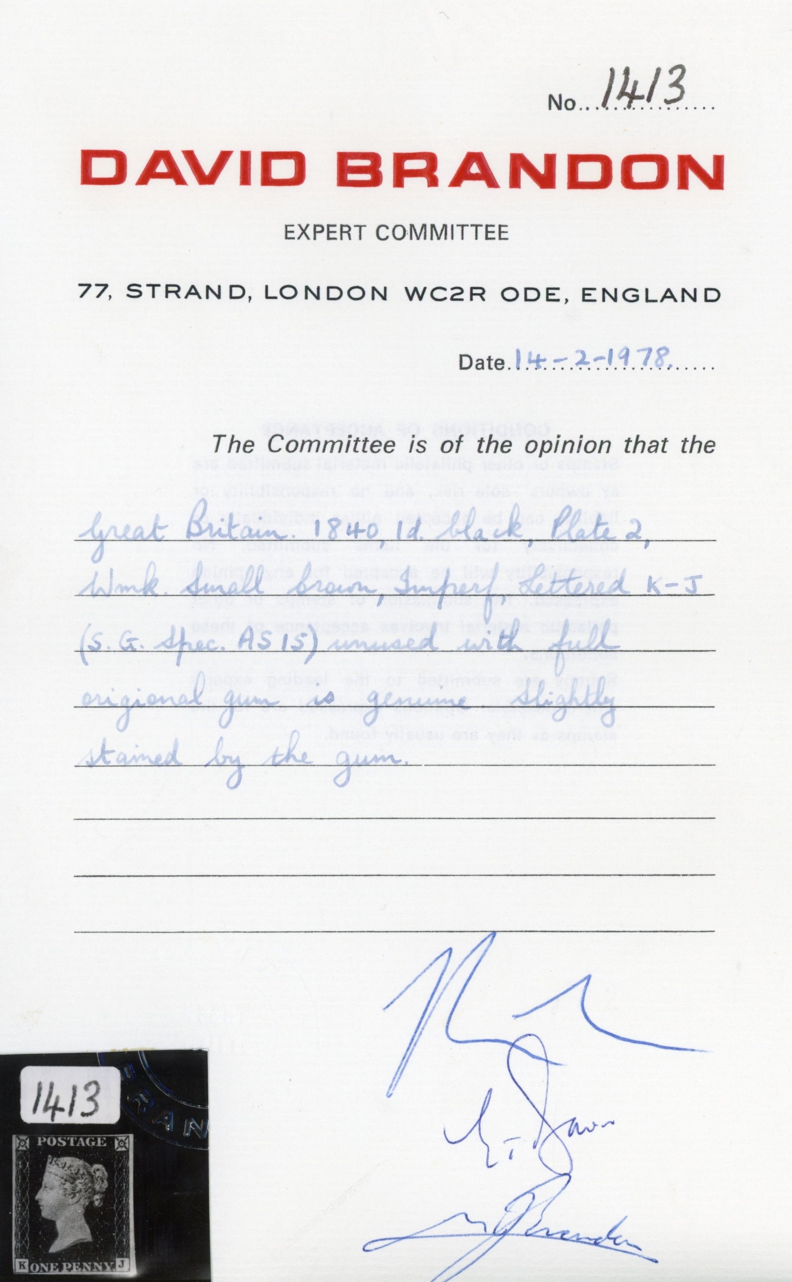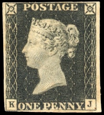 1840 1d black, Pl. 2 (KJ), mint, unmounted o.g., with four close to good margins. Slight gum toning, still a good example and scarce in this condition. Brandon cert (1978), SG 2, £7,500