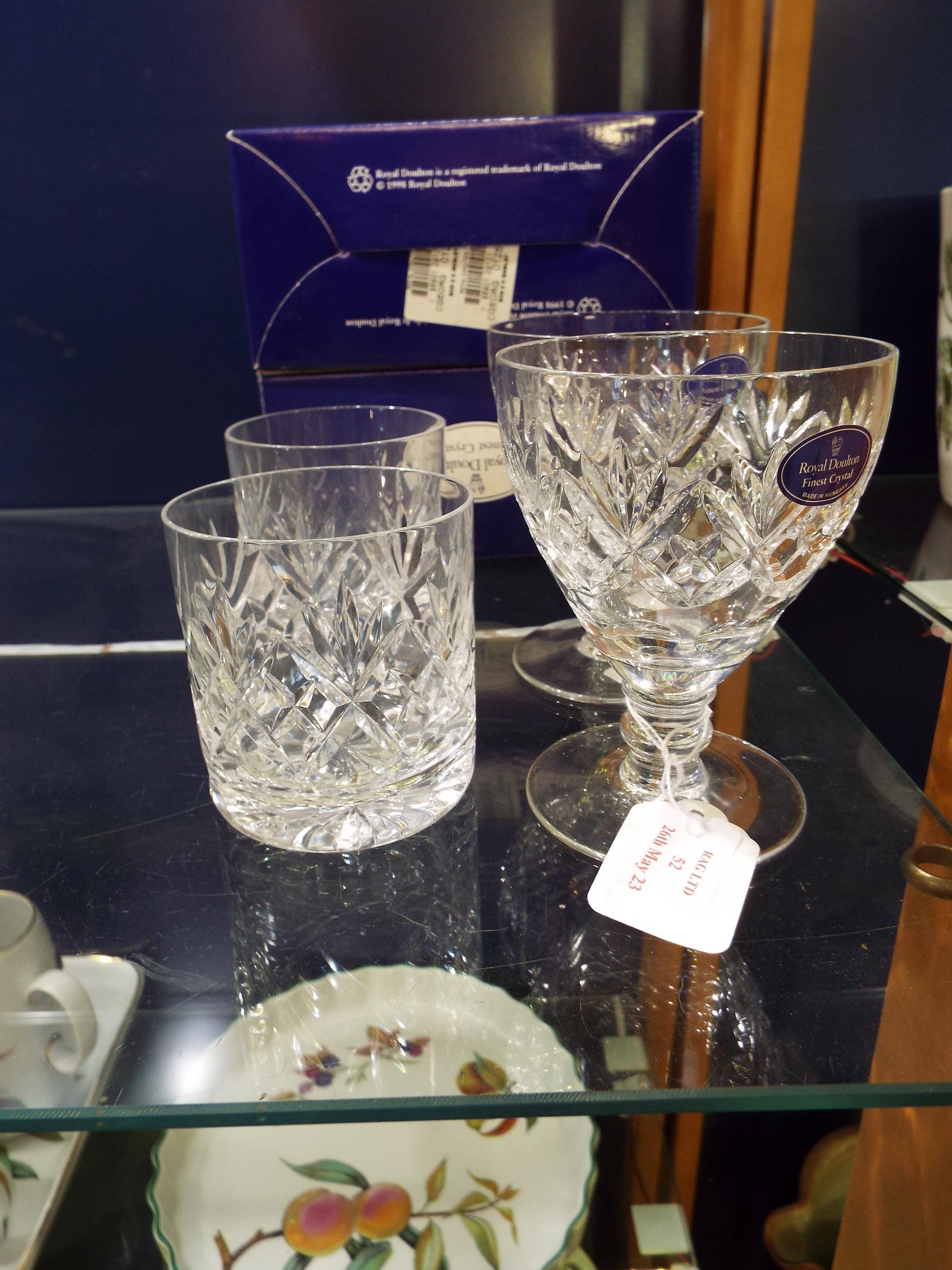 Two boxed Royal Doulton Finest Crystal tumblers together with two similar boxed goblets