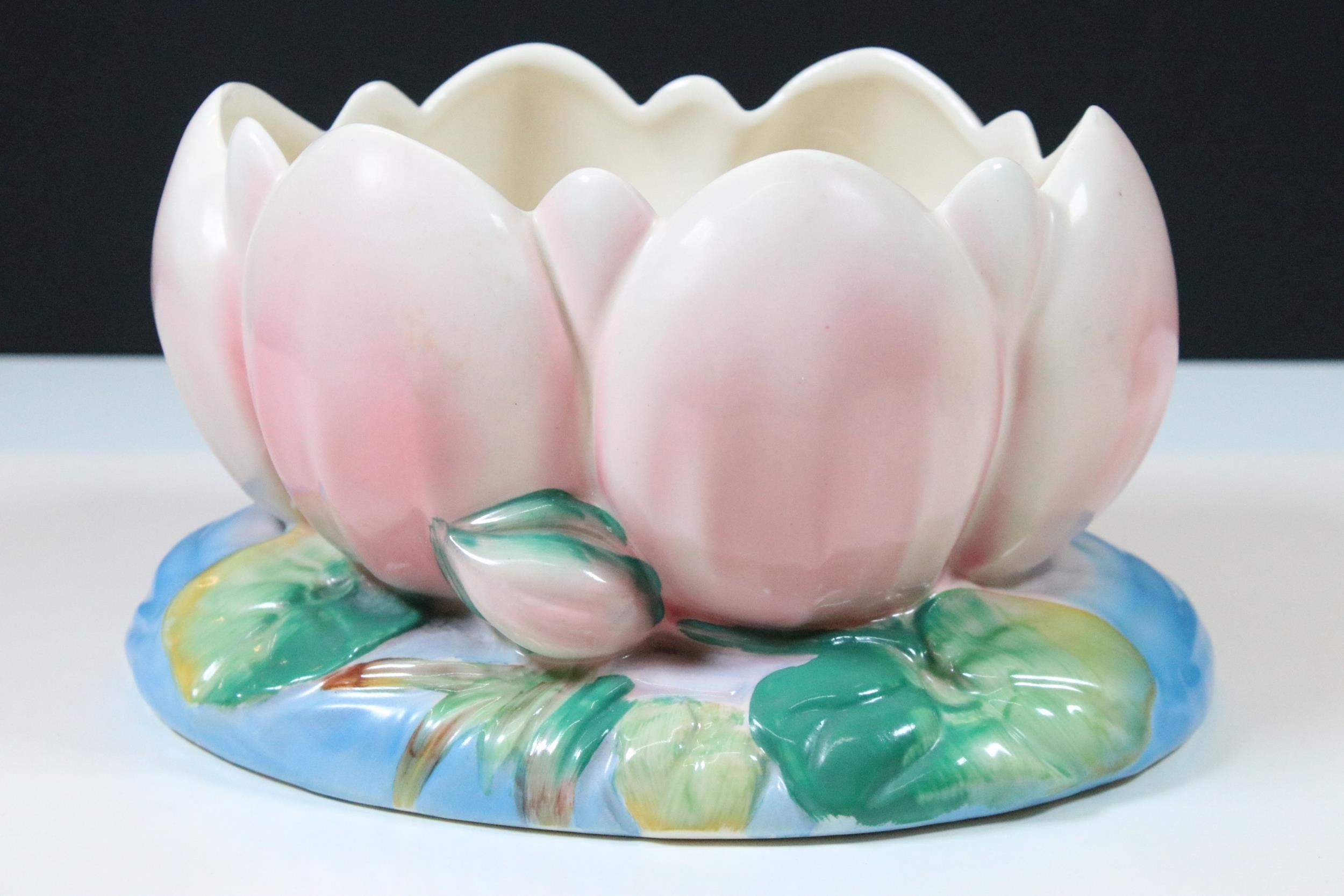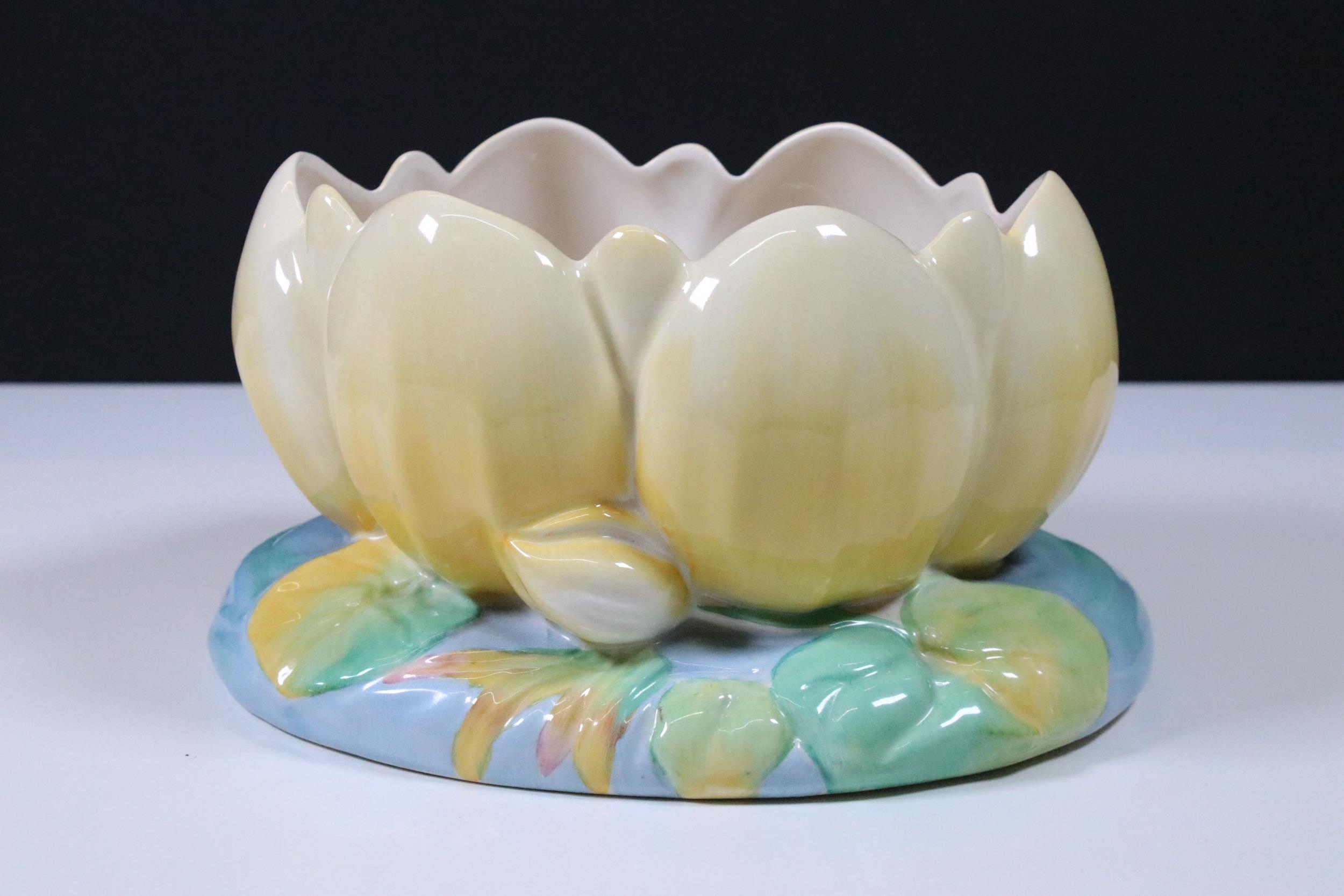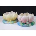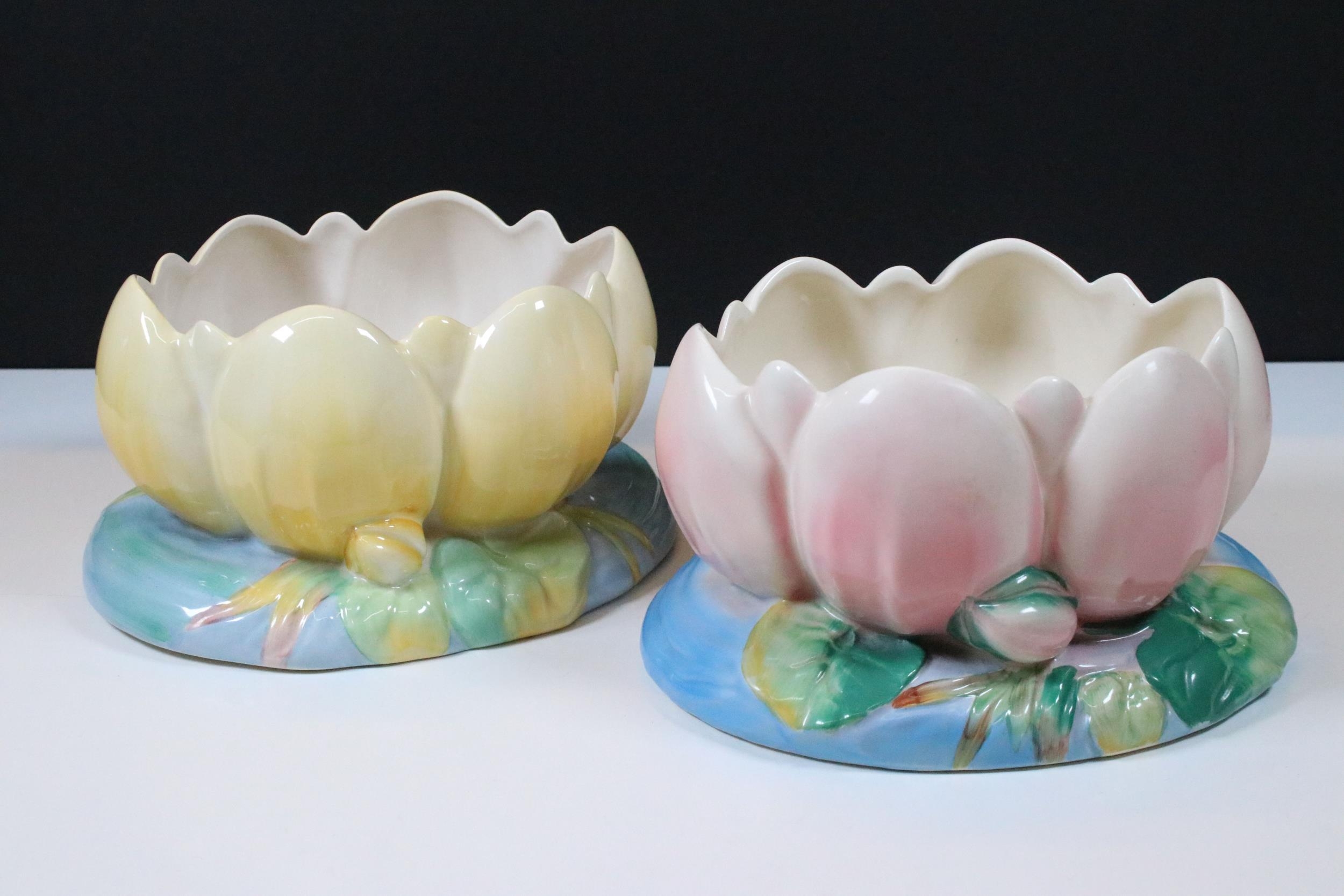 Pair of Clarice Cliff for Royal Staffordshire Ceramics Water Lily vases including one in a pink colourway and one in yellow. Measures 22cm wide.