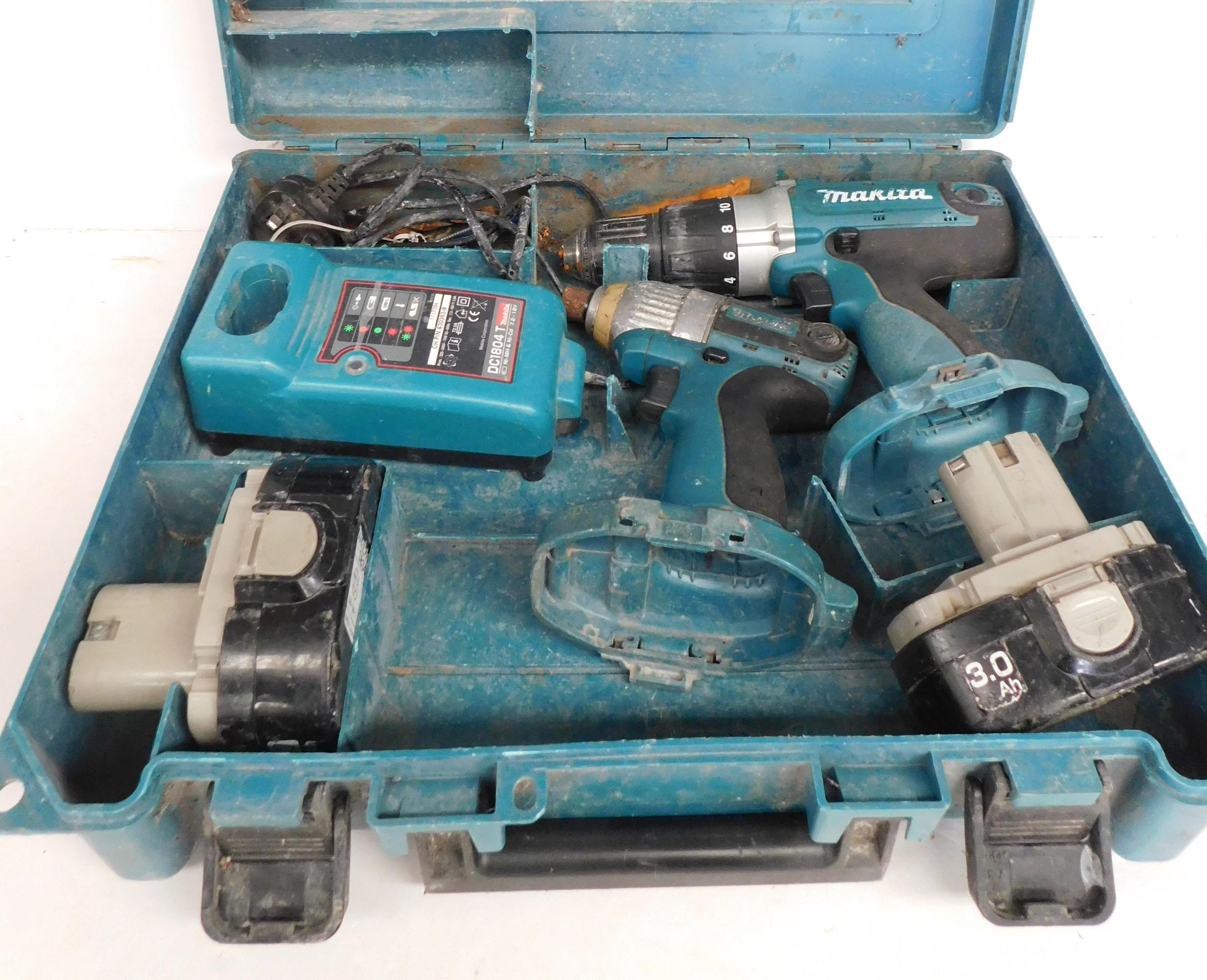 Makita drill set - drill and impact driver, two batteries, case and charger - unchecked