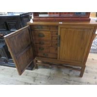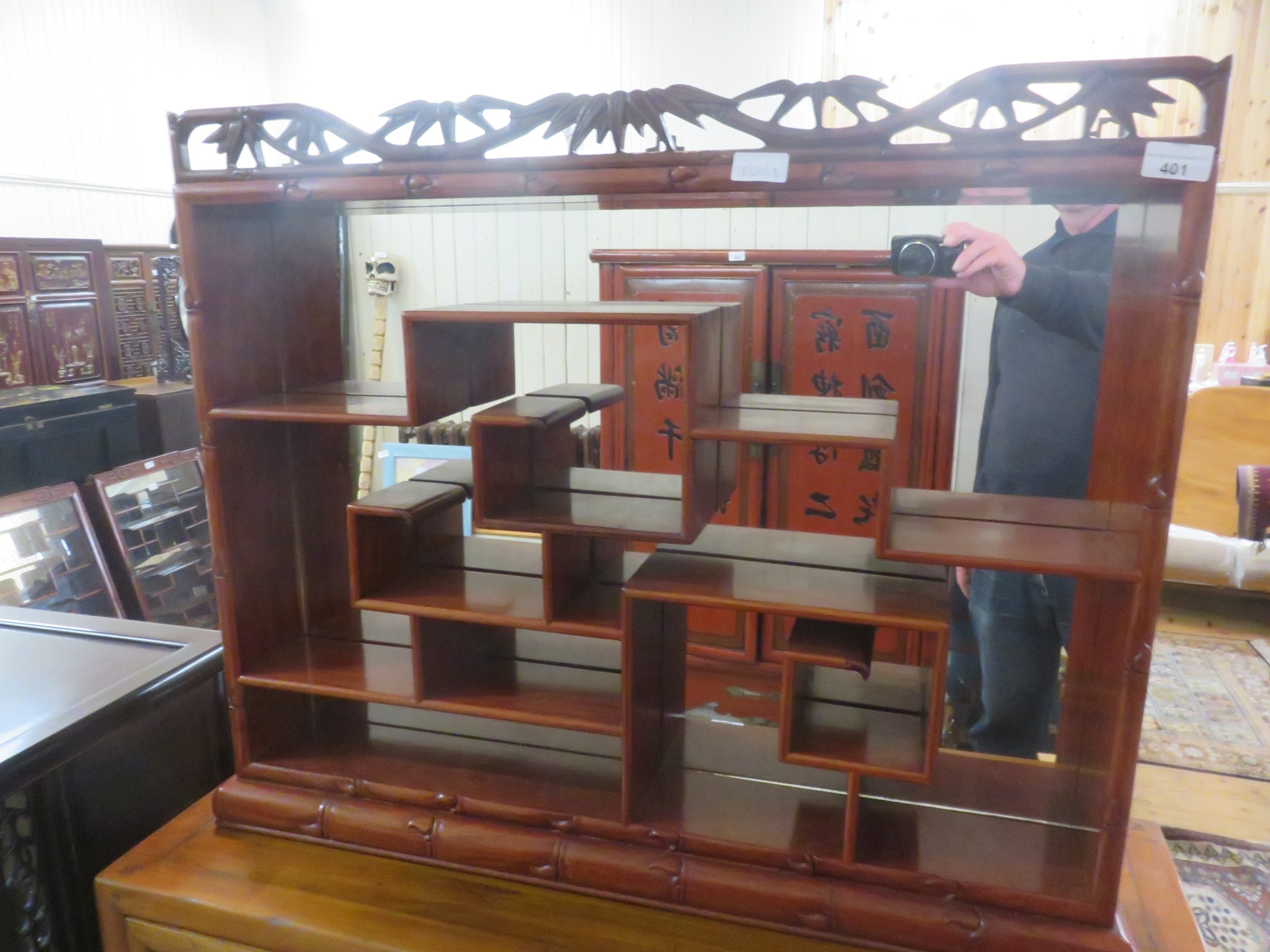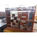 Chinese hardwood openwork display unit with mirror back, 80cm width by 66cm tall